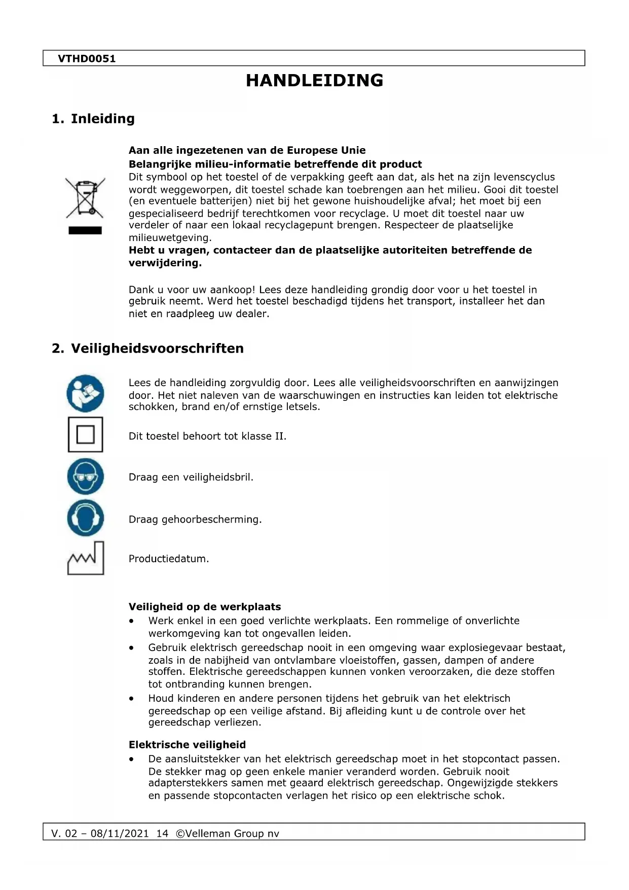 Download de handleiding voor uw Boor in PDF-formaat gratis! Vind uw handleiding VTHD0051 - VELLEMAN en neem uw elektronisch apparaat weer in handen. Op deze pagina staan alle documenten die nodig zijn voor het gebruik van uw apparaat. VTHD0051 van het merk VELLEMAN.