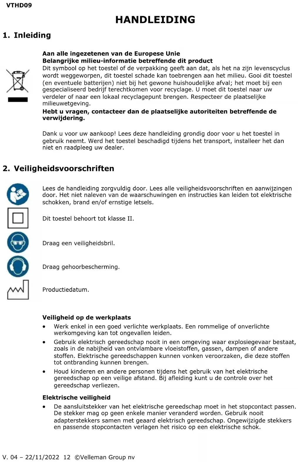 Download de handleiding voor uw Boor in PDF-formaat gratis! Vind uw handleiding VTHD09 - VELLEMAN en neem uw elektronisch apparaat weer in handen. Op deze pagina staan alle documenten die nodig zijn voor het gebruik van uw apparaat. VTHD09 van het merk VELLEMAN.