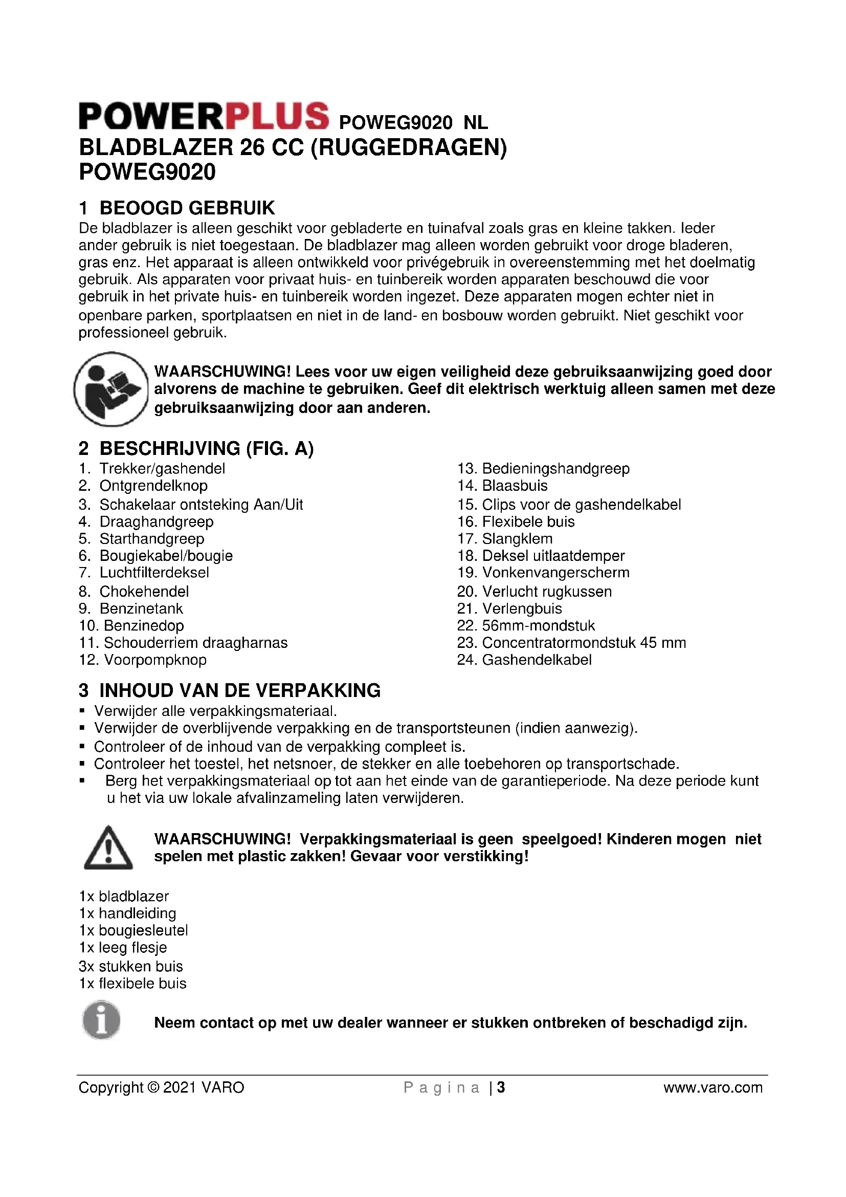 - Berg het verpakkingsmateriaal op tot aan het einde van de garantieperiode. Na deze periode kunt u het via uw lokale afvalinzameling laten verwijderen. WAARSCHUWING! Verpakkingsmateriaal is geen speelgoed! Kinderen mogen niet spelen met plastic zakken! Gevaar voor verstikking! 1x bladblazer 1x handleiding 1x bougiesleutel 1x leeg flesje 3x stukken buis 1x flexibele buis Neem contact op met uw dealer wanneer er stukken ontbreken of beschadigd zijn.POWEG9020 NL Copyright © 2021 VARO P a g i n a | 4 www.varo.com