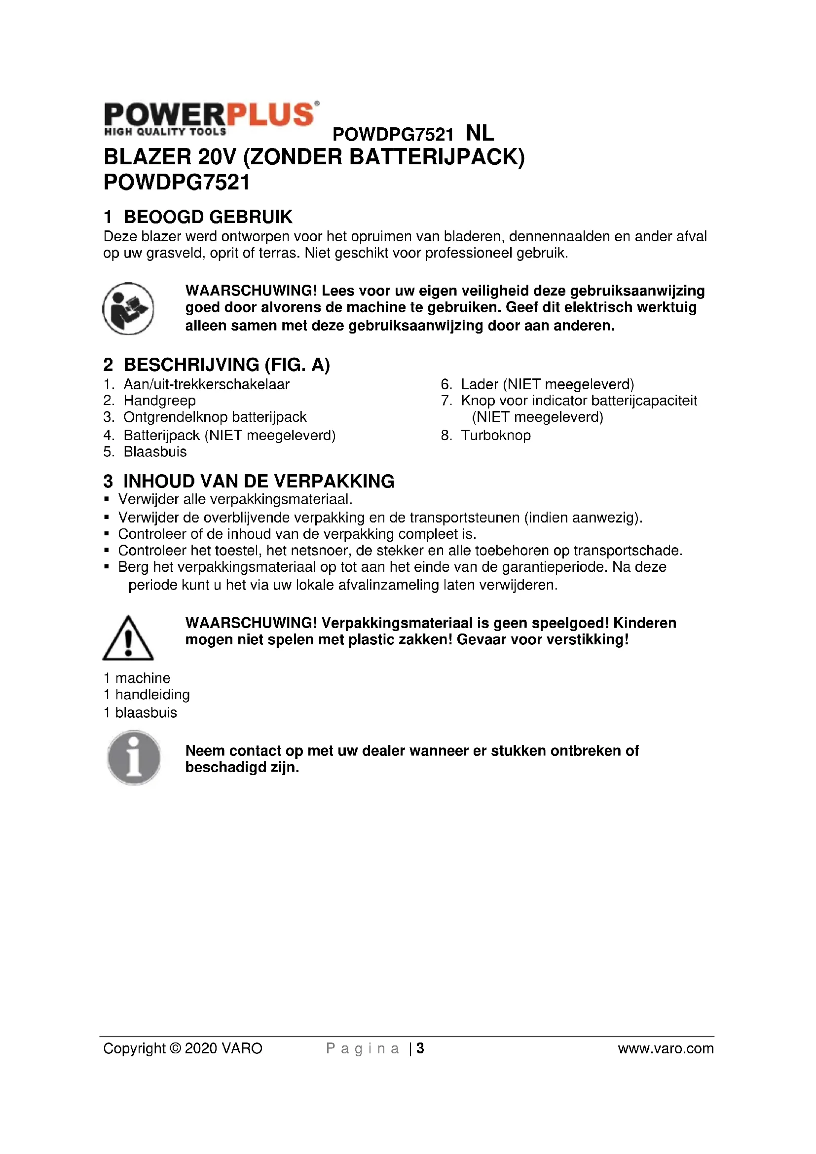 - Berg het verpakkingsmateriaal op tot aan het einde van de garantieperiode. Na deze periode kunt u het via uw lokale afvalinzameling laten verwijderen. WAARSCHUWING! Verpakkingsmateriaal is geen speelgoed! Kinderen mogen niet spelen met plastic zakken! Gevaar voor verstikking! 1 machine 1 handleiding 1 blaasbuis Neem contact op met uw dealer wanneer er stukken ontbreken of beschadigd zijn.POWDPG7521 NL Copyright © 2020 VARO P a g i n a | 4 www.varo.com