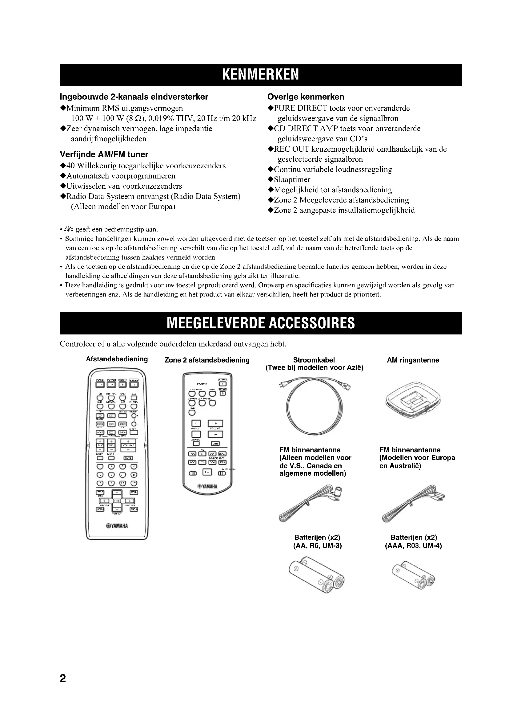 Ingebouwde 2-kanaals eindversterker ◆ Minimum RMS uitgangsvermogen 100 W + 100 W (8 Ω), 0,019% THV, 20 Hz t/m 20 kHz ◆ Zeer dynamisch vermogen, lage impedantie aandrijfmogelijkheden Verfijnde AM/FM tuner ◆ 40 Willekeurig toegankelijke voorkeuzezenders ◆ Automatisch voorprogrammeren ◆ Uitwisselen van voorkeuzezenders ◆ Radio Data Systeem ontvangst (Radio Data System) (Alleen modellen voor Europa) Overige kenmerken ◆ PURE DIRECT toets voor onveranderde geluidsweergave van de signaalbron ◆ CD DIRECT AMP toets voor onveranderde geluidsweergave van CD’s ◆ REC OUT keuzemogelijkheid onafhankelijk van de geselecteerde signaalbron ◆ Continu variabele loudnessregeling ◆ Slaaptimer ◆ Mogelijkheid tot afstandsbediening ◆ Zone 2 Meegeleverde afstandsbediening ◆ Zone 2 aangepaste installatiemogelijkheid