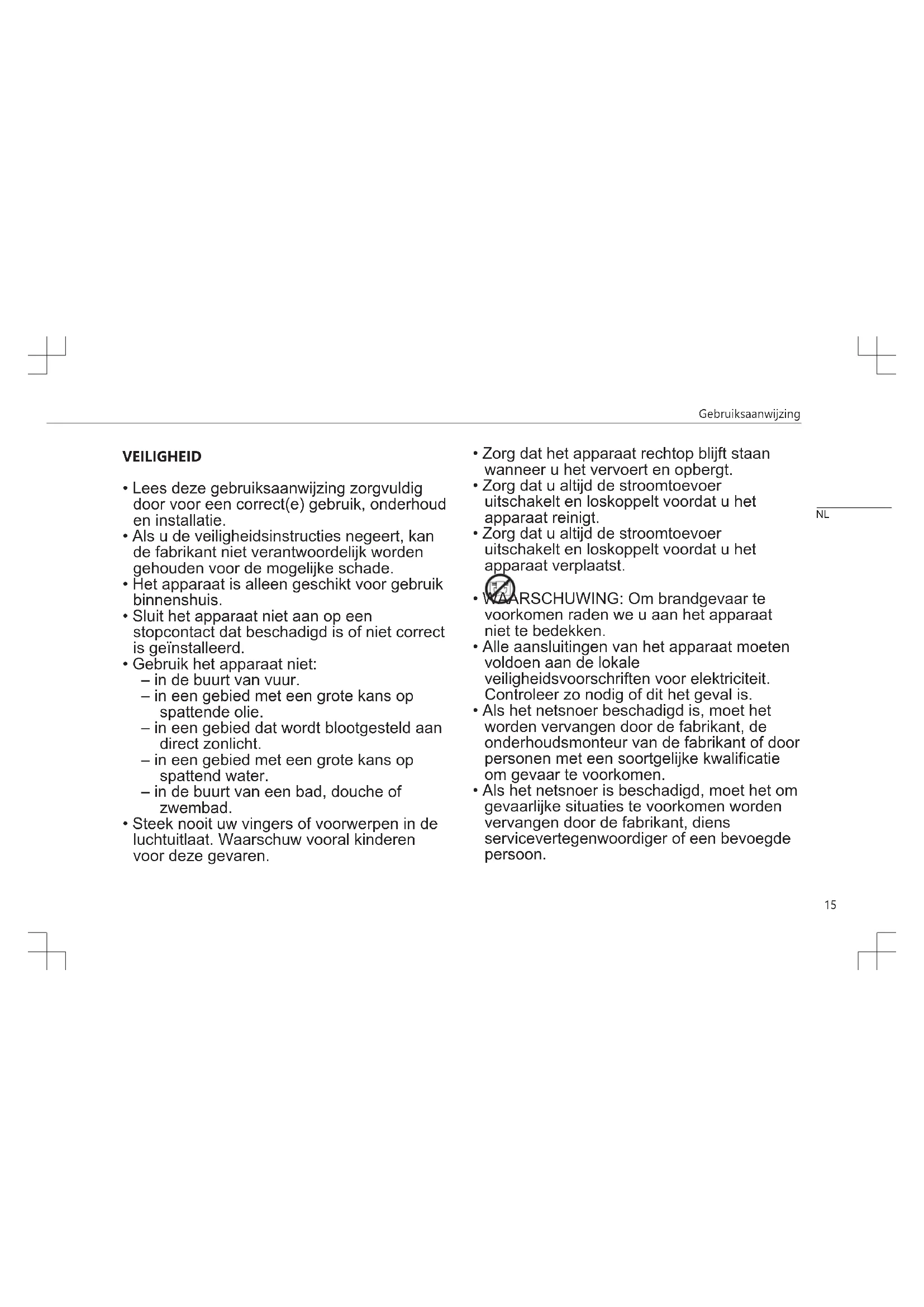 - Als het netsnoer is beschadigd, moet het om gevaarlijke situaties te voorkomen worden vervangen door de fabrikant, diens servicevertegenwoordiger of een bevoegde persoon. NLGebruiksaanwijzing