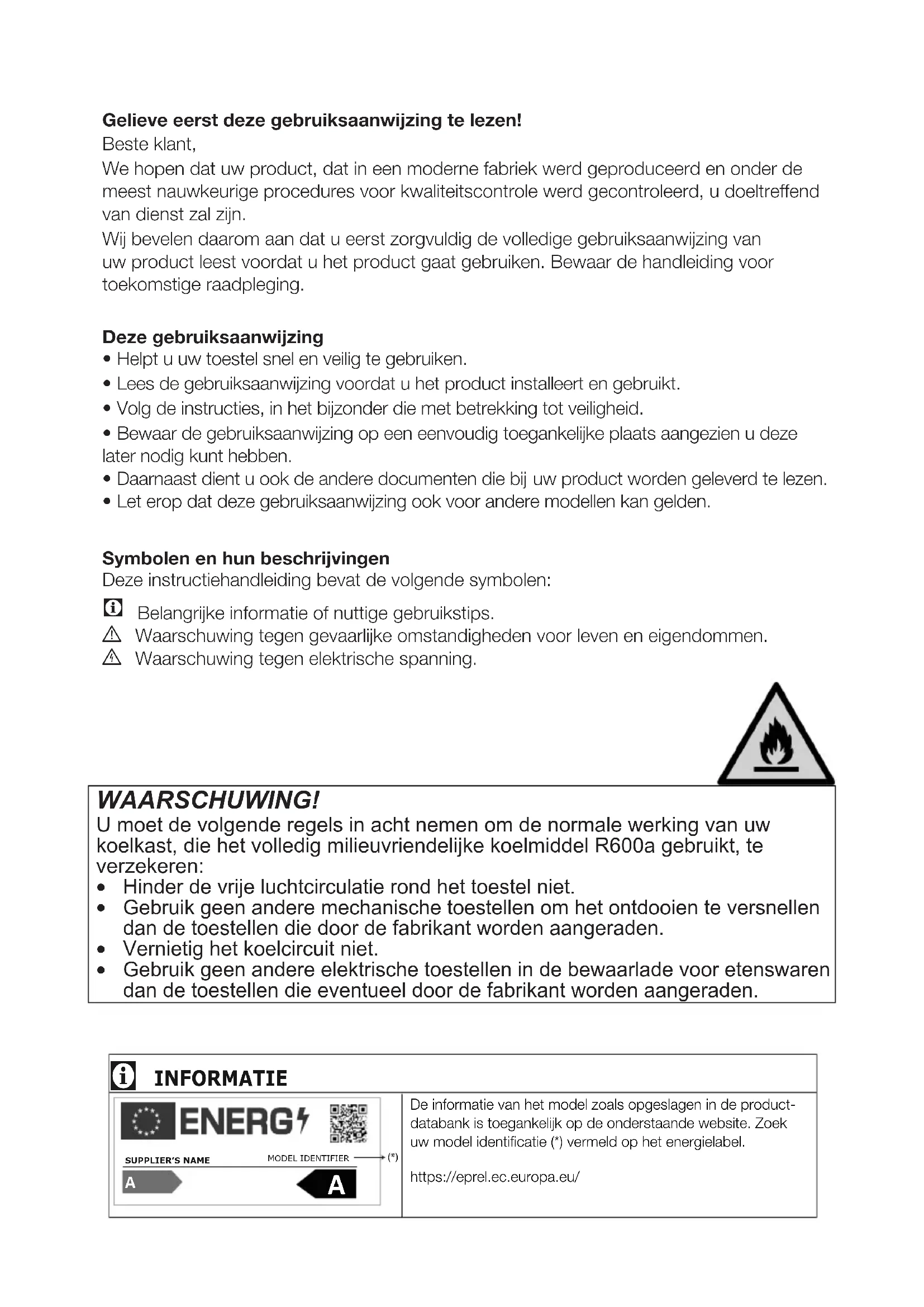 Belangrijke informatie of nuttige gebruikstips. A Waarschuwing tegen gevaarlijke omstandigheden voor leven en eigendommen. B Waarschuwing tegen elektrische spanning. WAARSCHUWING! U moet de volgende regels in acht nemen om de normale werking van uw koelkast, die het volledig milieuvriendelijke koelmiddel R600a gebruikt, te verzekeren: