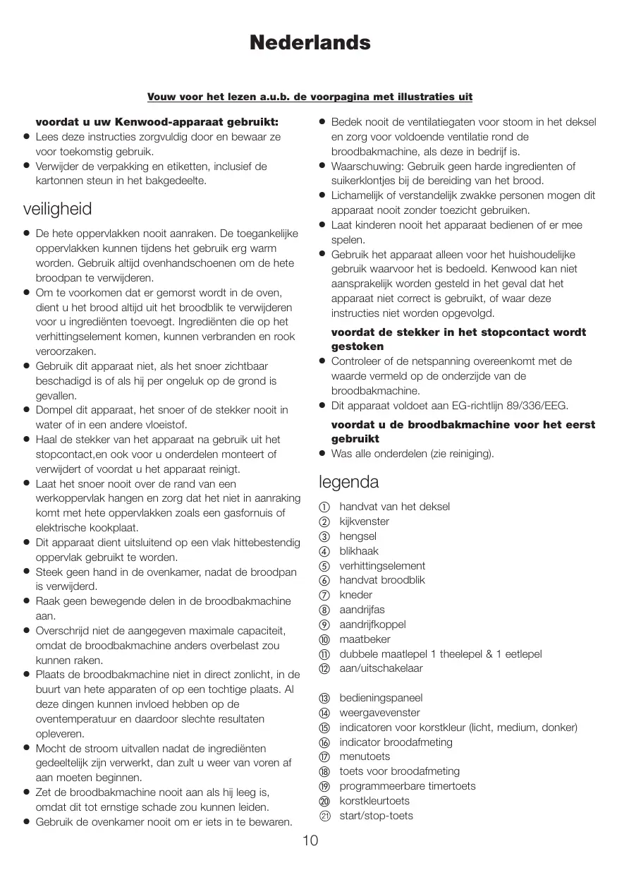 KORSTKLEUR te drukken tot de indicator op de gewenste korstkleur staat (licht, medium, donker). Druk op de START-toets . Om het programma te stoppen of te annuleren, drukt u gedurende 2 à 3 seconden op de START/STOP-toets. Na afloop van de bakcyclus dient u de stekker van de broodmachine uit het stopcontact te halen. Gebruik de bijgeleverde haak om het handvat van het blik op te tillen. Verwijder het broodblik door het handvat vast te pakken en het blik in de richting van de achterkant van de machine te draaien. Het handvat van het blik is heet: gebruik dus altijd ovenhandschoenen. Keer het blik om en leg het brood op een rooster om af te koelen. Ne laissez pas les personnes handicapées se servir de l'appareil sans surveillance. Ne laissez pas les enfants jouer avec l’appareil ni l’utiliser. N’employez l’appareil qu’à la fin domestique prévue. Kenwood décline toute responsabilité dans les cas où l’appareil est utilisé incorrectement ou que les présentes instructions ne sont pas respectées.
