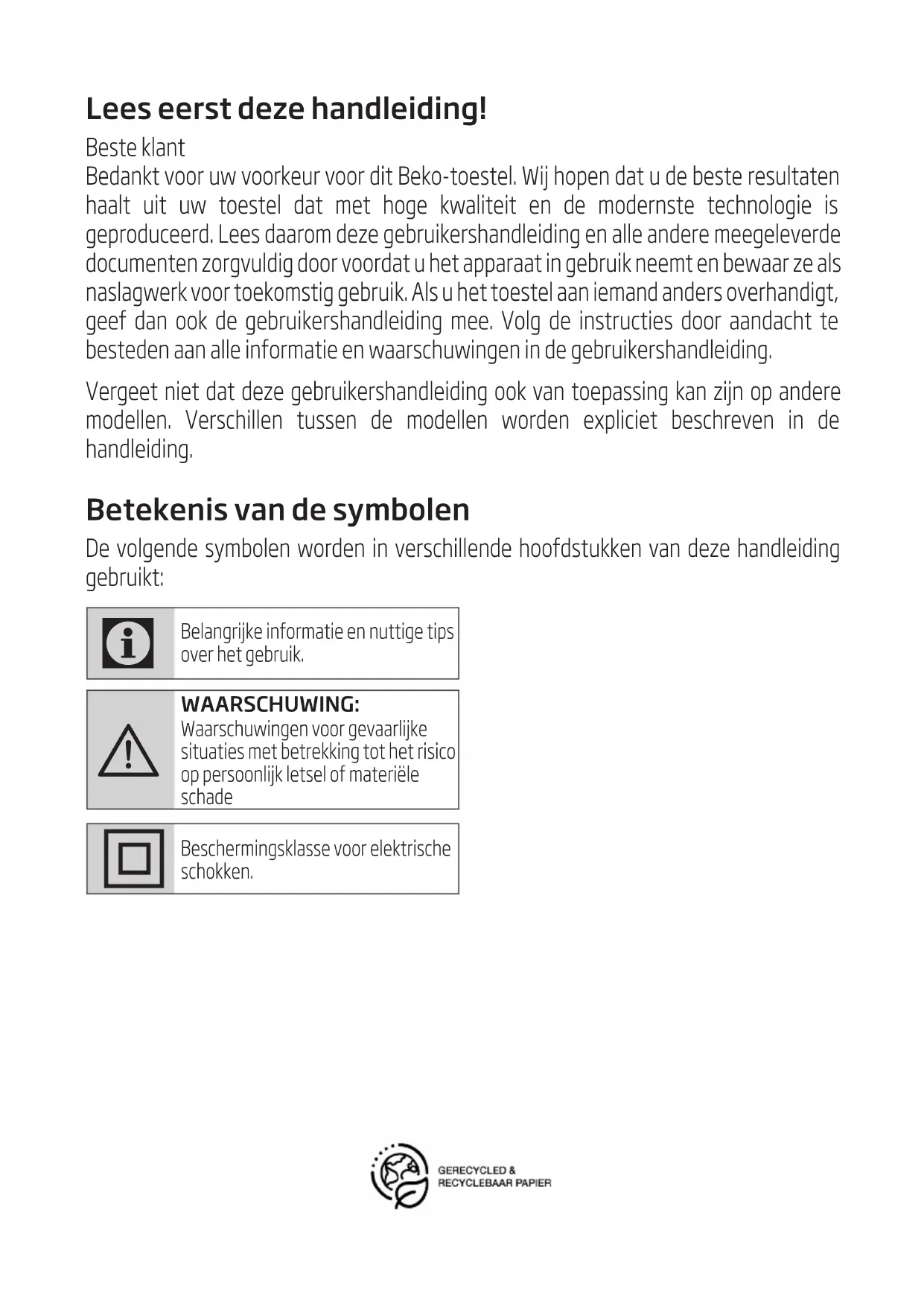 - Ha leejti a készüléket, azzal működésképtelenné teheti vagy maradandó károsodást okozhat benne. 4 Tisztítás és ápolásLees eerst deze handleiding! Beste klant Bedankt voor uw voorkeur voor dit Beko-toestel. Wij hopen dat u de beste resultaten haalt uit uw toestel dat met hoge kwaliteit en de modernste technologie is geproduceerd. Lees daarom deze gebruikershandleiding en alle andere meegeleverde documenten zorgvuldig door voordat u het apparaat in gebruik neemt en bewaar ze als naslagwerk voor toekomstig gebruik. Als u het toestel aan iemand anders overhandigt, geef dan ook de gebruikershandleiding mee. Volg de instructies door aandacht te besteden aan alle informatie en waarschuwingen in de gebruikershandleiding. Vergeet niet dat deze gebruikershandleiding ook van toepassing kan zijn op andere modellen. Verschillen tussen de modellen worden expliciet beschreven in de handleiding. Betekenis van de symbolen De volgende symbolen worden in verschillende hoofdstukken van deze handleiding gebruikt: