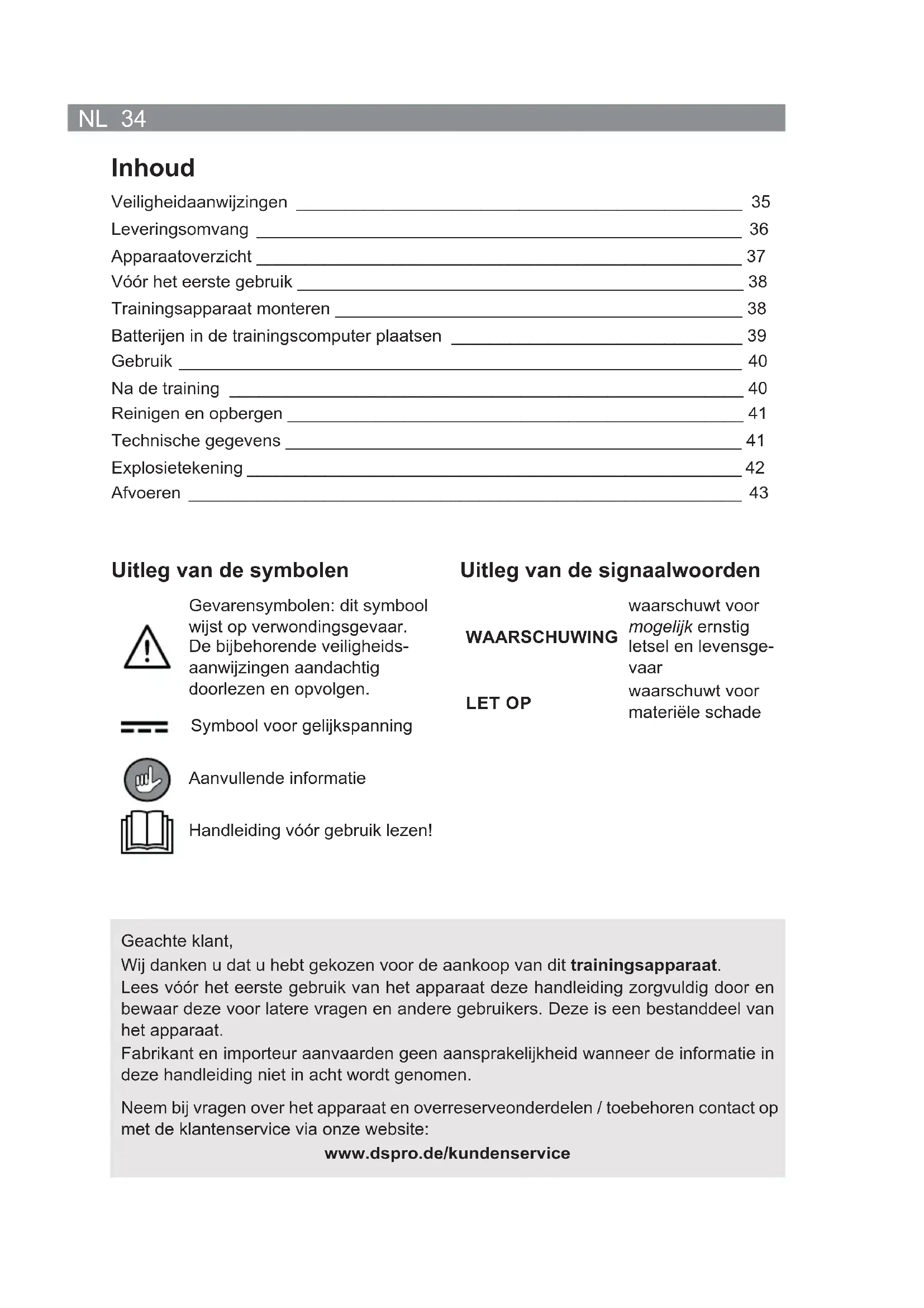 - Alle gebreken die zijn ontstaan door onvakkundige behandeling, beschadiging of re- paratiepogingen, zijn uitgesloten van garantie. Dit geldt ook voor de normale slijtage. Veiligheidaanwijzingen Het veiligheidsniveau van het trainingsapparaat kan alleen dan worden gegarandeerd, wanneer het regelmatig wordt gecontroleerd op schade. Controleer het trainingsappa- raat daarom in het belang van uw eigen veiligheid vóór elk gebruik op beschadigingen (scheuren, gaten, losse schroeven etc.). Mocht u tijdens het gebruik ongewone geluiden van het trainingsapparaat waarnemen, staak dan direct de training. Bij defecten mag het trainingsapparaat niet meer worden gebruikt tot het is gerepareerd. Het trainingsapparaat mag niet meer worden gebruikt, wanneer het is beschadigd. Neem in dit geval contact op met de klantenservice of een gespecialiseerde werkplaats. WAAARSCHUWING – Gevaar voor letsel ■ Verstikkingsgevaar! Houd de toebehoren en het verpakkingsmateriaal uit de buurt van kinderen en dieren. ■ Dit apparaat is niet bedoeld voor gebruik door personen (inclusief kinderen) met be- perkte sensorische of geestelijke vermogens of met een gebrek aan ervaring en/of gebrek aan kennis, tenzij een persoon die verantwoordelijk is voor hun veiligheid, toezicht op hen houdt of hen instructies heeft gegeven over hoe het apparaat moet worden gebruikt. ■ Zwangere vrouwen mogen het trainingsapparaat niet resp. alleen na overleg met hun arts gebruiken. ■ Wanneer u onzeker bent wat betreft de gezondheid (risicogroep), wanneer u langere tijd niets aan sport hebt gedaan, bij hart- / circulatie- of orthopedische problemen in elk geval vóór gebruik van het trainingsapparaat een arts raadplegen. Eventueel het trainingsprogramma met hem bespreken. ■ Het trainingsapparaat is geen speelgoed! Ouders en andere personen die toezicht uitoefenen moeten zich bewust zijn van hun verantwoordelijkheid, omdat wegens een natuurlijke speeldrang en het plezier om te experimenteren bij kinderen moetNL 36 worden gerekend met situaties en gedragingen, waarvoor het trainingsapparaat niet is gemaakt. WAARSCHUWING – Gevaar voor verwondingen door etsende werking door batterijzuur! ■ Batterijen kunnen levensgevaarlijk zijn wanneer ze worden ingeslikt. Batterij en ap- paraat op een plaats bewaren buiten bereik van kinderen en dieren. Roep meteen medische hulp in wanneer een batterij werd ingeslikt. ■ Als een batterij heeft gelekt, dient u te voorkomen dat huid, ogen en slijmvliezen in contact komen met het batterijzuur. Draag eventueel veiligheidshandschoenen. Bij contact met batterijzuur moet u de desbetreff ende plaatsen direct met veel schoon water spoelen en onmiddellijk een arts raadplegen. LET OP – Risico op materiële schade ■ Stel het trainingsapparaat niet bloot aan extreme temperaturen, sterke temperatuur- schommelingen, lang aanhoudend vocht of natheid, direct zonlicht of schokken. ■ Vervang altijd alle batterijen. Gebruik geen verschillende typen of merken batterijen of batterijen met een verschillende capaciteit. ■ Afhankelijk van de lichaamslengte, voldoende ruimte naar alle kanten van het trainingsappa- raat (minimaal 1 meter naar de zijkanten, 2 me- ter naar boven) laten, zodat tijdens de training voldoende speelruimte beschikbaar is. Verder moet het vrije gedeelte in de richting van waar- uit de toegang tot het trainingsapparaat plaats- vindt, minimaal 0,6 m groter zijn dan het oefen- gedeelte. Het vrije gedeelte moet het gedeelte omvatten om in noodgevallen van het apparaat af te kunnen stappen. Mochten trainingsappa- raten dicht naast elkaar zijn opgesteld, kunnen ze een vrij gedeelte delen. Leveringsomvang