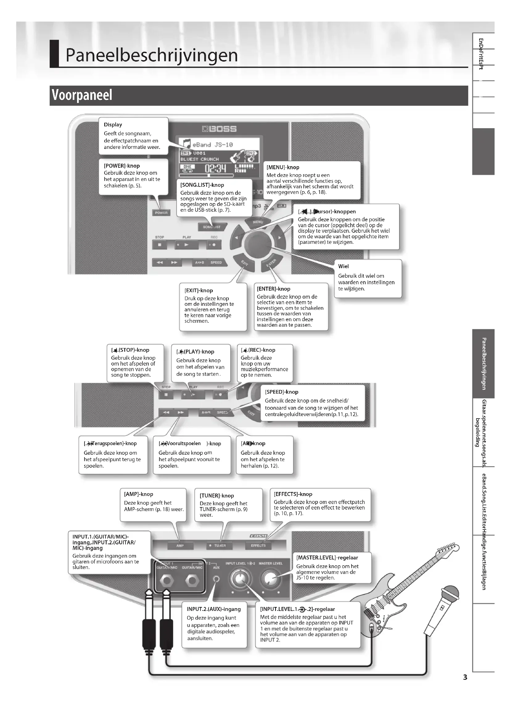 Paneelbeschrijvingen Voorpaneel [MENU]-knop Met deze knop roept u een aantal verschillende functies op, afhankelijk van het scherm dat wordt weergegeven (p. 6, p. 18). Wiel Gebruik dit wiel om waarden en instellingen te wijzigen. [EXIT]-knop Druk op deze knop om de instellingen te annuleren en terug te keren naar vorige schermen. [ENTER]-knop Gebruik deze knop om de selectie van een item te bevestigen, om te schakelen tussen de waarden van instellingen en om deze waarden aan te passen. [POWER]-knop Gebruik deze knop om het apparaat in en uit te schakelen (p. 5). [SONG.LIST]-knop Gebruik deze knop om de songs weer te geven die zijn opgeslagen op de SD-kaart en de USB-stick (p. 7). [. .].[. .].(Cursor)-knoppen Gebruik deze knoppen om de positie van de cursor (opgelicht deel) op de display te verplaatsen. Gebruik het wiel om de waarde van het opgelichte item (parameter) te wijzigen. Display Geeft de songnaam, de eectpatchnaam en andere informatie weer. [. .].(Terugspoelen)-knop Gebruik deze knop om het afspeelpunt terug te spoelen. [. .].(Vooruitspoelen)-knop Gebruik deze knop om het afspeelpunt vooruit te spoelen. [A B]-knop Gebruik deze knop om het afspelen te herhalen (p. 12). [. .].(STOP)-knop Gebruik deze knop om het afspelen of opnemen van de song te stoppen. [. .].(PLAY)-knop Gebruik deze knop om het afspelen van de song te starten. [. .].(REC)-knop Gebruik deze knop om uw muziekperformance op te nemen. [SPEED]-knop Gebruik deze knop om de snelheid/ toonaard van de song te wijzigen of het centrale geluid te verwijderen (p. 11, p. 12). [MASTER.LEVEL]-regelaar Gebruik deze knop om het algemene volume van de JS-10 te regelen. INPUT.2.(AUX)-ingang Op deze ingang kunt u apparaten, zoals een digitale audiospeler, aansluiten. [INPUT.LEVEL.1. .2]-regelaar Met de middelste regelaar past u het volume aan van de apparaten op INPUT 1 en met de buitenste regelaar past u het volume aan van de apparaten op INPUT 2. [AMP]-knop Deze knop geeft het AMP-scherm (p. 18) weer. [TUNER]-knop Deze knop geeft het TUNER-scherm (p. 9) weer. [EFFECTS]-knop Gebruik deze knop om een eectpatch te selecteren of een eect te bewerken (p. 10, p. 17).