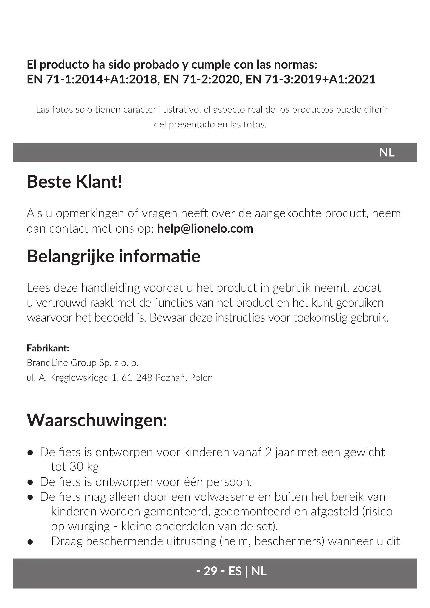 Steek de stuurpen (A) door het gat in de vork van de ets, en vervolgens achtereenvolgens door: moer (B), wiel (C), tweede moer (B) en tweede gat in de vork. Draai de asmoer (D) vast met een inbussleutel. Monteer beide etswielen op dezelfde manier. Zorg ervoor dat alle bevesgingselementen vóór gebruik goed zijn vastgedraaid. Het gebruik Ga op het zadel zien, pak beide handgrepen van het stuur stevig vast en duw dan afwisselend met uw voeten van de grond. Als u eenmaal op snelheid bent, lt u uw voeten op om vrij te rijden. Op deze manier moet het kind leren zijn evenwicht te bewaren. Bochten worden gemaakt door het stuur in de richng van de bocht te draaien en het lichaam in evenwicht te brengen. Rem door met uw voeten de grond aan te raken. Onderhoud en reiniging Veeg de ets af met een vochge doek en veeg hem daarna droog. Gebruik geen bijtende of schurende middelen om het product te reinigen. Het product is getest en voldoet aan de normen: EN 71-1:2014+A1:2018, EN 71-2:2020, EN 71-3:2019+A1:2021 De beelden zijn slechts voor illustrae, het daadwerkelijke uiterlijk van producten kan verschillen die in de beelden wordt voorgesteld.‑ 33 ‑ LT Gerbiamas Kliente! Jei turite pastabų ar klausimų apie įsigytą produktą, nedvejodami susisiekite su mumis: help@lionelo.com Svarbios informacijos Prieš naudodami gaminį, perskaitykite šią instrukciją, kad susipažintumėte su jo funkcijomis ir naudotumėte jį pagal paskir. Išsaugokite šias instrukcijas ateičiai. Gamintojas: BrandLine Group Sp. z o. o. A. Kręglewskiego 1, 61-248 Poznanė, Lenkija Įspėjimai: