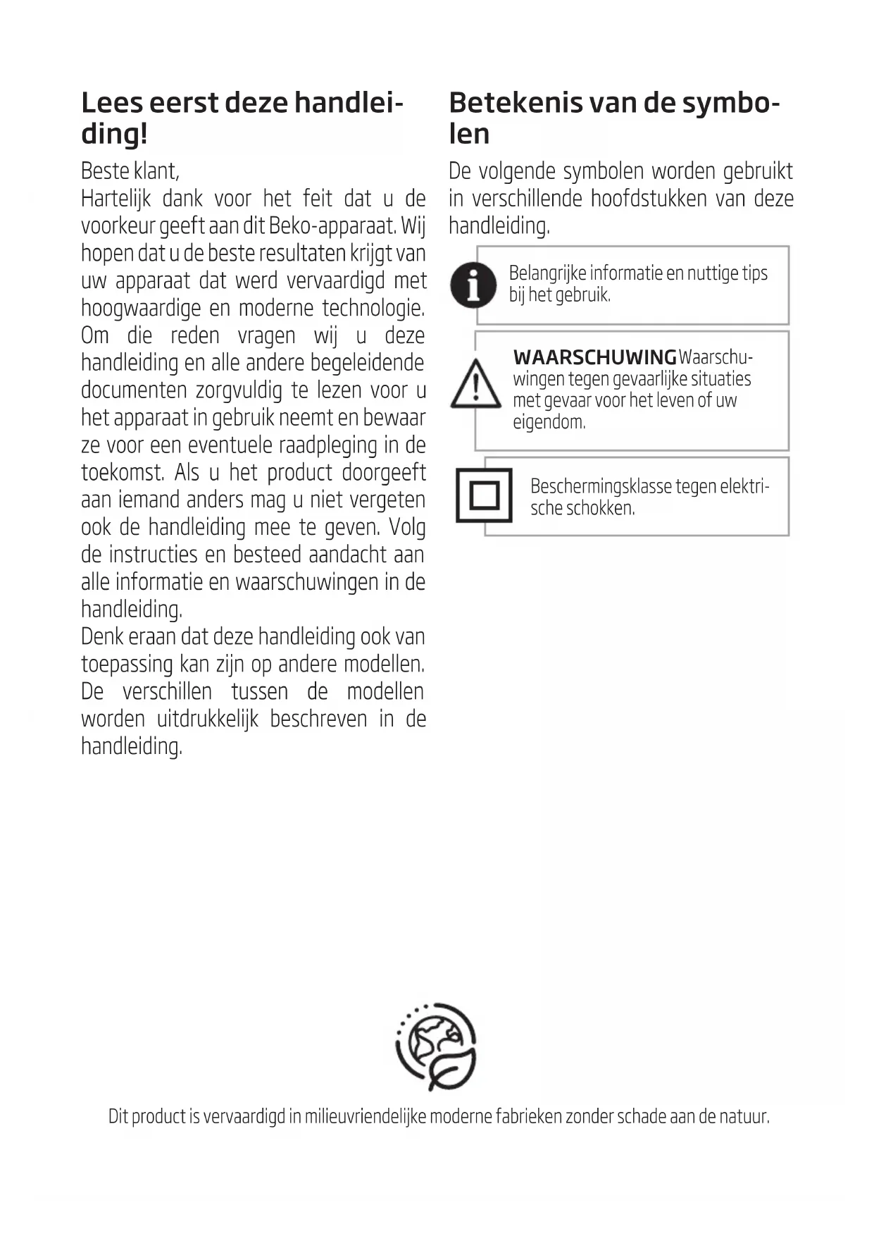 l’emballage Les matériaux d’emballage de cet appareil sont fabriqués à partir de matériaux recyclables, conformément à nos réglementations nationales en matière d’environnement. Ne mettez pas les matériaux d’emballage au rebut avec les ordures ménagères et d’autres déchets. Déposez-les plutôt aux points de collecte des matériaux d’emballage désignés par les autorités locales.Dit product is vervaardigd in milieuvriendelijke moderne fabrieken zonder schade aan de natuur. Lees eerst deze handlei- ding! Beste klant, Hartelijk dank voor het feit dat u de voorkeur geeft aan dit Beko-apparaat. Wij hopen dat u de beste resultaten krijgt van uw apparaat dat werd vervaardigd met hoogwaardige en moderne technologie. Om die reden vragen wij u deze handleiding en alle andere begeleidende documenten zorgvuldig te lezen voor u het apparaat in gebruik neemt en bewaar ze voor een eventuele raadpleging in de toekomst. Als u het product doorgeeft aan iemand anders mag u niet vergeten ook de handleiding mee te geven. Volg de instructies en besteed aandacht aan alle informatie en waarschuwingen in de handleiding. Denk eraan dat deze handleiding ook van toepassing kan zijn op andere modellen. De verschillen tussen de modellen worden uitdrukkelijk beschreven in de handleiding. Betekenis van de symbo- len De volgende symbolen worden gebruikt in verschillende hoofdstukken van deze handleiding. Belangrijke informatie en nuttige tips bij het gebruik. WAARSCHUWING Waarschu- wingen tegen gevaarlijke situaties met gevaar voor het leven of uw eigendom. Beschermingsklasse tegen elektri- sche schokken.1. Handvat