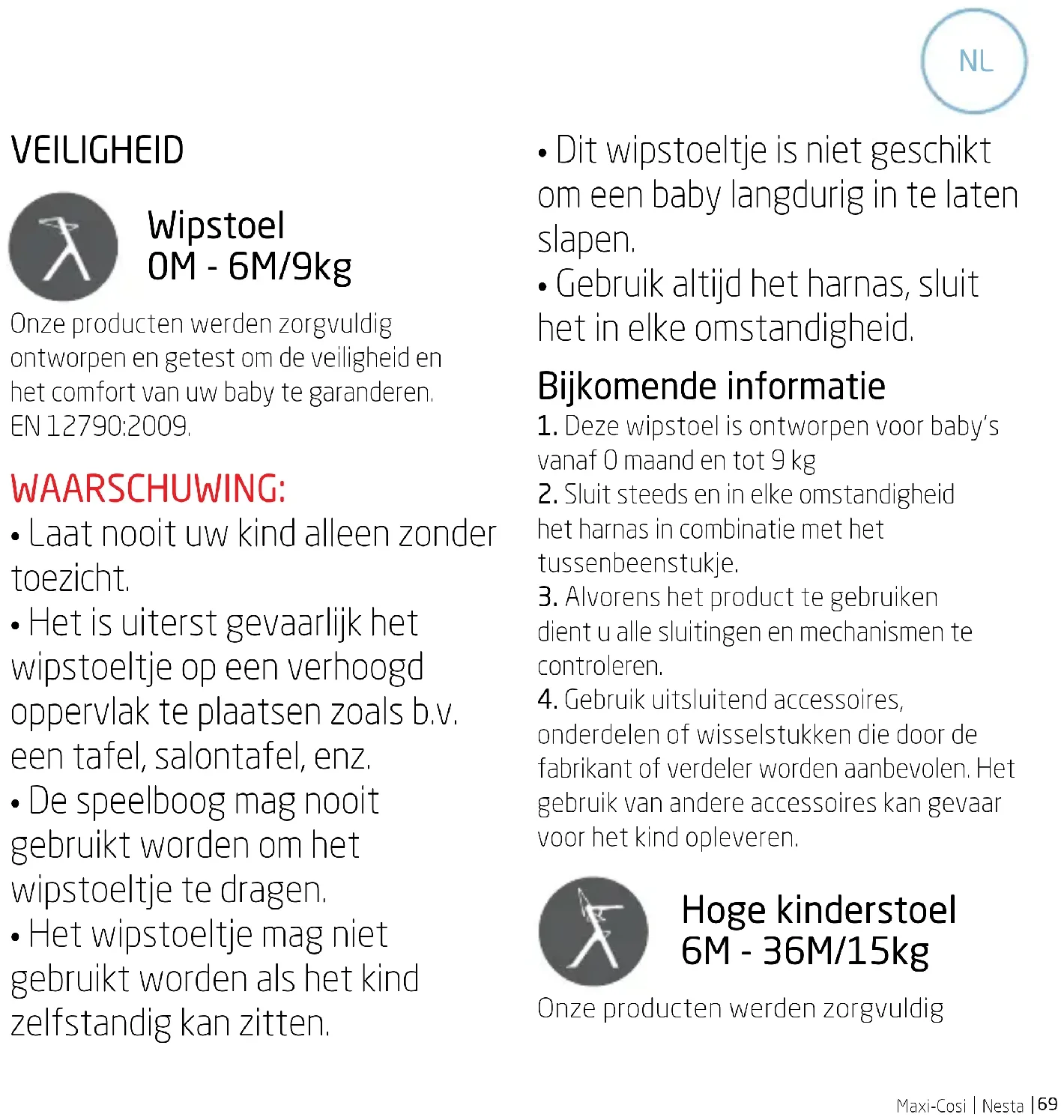 VEILIGHEID Wipstoel 0M - 6M/9kg Onze producten werden zorgvuldig ontworpen en getest om de veiligheid en het comfort van uw baby te garanderen. EN 12790:2009. WAARSCHUWING: