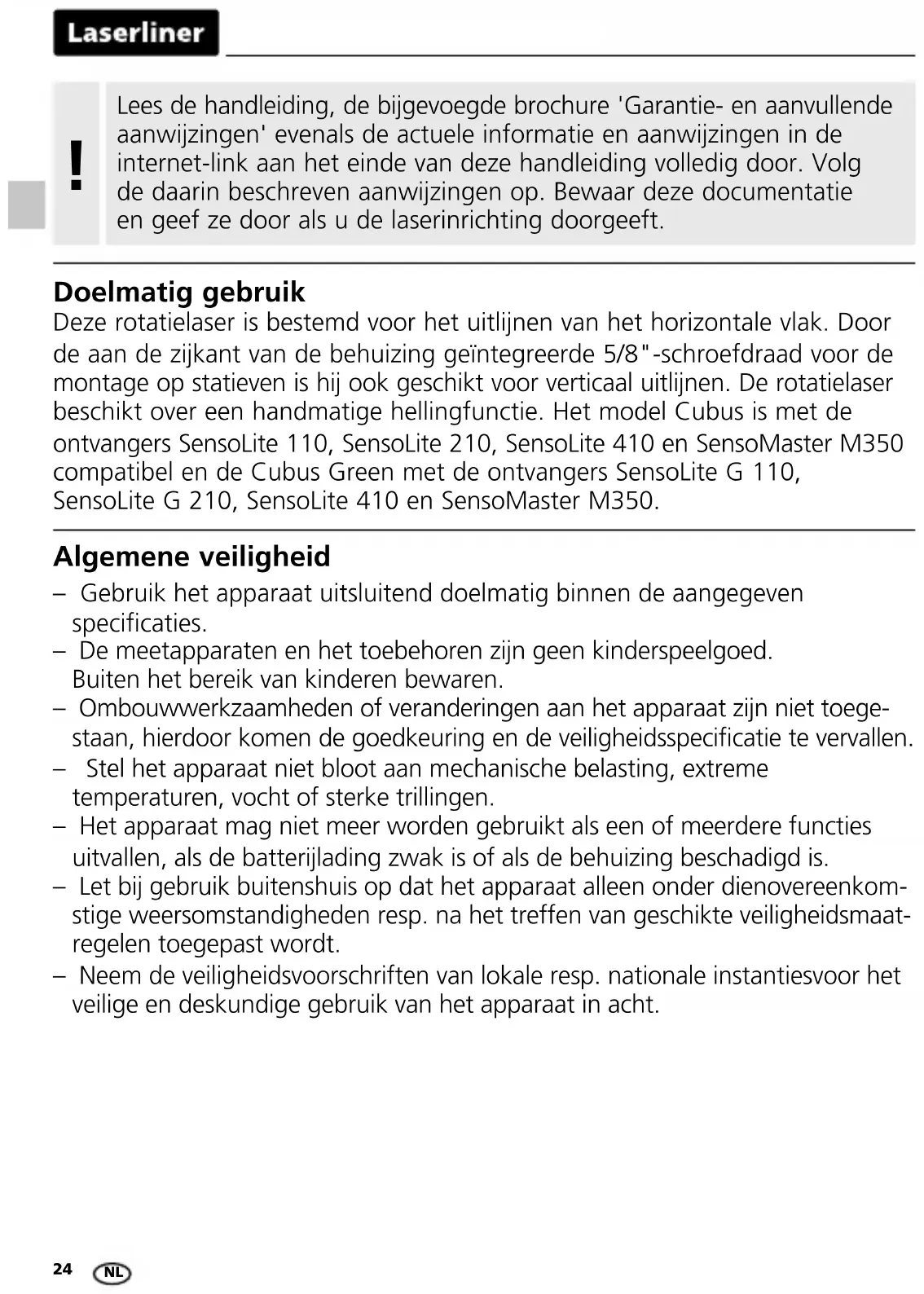 a horizontal reference between points A1 and A2.24 Algemene veiligheid – Gebruik het apparaat uitsluitend doelmatig binnen de aangegeven specicaties. – De meetapparaten en het toebehoren zijn geen kinderspeelgoed. Buiten het bereik van kinderen bewaren. – Ombouwwerkzaamheden of veranderingen aan het apparaat zijn niet toege- staan, hierdoor komen de goedkeuring en de veiligheidsspecicatie te vervallen. – Stel het apparaat niet bloot aan mechanische belasting, extreme temperaturen, vocht of sterke trillingen. – Het apparaat mag niet meer worden gebruikt als een of meerdere functies uitvallen, als de batterijlading zwak is of als de behuizing beschadigd is. – Let bij gebruik buitenshuis op dat het apparaat alleen onder dienovereenkom- stige weersomstandigheden resp. na het treffen van geschikte veiligheidsmaat- regelen toegepast wordt. – Neem de veiligheidsvoorschriften van lokale resp. nationale instantiesvoor het veilige en deskundige gebruik van het apparaat in acht. Doelmatig gebruik Deze rotatielaser is bestemd voor het uitlijnen van het horizontale vlak. Door de aan de zijkant van de behuizing geïntegreerde 5/8"-schroefdraad voor de montage op statieven is hij ook geschikt voor verticaal uitlijnen. De rotatielaser beschikt over een handmatige hellingfunctie. Het model Cubus is met de ontvangers SensoLite 110, SensoLite 210, SensoLite 410 en SensoMaster M350 compatibel en de Cubus Green met de ontvangers SensoLite G 110, SensoLite G 210, SensoLite 410 en SensoMaster M350. Lees de handleiding, de bijgevoegde brochure 'Garantie- en aanvullende aanwijzingen' evenals de actuele informatie en aanwijzingen in de internet-link aan het einde van deze handleiding volledig door. Volg de daarin beschreven aanwijzingen op. Bewaar deze documentatie en geef ze door als u de laserinrichting doorgeeft.