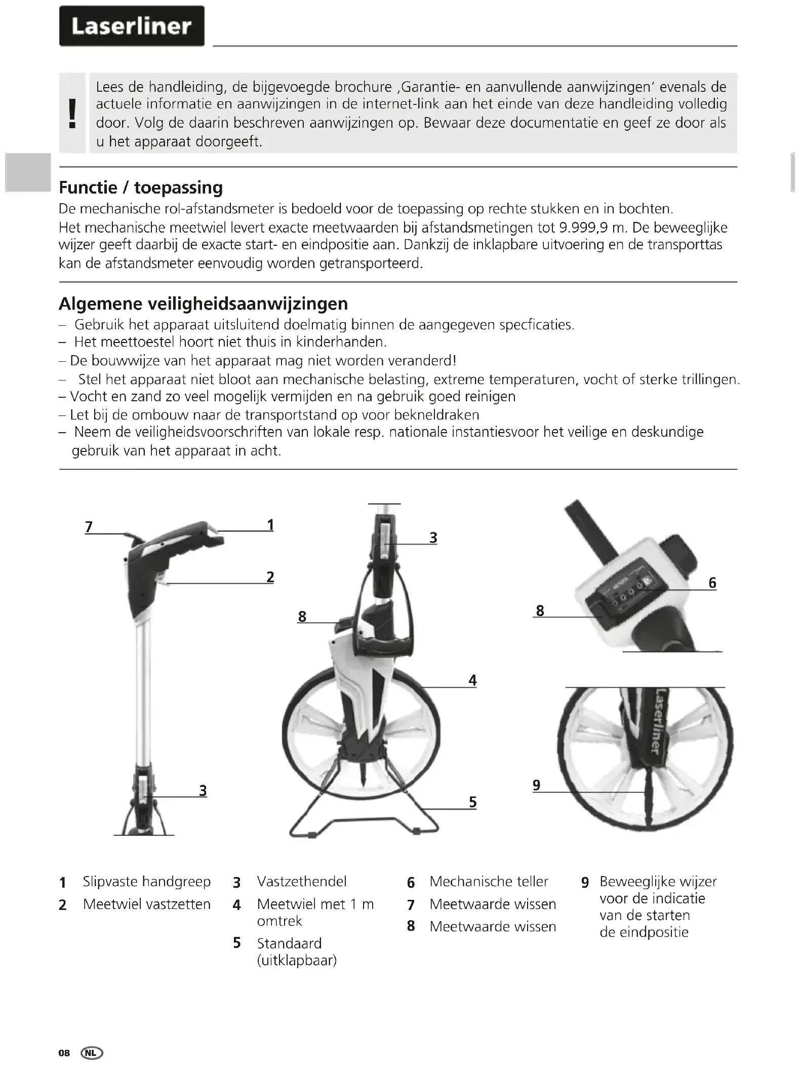 Functie / toepassing De mechanische rol-afstandsmeter is bedoeld voor de toepassing op rechte stukken en in bochten. Het mechanische meetwiel levert exacte meetwaarden bij afstandsmetingen tot 9.999,9 m. De beweeglijke wijzer geeft daarbij de exacte start- en eindpositie aan. Dankzij de inklapbare uitvoering en de transporttas kan de afstandsmeter eenvoudig worden getransporteerd. Algemene veiligheidsaanwijzingen – Gebruik het apparaat uitsluitend doelmatig binnen de aangegeven speccaties. – Het meettoestel hoort niet thuis in kinderhanden. – De bouwwijze van het apparaat mag niet worden veranderd! – Stel het apparaat niet bloot aan mechanische belasting, extreme temperaturen, vocht of sterke trillingen. – Vocht en zand zo veel mogelijk vermijden en na gebruik goed reinigen – Let bij de ombouw naar de transportstand op voor bekneldraken – Neem de veiligheidsvoorschriften van lokale resp. nationale instantiesvoor het veilige en deskundige gebruik van het apparaat in acht.