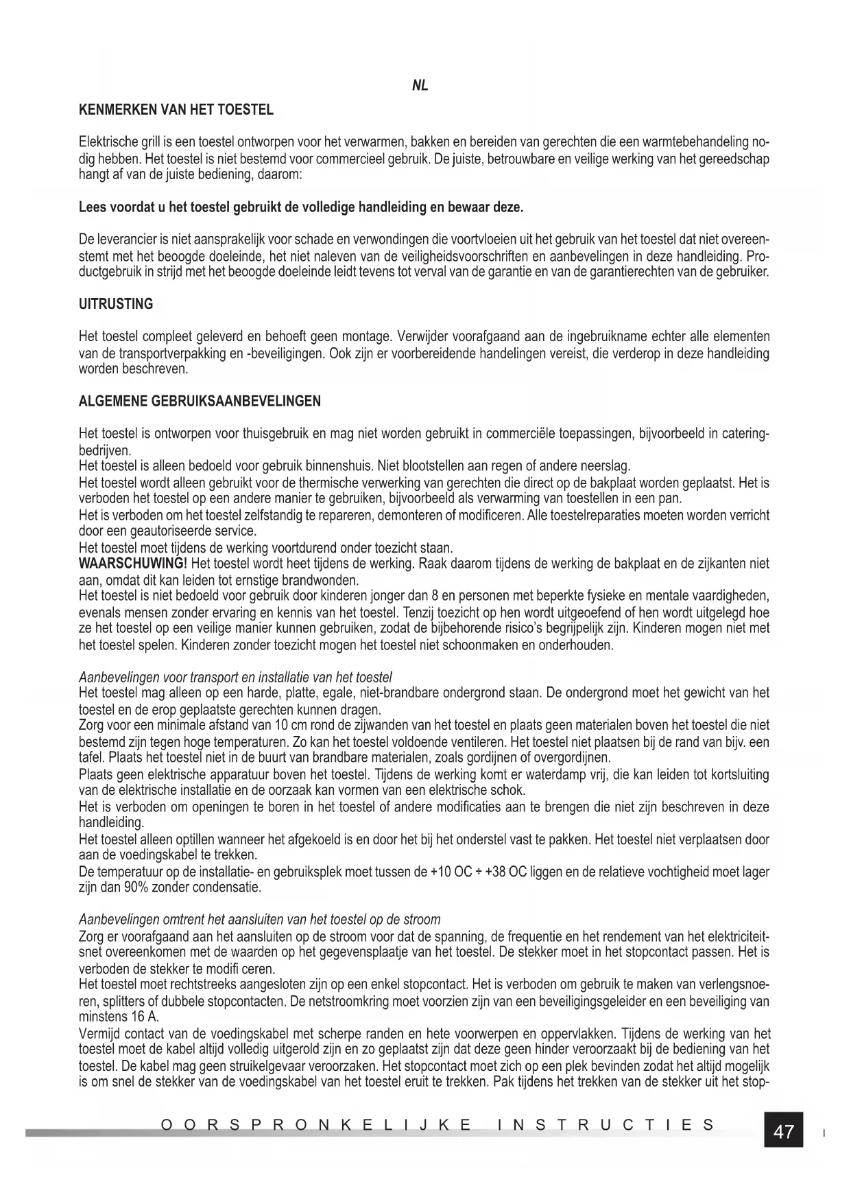 Elektrische grill is een toestel ontworpen voor het verwarmen, bakken en bereiden van gerechten die een warmtebehandeling no- dig hebben. Het toestel is niet bestemd voor commercieel gebruik. De juiste, betrouwbare en veilige werking van het gereedschap hangt af van de juiste bediening, daarom: Lees voordat u het toestel gebruikt de volledige handleiding en bewaar deze. De leverancier is niet aansprakelijk voor schade en verwondingen die voortvloeien uit het gebruik van het toestel dat niet overeen- stemt met het beoogde doeleinde, het niet naleven van de veiligheidsvoorschriften en aanbevelingen in deze handleiding. Pro- ductgebruik in strijd met het beoogde doeleinde leidt tevens tot verval van de garantie en van de garantierechten van de gebruiker. UITRUSTING Het toestel compleet geleverd en behoeft geen montage. Verwijder voorafgaand aan de ingebruikname echter alle elementen van de transportverpakking en -beveiligingen. Ook zijn er voorbereidende handelingen vereist, die verderop in deze handleiding worden beschreven. ALGEMENE GEBRUIKSAANBEVELINGEN Het toestel is ontworpen voor thuisgebruik en mag niet worden gebruikt in commerciële toepassingen, bijvoorbeeld in catering- bedrijven. Het toestel is alleen bedoeld voor gebruik binnenshuis. Niet blootstellen aan regen of andere neerslag. Het toestel wordt alleen gebruikt voor de thermische verwerking van gerechten die direct op de bakplaat worden geplaatst. Het is verboden het toestel op een andere manier te gebruiken, bijvoorbeeld als verwarming van toestellen in een pan. Het is verboden om het toestel zelfstandig te repareren, demonteren of modifi ceren. Alle toestelreparaties moeten worden verricht door een geautoriseerde service. Het toestel moet tijdens de werking voortdurend onder toezicht staan. WAARSCHUWING! Het toestel wordt heet tijdens de werking. Raak daarom tijdens de werking de bakplaat en de zijkanten niet aan, omdat dit kan leiden tot ernstige brandwonden. Het toestel is niet bedoeld voor gebruik door kinderen jonger dan 8 en personen met beperkte fysieke en mentale vaardigheden, evenals mensen zonder ervaring en kennis van het toestel. Tenzij toezicht op hen wordt uitgeoefend of hen wordt uitgelegd hoe ze het toestel op een veilige manier kunnen gebruiken, zodat de bijbehorende risico’s begrijpelijk zijn. Kinderen mogen niet met het toestel spelen. Kinderen zonder toezicht mogen het toestel niet schoonmaken en onderhouden. Aanbevelingen voor transport en installatie van het toestel Het toestel mag alleen op een harde, platte, egale, niet-brandbare ondergrond staan. De ondergrond moet het gewicht van het toestel en de erop geplaatste gerechten kunnen dragen. Zorg voor een minimale afstand van 10 cm rond de zijwanden van het toestel en plaats geen materialen boven het toestel die niet bestemd zijn tegen hoge temperaturen. Zo kan het toestel voldoende ventileren. Het toestel niet plaatsen bij de rand van bijv. een tafel. Plaats het toestel niet in de buurt van brandbare materialen, zoals gordijnen of overgordijnen. Plaats geen elektrische apparatuur boven het toestel. Tijdens de werking komt er waterdamp vrij, die kan leiden tot kortsluiting van de elektrische installatie en de oorzaak kan vormen van een elektrische schok. Het is verboden om openingen te boren in het toestel of andere modifi caties aan te brengen die niet zijn beschreven in deze handleiding. Het toestel alleen optillen wanneer het afgekoeld is en door het bij het onderstel vast te pakken. Het toestel niet verplaatsen door aan de voedingskabel te trekken. De temperatuur op de installatie- en gebruiksplek moet tussen de +10 OC ÷ +38 OC liggen en de relatieve vochtigheid moet lager zijn dan 90% zonder condensatie. Aanbevelingen omtrent het aansluiten van het toestel op de stroom Zorg er voorafgaand aan het aansluiten op de stroom voor dat de spanning, de frequentie en het rendement van het elektriciteit- snet overeenkomen met de waarden op het gegevensplaatje van het toestel. De stekker moet in het stopcontact passen. Het is verboden de stekker te modifi ceren. Het toestel moet rechtstreeks aangesloten zijn op een enkel stopcontact. Het is verboden om gebruik te maken van verlengsnoe- ren, splitters of dubbele stopcontacten. De netstroomkring moet voorzien zijn van een beveiligingsgeleider en een beveiliging van minstens 16 A. Vermijd contact van de voedingskabel met scherpe randen en hete voorwerpen en oppervlakken. Tijdens de werking van het toestel moet de kabel altijd volledig uitgerold zijn en zo geplaatst zijn dat deze geen hinder veroorzaakt bij de bediening van het toestel. De kabel mag geen struikelgevaar veroorzaken. Het stopcontact moet zich op een plek bevinden zodat het altijd mogelijk is om snel de stekker van de voedingskabel van het toestel eruit te trekken. Pak tijdens het trekken van de stekker uit het stop-48 OORSPRONKELIJKE INSTRUCTIES