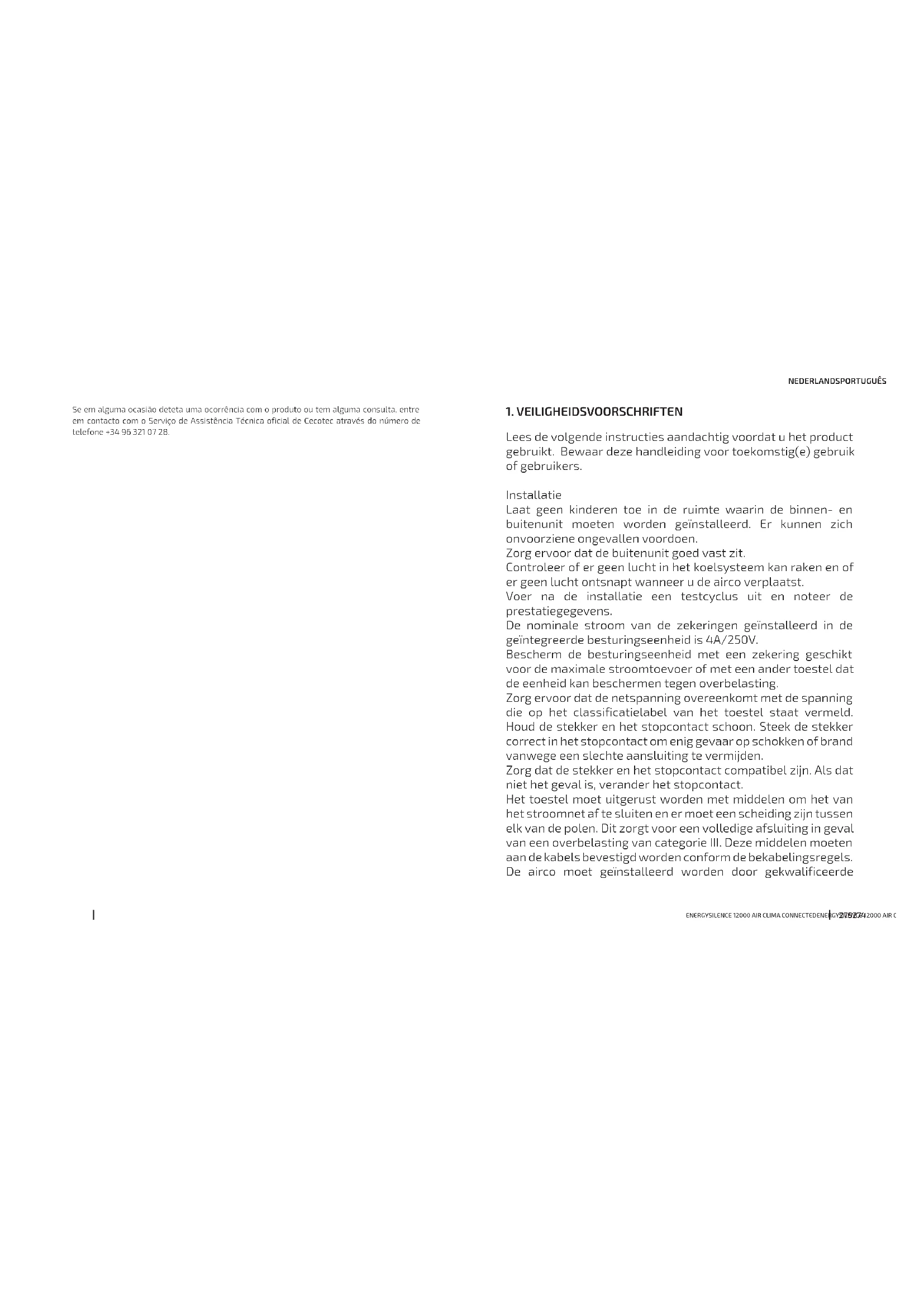 Lees de volgende instructies aandachtig voordat u het product gebruikt. Bewaar deze handleiding voor toekomstig(e) gebruik of gebruikers. Installatie Laat geen kinderen toe in de ruimte waarin de binnen- en buitenunit moeten worden geïnstalleerd. Er kunnen zich onvoorziene ongevallen voordoen. Zorg ervoor dat de buitenunit goed vast zit. Controleer of er geen lucht in het koelsysteem kan raken en of er geen lucht ontsnapt wanneer u de airco verplaatst. Voer na de installatie een testcyclus uit en noteer de prestatiegegevens. De nominale stroom van de zekeringen geïnstalleerd in de geïntegreerde besturingseenheid is 4A/250V. Bescherm de besturingseenheid met een zekering geschikt voor de maximale stroomtoevoer of met een ander toestel dat de eenheid kan beschermen tegen overbelasting. Zorg ervoor dat de netspanning overeenkomt met de spanning die op het classificatielabel van het toestel staat vermeld. Houd de stekker en het stopcontact schoon. Steek de stekker correct in het stopcontact om enig gevaar op schokken of brand vanwege een slechte aansluiting te vermijden. Zorg dat de stekker en het stopcontact compatibel zijn. Als dat niet het geval is, verander het stopcontact. Het toestel moet uitgerust worden met middelen om het van het stroomnet af te sluiten en er moet een scheiding zijn tussen elk van de polen. Dit zorgt voor een volledige afsluiting in geval van een overbelasting van categorie III. Deze middelen moeten aan de kabels bevestigd worden conform de bekabelingsregels. De airco moet geïnstalleerd worden door gekwalificeerdeENERGYSILENCE 12000 AIR CLIMA CONNECTEDENERGYSILENCE 12000 AIR CLIMA CONNECTED