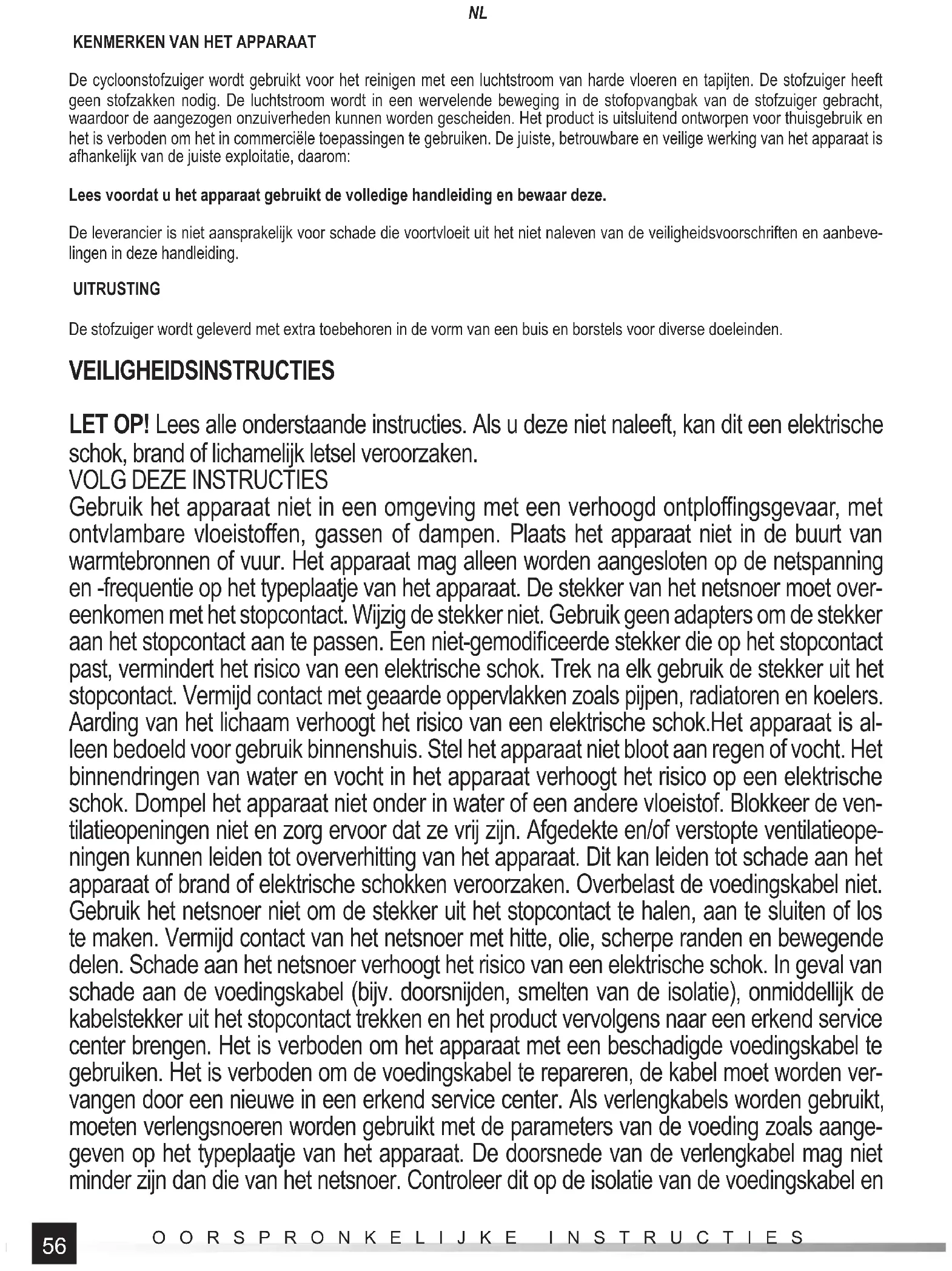 De cycloonstofzuiger wordt gebruikt voor het reinigen met een luchtstroom van harde vloeren en tapijten. De stofzuiger heeft geen stofzakken nodig. De luchtstroom wordt in een wervelende beweging in de stofopvangbak van de stofzuiger gebracht, waardoor de aangezogen onzuiverheden kunnen worden gescheiden. Het product is uitsluitend ontworpen voor thuisgebruik en het is verboden om het in commerciële toepassingen te gebruiken. De juiste, betrouwbare en veilige werking van het apparaat is afhankelijk van de juiste exploitatie, daarom: Lees voordat u het apparaat gebruikt de volledige handleiding en bewaar deze. De leverancier is niet aansprakelijk voor schade die voortvloeit uit het niet naleven van de veiligheidsvoorschriften en aanbeve- lingen in deze handleiding. UITRUSTING De stofzuiger wordt geleverd met extra toebehoren in de vorm van een buis en borstels voor diverse doeleinden. VEILIGHEIDSINSTRUCTIES LET OP! Lees alle onderstaande instructies. Als u deze niet naleeft, kan dit een elektrische schok, brand of lichamelijk letsel veroorzaken.