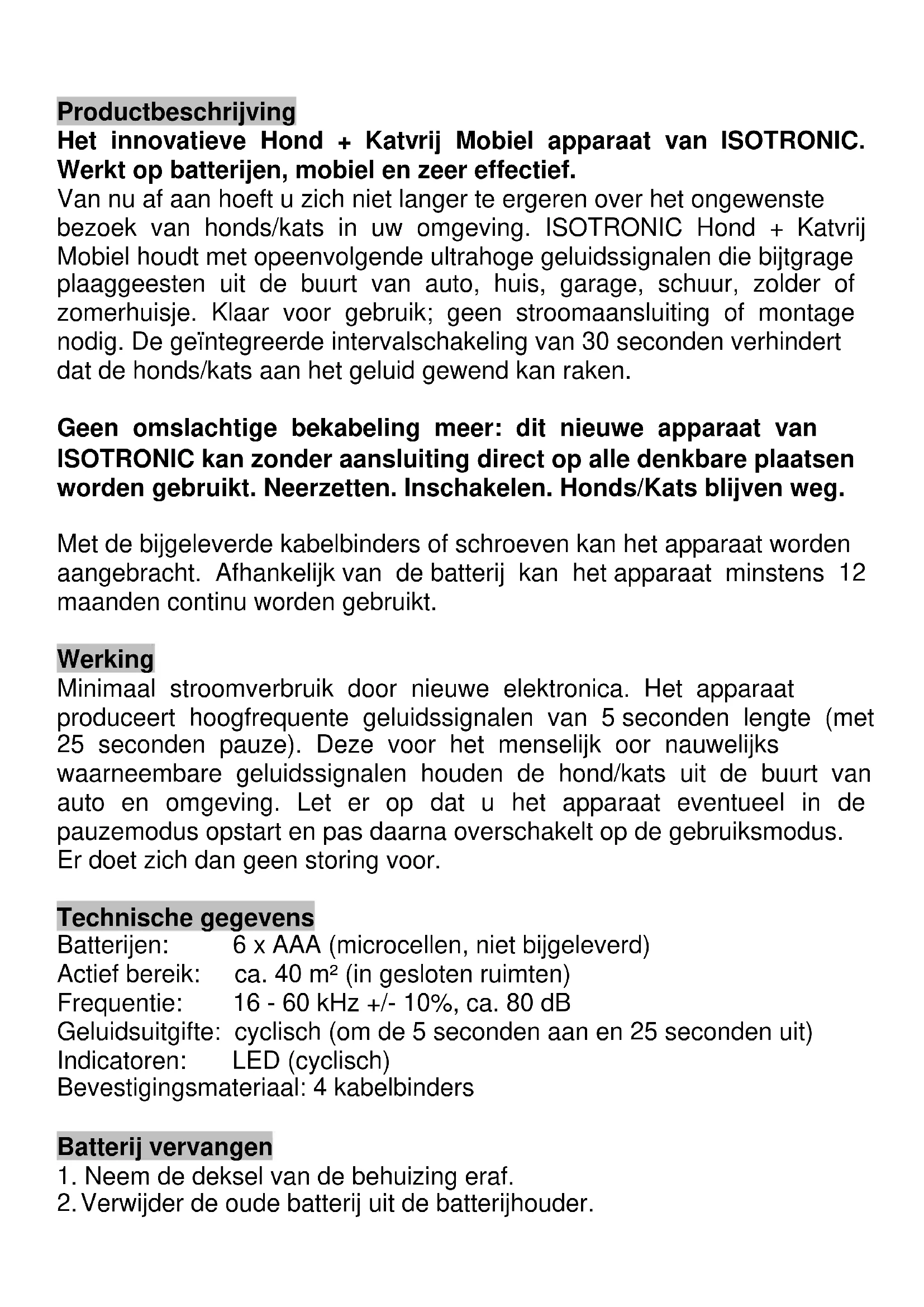 Zeer geachte klant, hartelijk gelukgewenst met uw aankoop van één van onze kwaliteitsproducten. Gelieve de gebruiksaanwijzing voor de ingebruikname zorgvuldig door te lezen goed te bewaren.Productbeschrijving Het innovatieve Hond + Katvrij Mobiel apparaat van ISOTRONIC. Werkt op batterijen, mobiel en zeer effectief. Van nu af aan hoeft u zich niet langer te ergeren over het ongewenste bezoek van honds/kats in uw omgeving. ISOTRONIC Hond + Katvrij Mobiel houdt met opeenvolgende ultrahoge geluidssignalen die bijtgrage plaaggeesten uit de buurt van auto, huis, garage, schuur, zolder of zomerhuisje. Klaar voor gebruik; geen stroomaansluiting of montage nodig. De geïntegreerde intervalschakeling van 30 seconden verhindert dat de honds/kats aan het geluid gewend kan raken. Geen omslachtige bekabeling meer: dit nieuwe apparaat van ISOTRONIC kan zonder aansluiting direct op alle denkbare plaatsen worden gebruikt. Neerzetten. Inschakelen. Honds/Kats blijven weg. Met de bijgeleverde kabelbinders of schroeven kan het apparaat worden aangebracht. Afhankelijk van de batterij kan het apparaat minstens 12 maanden continu worden gebruikt. Werking Minimaal stroomverbruik door nieuwe elektronica. Het apparaat produceert hoogfrequente geluidssignalen van 5 seconden lengte (met 25 seconden pauze). Deze voor het menselijk oor nauwelijks waarneembare geluidssignalen houden de hond/kats uit de buurt van auto en omgeving. Let er op dat u het apparaat eventueel in de pauzemodus opstart en pas daarna overschakelt op de gebruiksmodus. Er doet zich dan geen storing voor. Technische gegevens Batterijen: 6 x AAA (microcellen, niet bijgeleverd) Actief bereik: ca. 40 m² (in gesloten ruimten) Frequentie: 16 - 60 kHz +/- 10%, ca. 80 dB Geluidsuitgifte: cyclisch (om de 5 seconden aan en 25 seconden uit) Indicatoren: LED (cyclisch) Bevestigingsmateriaal: 4 kabelbinders Batterij vervangen