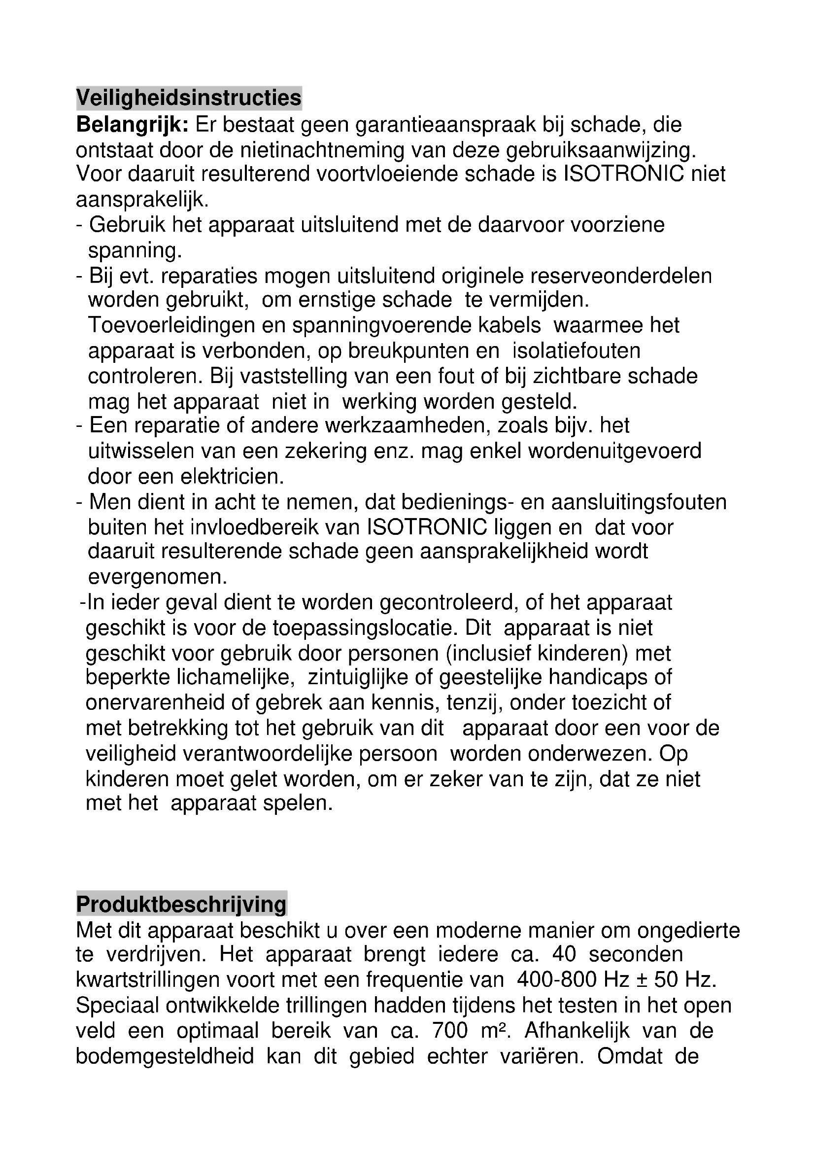 Zeer geachte klant, hartelijk gelukgewenst met uw aankoop van één van onze kwaliteitsproducten. Gelieve de gebruiksaanwijzing voor de ingebruikname zorgvuldig door te lezen goed te bewaren. Ongedierte bestrijden met vibraties – dat is nu mogelijk!Veiligheidsinstructies Belangrijk: Er bestaat geen garantieaanspraak bij schade, die ontstaat door de nietinachtneming van deze gebruiksaanwijzing. Voor daaruit resulterend voortvloeiende schade is ISOTRONIC niet aansprakelijk. - Gebruik het apparaat uitsluitend met de daarvoor voorziene spanning. - Bij evt. reparaties mogen uitsluitend originele reserveonderdelen worden gebruikt, om ernstige schade te vermijden. Toevoerleidingen en spanningvoerende kabels waarmee het apparaat is verbonden, op breukpunten en isolatiefouten controleren. Bij vaststelling van een fout of bij zichtbare schade mag het apparaat niet in werking worden gesteld. - Een reparatie of andere werkzaamheden, zoals bijv. het uitwisselen van een zekering enz. mag enkel wordenuitgevoerd door een elektricien. - Men dient in acht te nemen, dat bedienings- en aansluitingsfouten buiten het invloedbereik van ISOTRONIC liggen en dat voor daaruit resulterende schade geen aansprakelijkheid wordt evergenomen. -In ieder geval dient te worden gecontroleerd, of het apparaat geschikt is voor de toepassingslocatie. Dit apparaat is niet geschikt voor gebruik door personen (inclusief kinderen) met beperkte lichamelijke, zintuiglijke of geestelijke handicaps of onervarenheid of gebrek aan kennis, tenzij, onder toezicht of met betrekking tot het gebruik van dit apparaat door een voor de veiligheid verantwoordelijke persoon worden onderwezen. Op kinderen moet gelet worden, om er zeker van te zijn, dat ze niet met het apparaat spelen.