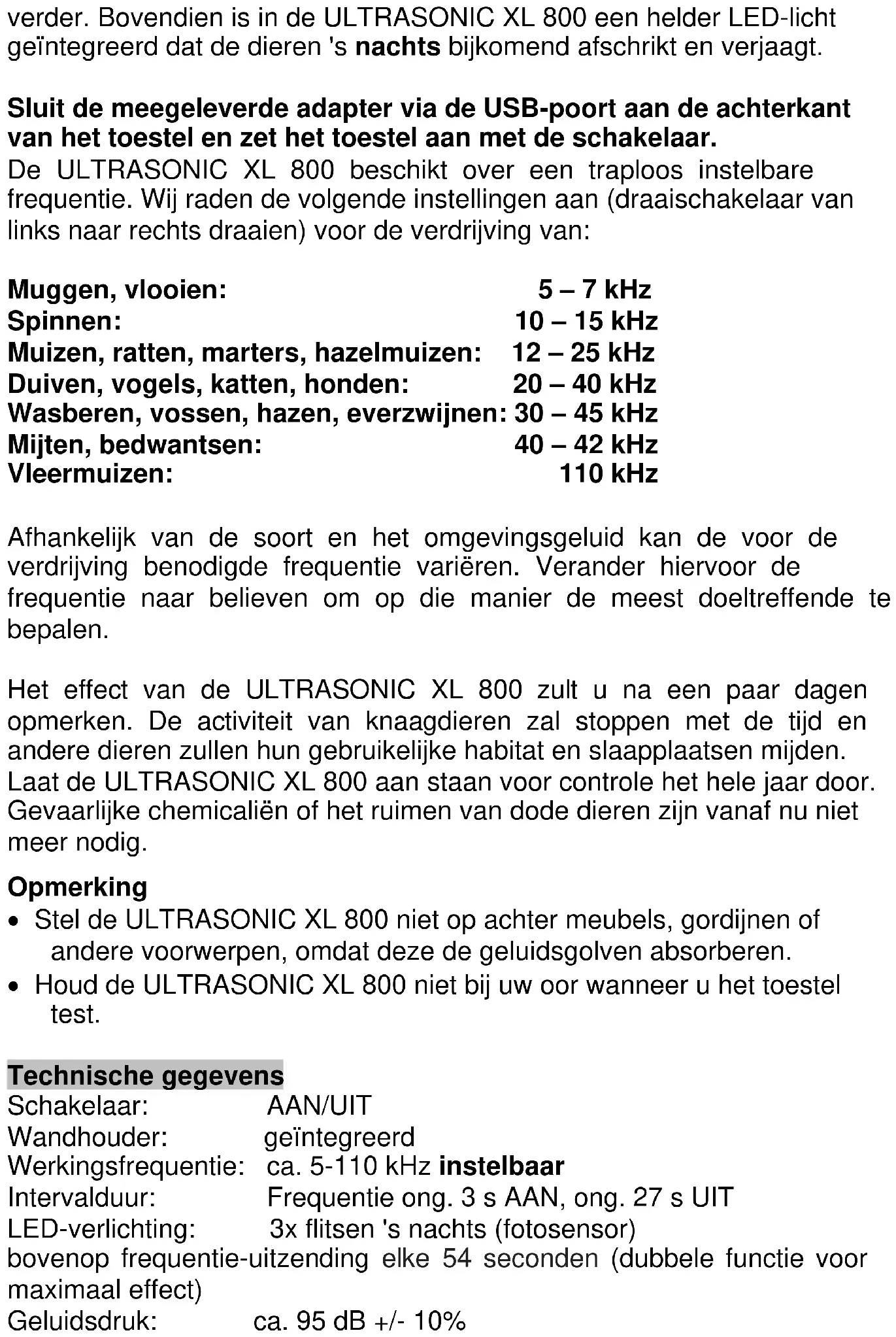 Produktbeschrijving De ULTRASONIC XL 800 is doeltreffend voor de verdrijving van muizen, ratten en andere storende dieren en ongedierte. Laboratoriumanalysen hebben aangetoond dat de ultrasone golven het gehoor- en zenuwstelsel van de meest voorkomende ongedierten aantast en ongemak veroorzaakt. Bij een geluidsdruk van ca. 95 dB +/- 10% geeft het ongedierte het zoeken naar voedsel, water en onderdak op en trektverder. Bovendien is in de ULTRASONIC XL 800 een helder LED-licht geïntegreerd dat de dieren 's nachts bijkomend afschrikt en verjaagt. Sluit de meegeleverde adapter via de USB-poort aan de achterkant van het toestel en zet het toestel aan met de schakelaar. De ULTRASONIC XL 800 beschikt over een traploos instelbare frequentie. Wij raden de volgende instellingen aan (draaischakelaar van links naar rechts draaien) voor de verdrijving van: Muggen, vlooien: 5 – 7 kHz Spinnen: 10 – 15 kHz Muizen, ratten, marters, hazelmuizen: 12 – 25 kHz Duiven, vogels, katten, honden: 20 – 40 kHz Wasberen, vossen, hazen, everzwijnen: 30 – 45 kHz Mijten, bedwantsen: 40 – 42 kHz Vleermuizen: 110 kHz Afhankelijk van de soort en het omgevingsgeluid kan de voor de verdrijving benodigde frequentie variëren. Verander hiervoor de frequentie naar believen om op die manier de meest doeltreffende te bepalen. Het effect van de ULTRASONIC XL 800 zult u na een paar dagen opmerken. De activiteit van knaagdieren zal stoppen met de tijd en andere dieren zullen hun gebruikelijke habitat en slaapplaatsen mijden. Laat de ULTRASONIC XL 800 aan staan voor controle het hele jaar door. Gevaarlijke chemicaliën of het ruimen van dode dieren zijn vanaf nu niet meer nodig. Opmerking Stel de ULTRASONIC XL 800 niet op achter meubels, gordijnen of andere voorwerpen, omdat deze de geluidsgolven absorberen. Houd de ULTRASONIC XL 800 niet bij uw oor wanneer u het toestel test.