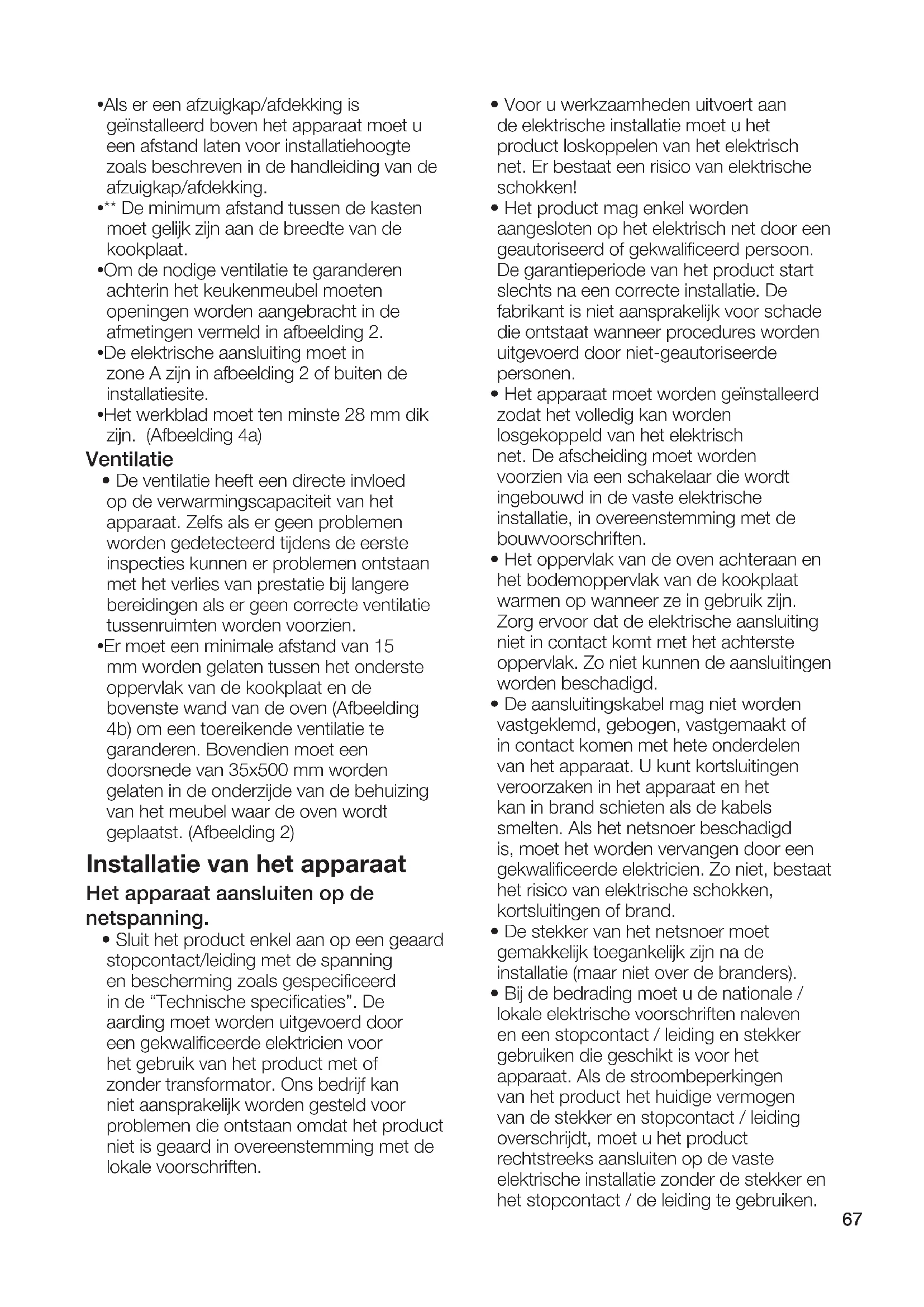 - * Als er geen afzuigkap is voorzien op het apparaat moet u een afstand van 750 mm laten tussen het oppervlak van de kookplaat en het meubel.67