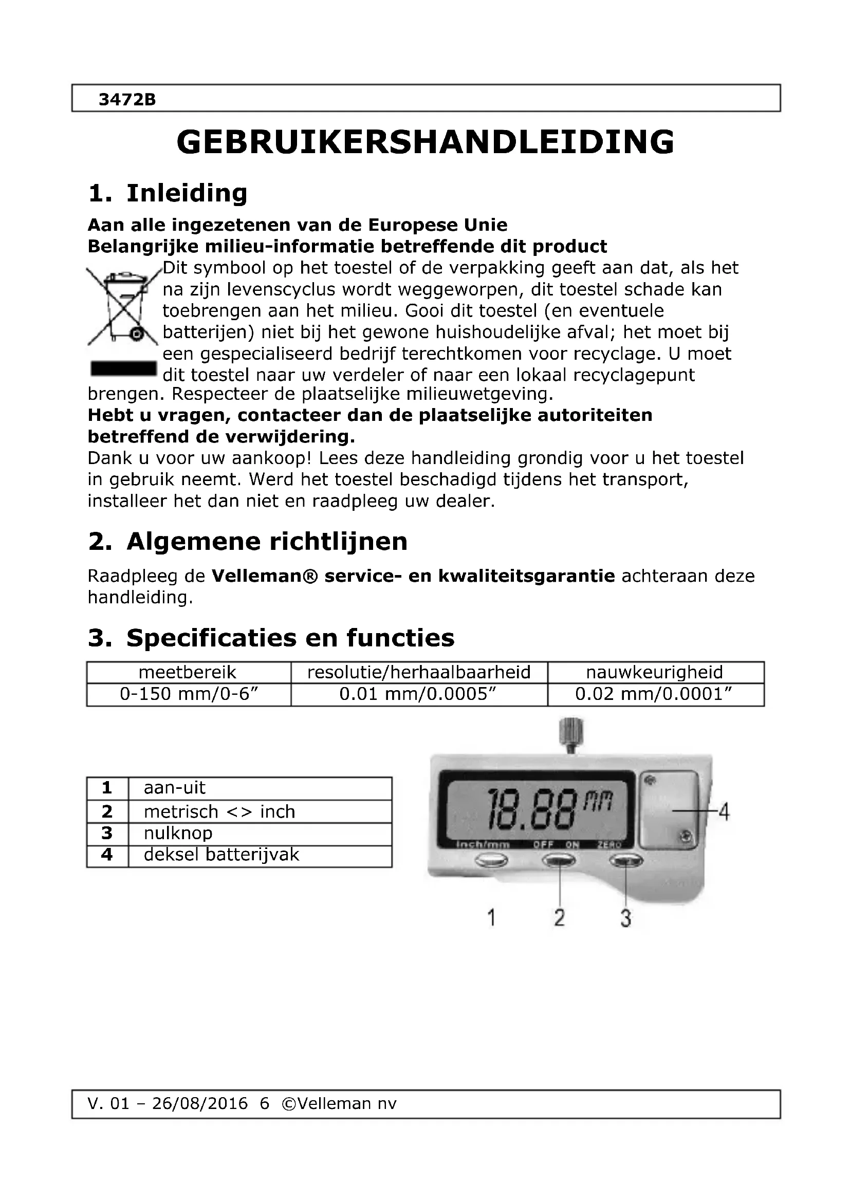Gebruik dit toestel enkel met originele accessoires. Velleman nv is niet aansprakelijk voor schade of kwetsuren bij (verkeerd) gebruik van dit toestel. Voor meer informatie over dit product en de laatste versie van deze handleiding, zie www.toolland.eu. De informatie in deze handleiding kan te allen tijde worden gewijzigd zonder voorafgaande kennisgeving. © AUTEURSRECHT Velleman nv heeft het auteursrecht voor deze handleiding. Alle wereldwijde rechten voorbehouden. Het is niet toegestaan om deze handleiding of gedeelten ervan over te nemen, te kopiëren, te vertalen, te bewerken en op te slaan op een elektronisch medium zonder voorafgaande schriftelijke toestemming van de rechthebbende.3472B