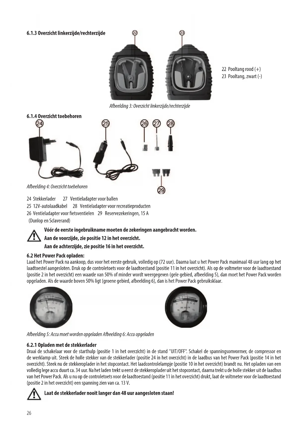 24 Stekkerlader 27 Ventieladapter voor ballen 25 12V-autolaadkabel 28 Ventieladapter voor recreatieproducten 26 Ventieladapter voor etsventielen 29 Reservezekeringen, 15 A (Dunlop en Sclaverand) Afbeelding 5: Accu moet worden opgeladen Afbeelding 6: Accu opgeladen Vóór de eerste ingebruikname moeten de zekeringen aangebracht worden. Aan de voorzijde, zie positie 12 in het overzicht. Aan de achterzijde, zie positie 16 in het overzicht. Laat de stekkerlader nooit langer dan 48 uur aangesloten staan! Laad het Power Pack na aankoop, dus voor het eerste gebruik, volledig op (72 uur). Daarna laat u het Power Pack maximaal 48 uur lang op het laadtoestel aangesloten. Druk op de controletoets voor de laadtoestand (positie 11 in het overzicht). Als op de voltmeter voor de laadtoestand (positie 2 in het overzicht) een waarde van 50% of minder wordt weergegeven (gele gebied, afbeelding 5), dan moet het Power Pack worden opgeladen. Als de waarde boven 50% ligt (groene gebied, afbeelding 6), dan is het Power Pack gebruiksklaar. Draai de schakelaar voor de starthulp (positie 1 in het overzicht) in de stand "UIT/OFF". Schakel de spanningsomvormer, de compressor en de werklamp uit. Steek de holle stekker van de stekkerlader (positie 24 in het overzicht) in de laadbus van het Power Pack (positie 14 in het overzicht). Steek nu de stekkeroplader in het stopcontact. Het laadcontrolelampje (positie 10 in het overzicht) brandt nu. Het opladen van een volledig lege accu duurt ca. 34 uur. Na het laden trekt u eerst de stekkeroplader uit het stopcontact, daarna trekt u de holle stekker uit de laadbus van het Power Pack. Als u nu op de controletoets voor de laadtoestand (positie 11 in het overzicht) drukt, laat de voltmeter voor de laadtoestand (positie 2 in het overzicht) een spanning zien van ca. 13 V.