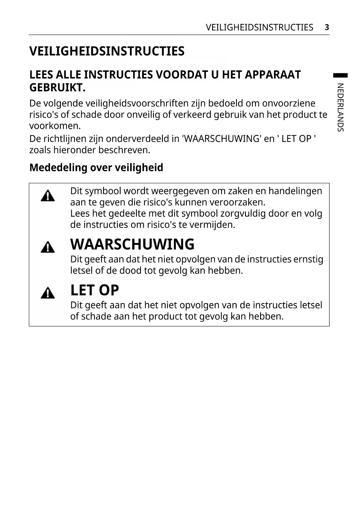 Deze handleiding kan afbeeldingen of inhoud bevatten die verschillen van het aangeschafte model. Deze handleiding is onderhevig aan herziening door de fabrikant. VEILIGHEIDSINSTRUCTIES LEES ALLE INSTRUCTIES VOORDAT U HET APPARAAT GEBRUIKT................3 WAARSCHUWINGSINSTRUCTIES......................................................................4