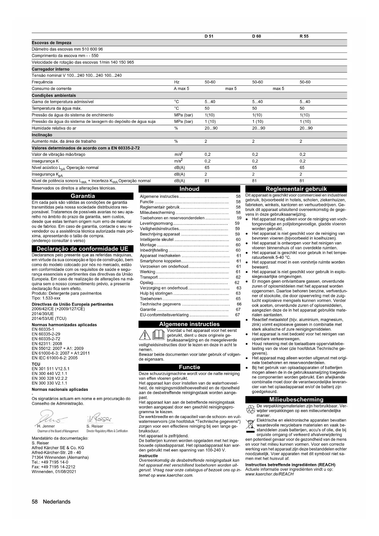 - Os signatários actuam em nome e em procuração do Conselho de Administração. Mandatário da documentação: S. Reiser Alfred Kärcher SE & Co. KG Alfred-Kärcher-Str. 28 - 40 71364 Winnenden (Alemanha) Tel.: +49 7195 14-0 Fax: +49 7195 14-2212 Winnenden, 01/08/2021 Inhoud Algemene instructies Voordat u het apparaat voor het eerst gebruikt, dient u deze originele ge- bruiksaanwijzing en de meegeleverde veiligheidsinstructies door te lezen en deze in acht te nemen. Bewaar beide documenten voor later gebruik of volgen- de eigenaars. Functie Deze schuurzuigmachine wordt voor de natte reiniging van effen vloeren gebruikt. Het apparaat kan door instellen van de waterhoeveel- heid, de reinigingsmiddelhoeveelheid en de rijsnelheid aan de desbetreffende reinigingstaak worden aange- past. Het apparaat kan aan de betreffende reinigingstaak worden aangepast door een geschikt reinigingspro- gramma te kiezen. De werkbreedte en de capaciteit van de schoon- en vuil- waterreservoirs (zie hoofdstuk "Technische gegevens") zorgen voor een effectieve reiniging bij een lange ge- bruiksduur. Het apparaat is zelfrijdend. De batterijen kunnen worden opgeladen met het inge- bouwde oplaadapparaat. Het oplaadapparaat kan wor- den gebruikt met een spanning van 100-240 V. Instructie Overeenkomstig de desbetreffende reinigingstaak kan het apparaat met verschillend toebehoren worden uit- gerust. Vraag naar onze catalogus of bezoek ons op in- ternet op www.kaercher.com. Reglementair gebruik Dit apparaat is geschikt voor commercieel en industrieel gebruik, bijvoorbeeld in hotels, scholen, ziekenhuizen, fabrieken, winkels, kantoren en verhuurbedrijven. Ge- bruik dit apparaat uitsluitend overeenkomstig de gege- vens in deze gebruiksaanwijzing. ● Het apparaat mag alleen voor de reiniging van voch- tongevoelige en polijstongevoelige, gladde vloeren worden gebruikt. ● Het apparaat is niet geschikt voor de reiniging van bevroren vloeren (bijvoorbeeld in koelhuizen). ● Het apparaat is ontworpen voor het reinigen van vloeren binnenshuis of van overdekte ruimten. ● Het apparaat is geschikt voor gebruik in het tempe- ratuurbereik 5-40 °C. ● Het apparaat moet in een vorstvrije ruimte worden bewaard. ● Het apparaat is niet geschikt voor gebruik in explo- siegevaarlijke omgevingen. ● Er mogen geen ontvlambare gassen, onverdunde zuren of oplosmiddelen met het apparaat worden opgenomen. Daartoe behoren benzine, verfverdun- ner of stookolie, die door opwerveling met de zuig- lucht explosieve mengsels kunnen vormen. Verder ook aceton, onverdunde zuren of oplosmiddelen, aangezien deze de in het apparaat gebruikte mate- rialen aantasten. ● Reactief metaalstof (bijv. aluminium, magnesium, zink) vormt explosieve gassen in combinatie met sterk alkalische of zure reinigingsmiddelen. ● Het apparaat is niet bedoeld voor het reinigen van openbare verkeerswegen. ● Houd rekening met de toelaatbare oppervlaktebe- lasting van de vloer (zie hoofdstuk Technische ge- gevens). ● Het apparaat mag alleen worden uitgerust met origi- nele toebehoren en reserveonderdelen. ● Bij het gebruik van oplaadapparaten of batterijen mogen alleen de in de gebruiksaanwijzing toegesta- ne componenten worden gebruikt. Een afwijkende combinatie moet door de verantwoordelijke leveran- cier van het oplaadapparaat en/of de batterij zijn goedgekeurd. Milieubescherming De verpakkingsmaterialen zijn herbruikbaar. Ver- wijder verpakkingen op een milieuvriendelijke manier. Elektrische en elektronische apparaten bevatten waardevolle recyclebare materialen en vaak be- standdelen zoals batterijen, accu's of olie, die bij onjuiste omgang of verkeerd afvalverwijdering een potentieel gevaar voor de gezondheid van de mens en voor het milieu kunnen vormen. Voor een correcte werking van het apparaat zijn deze bestanddelen echter noodzakelijk. Voer apparaten met dit symbool niet sa- men met het huisvuil af. Instructies betreffende ingrediënten (REACH) Actuele informatie over ingrediënten vindt u op: www.kaercher.de/REACH Escovas de limpeza Diâmetro das escovas mm 510 600 96 Comprimento da escova mm - - 550 Velocidade de rotação das escovas 1/min 140 150 965 Carregador interno Tensão nominal V 100 p. 240
