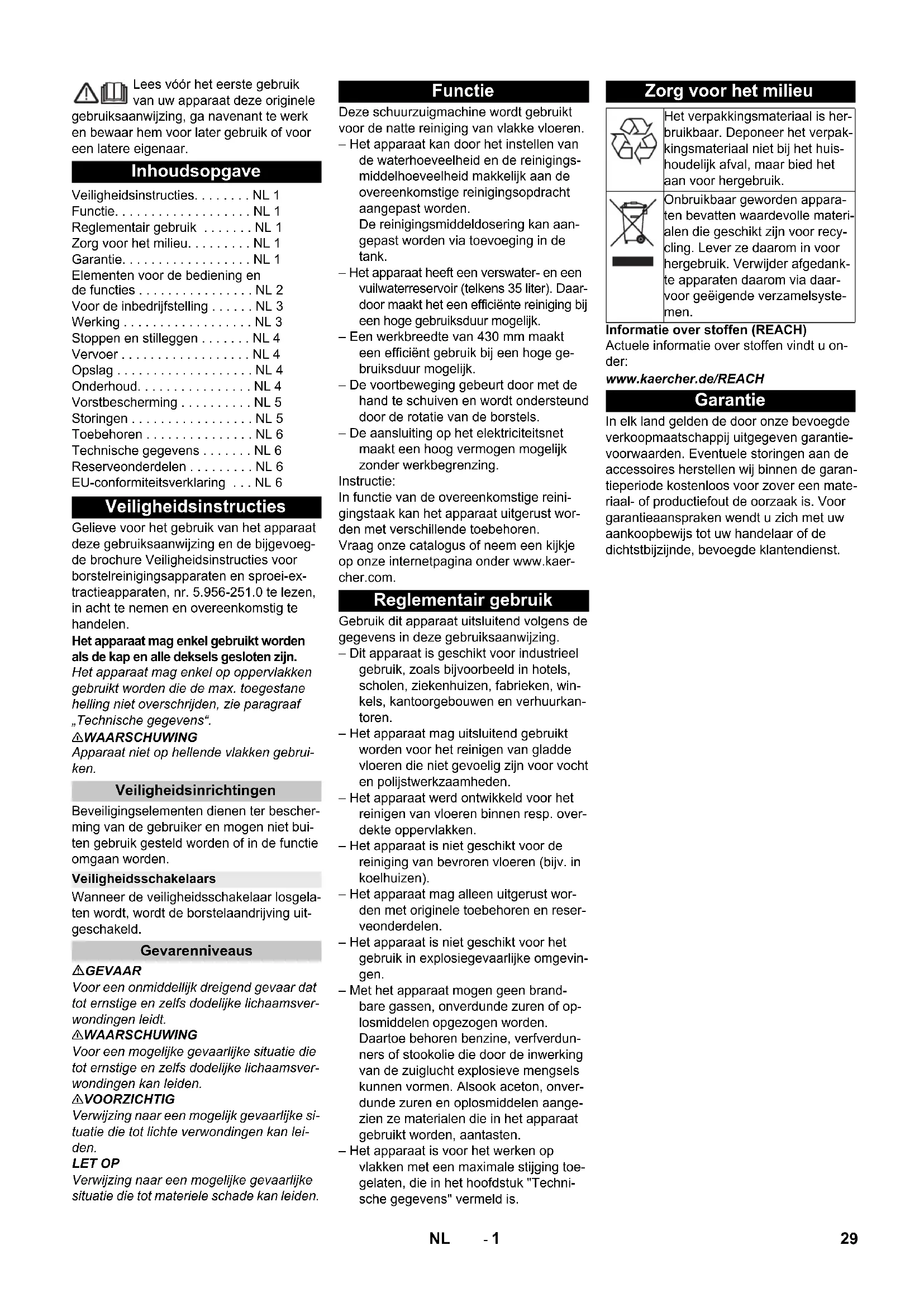Chairman of the Board of Management Director Regulatory Affairs & Certification 28 IT- 1 Lees vóór het eerste gebruik van uw apparaat deze originele gebruiksaanwijzing, ga navenant te werk en bewaar hem voor later gebruik of voor een latere eigenaar. Gelieve voor het gebruik van het apparaat deze gebruiksaanwijzing en de bijgevoeg- de brochure Veiligheidsinstructies voor borstelreinigingsapparaten en sproei-ex- tractieapparaten, nr. 5.956-251.0 te lezen, in acht te nemen en overeenkomstig te handelen. Het apparaat mag enkel gebruikt worden als de kap en alle deksels gesloten zijn. Het apparaat mag enkel op oppervlakken gebruikt worden die de max. toegestane helling niet overschrijden, zie paragraaf „Technische gegevens“. 몇 WAARSCHUWING Apparaat niet op hellende vlakken gebrui- ken. Beveiligingselementen dienen ter bescher- ming van de gebruiker en mogen niet bui- ten gebruik gesteld worden of in de functie omgaan worden. Wanneer de veiligheidsschakelaar losgela- ten wordt, wordt de borstelaandrijving uit- geschakeld. GEVAAR Voor een onmiddellijk dreigend gevaar dat tot ernstige en zelfs dodelijke lichaamsver- wondingen leidt. 몇 WAARSCHUWING Voor een mogelijke gevaarlijke situatie die tot ernstige en zelfs dodelijke lichaamsver- wondingen kan leiden. 몇 VOORZICHTIG Verwijzing naar een mogelijk gevaarlijke si- tuatie die tot lichte verwondingen kan lei- den. LET OP Verwijzing naar een mogelijke gevaarlijke situatie die tot materiele schade kan leiden. Deze schuurzuigmachine wordt gebruikt voor de natte reiniging van vlakke vloeren. – Het apparaat kan door het instellen van de waterhoeveelheid en de reinigings- middelhoeveelheid makkelijk aan de overeenkomstige reinigingsopdracht aangepast worden. De reinigingsmiddeldosering kan aan- gepast worden via toevoeging in de tank. – Het apparaat heeft een verswater- en een vuilwaterreservoir (telkens 35 liter). Daar- door maakt het een efficiënte reiniging bij een hoge gebruiksduur mogelijk. – Een werkbreedte van 430 mm maakt een efficiënt gebruik bij een hoge ge- bruiksduur mogelijk. – De voortbeweging gebeurt door met de hand te schuiven en wordt ondersteund door de rotatie van de borstels. – De aansluiting op het elektriciteitsnet maakt een hoog vermogen mogelijk zonder werkbegrenzing. Instructie: In functie van de overeenkomstige reini- gingstaak kan het apparaat uitgerust wor- den met verschillende toebehoren. Vraag onze catalogus of neem een kijkje op onze internetpagina onder www.kaer- cher.com. Gebruik dit apparaat uitsluitend volgens de gegevens in deze gebruiksaanwijzing. – Dit apparaat is geschikt voor industrieel gebruik, zoals bijvoorbeeld in hotels, scholen, ziekenhuizen, fabrieken, win- kels, kantoorgebouwen en verhuurkan- toren. – Het apparaat mag uitsluitend gebruikt worden voor het reinigen van gladde vloeren die niet gevoelig zijn voor vocht en polijstwerkzaamheden. – Het apparaat werd ontwikkeld voor het reinigen van vloeren binnen resp. over- dekte oppervlakken. – Het apparaat is niet geschikt voor de reiniging van bevroren vloeren (bijv. in koelhuizen). – Het apparaat mag alleen uitgerust wor- den met originele toebehoren en reser- veonderdelen. – Het apparaat is niet geschikt voor het gebruik in explosiegevaarlijke omgevin- gen. – Met het apparaat mogen geen brand- bare gassen, onverdunde zuren of op- losmiddelen opgezogen worden. Daartoe behoren benzine, verfverdun- ners of stookolie die door de inwerking van de zuiglucht explosieve mengsels kunnen vormen. Alsook aceton, onver- dunde zuren en oplosmiddelen aange- zien ze materialen die in het apparaat gebruikt worden, aantasten. – Het apparaat is voor het werken op vlakken met een maximale stijging toe- gelaten, die in het hoofdstuk "Techni- sche gegevens" vermeld is. Informatie over stoffen (REACH) Actuele informatie over stoffen vindt u on- der: www.kaercher.de/REACH In elk land gelden de door onze bevoegde verkoopmaatschappij uitgegeven garantie- voorwaarden. Eventuele storingen aan de accessoires herstellen wij binnen de garan- tieperiode kostenloos voor zover een mate- riaal- of productiefout de oorzaak is. Voor garantieaanspraken wendt u zich met uw aankoopbewijs tot uw handelaar of de dichtstbijzijnde, bevoegde klantendienst. Inhoudsopgave Veiligheidsinstructies. . . . . . . . NL 1 Functie. . . . . . . . . . . . . . . . . . . NL 1 Reglementair gebruik . . . . . . . NL 1 Zorg voor het milieu. . . . . . . . . NL 1 Garantie. . . . . . . . . . . . . . . . . . NL 1 Elementen voor de bediening en de functies . . . . . . . . . . . . . . . . NL 2 Voor de inbedrijfstelling . . . . . . NL 3 Werking . . . . . . . . . . . . . . . . . . NL 3 Stoppen en stilleggen . . . . . . . NL 4 Vervoer . . . . . . . . . . . . . . . . . . NL 4 Opslag . . . . . . . . . . . . . . . . . . . NL 4 Onderhoud. . . . . . . . . . . . . . . . NL 4 Vorstbescherming . . . . . . . . . . NL 5 Storingen . . . . . . . . . . . . . . . . . NL 5 Toebehoren . . . . . . . . . . . . . . . NL 6 Technische gegevens . . . . . . . NL 6 Reserveonderdelen . . . . . . . . . NL 6 EU-conformiteitsverklaring . . . NL 6 Veiligheidsinstructies Veiligheidsinrichtingen Veiligheidsschakelaars Gevarenniveaus Functie Reglementair gebruik Zorg voor het milieu Het verpakkingsmateriaal is her- bruikbaar. Deponeer het verpak- kingsmateriaal niet bij het huis- houdelijk afval, maar bied het aan voor hergebruik. Onbruikbaar geworden appara- ten bevatten waardevolle materi- alen die geschikt zijn voor recy- cling. Lever ze daarom in voor hergebruik. Verwijder afgedank- te apparaten daarom via daar- voor geëigende verzamelsyste- men. Garantie 29NL- 2 1 Pluizenzeef 2 Veiligheidsschakelaar 3 Aftapslang vuil water met doseerinrich- ting 4 Steunrail voor Homebase 5 Vlotter 6 Schoonwaterreservoir 7 Vergrendeling schoonwaterreservoir 8 Greep 9 Reinigingskop 10 Schijfborstel 11 Vulopening verswaterreservoir 12 Beugel borstelvervanging 13 Vuilwaterreservoir 14 Peilindicatie schoon water 15 Draaiende handgree