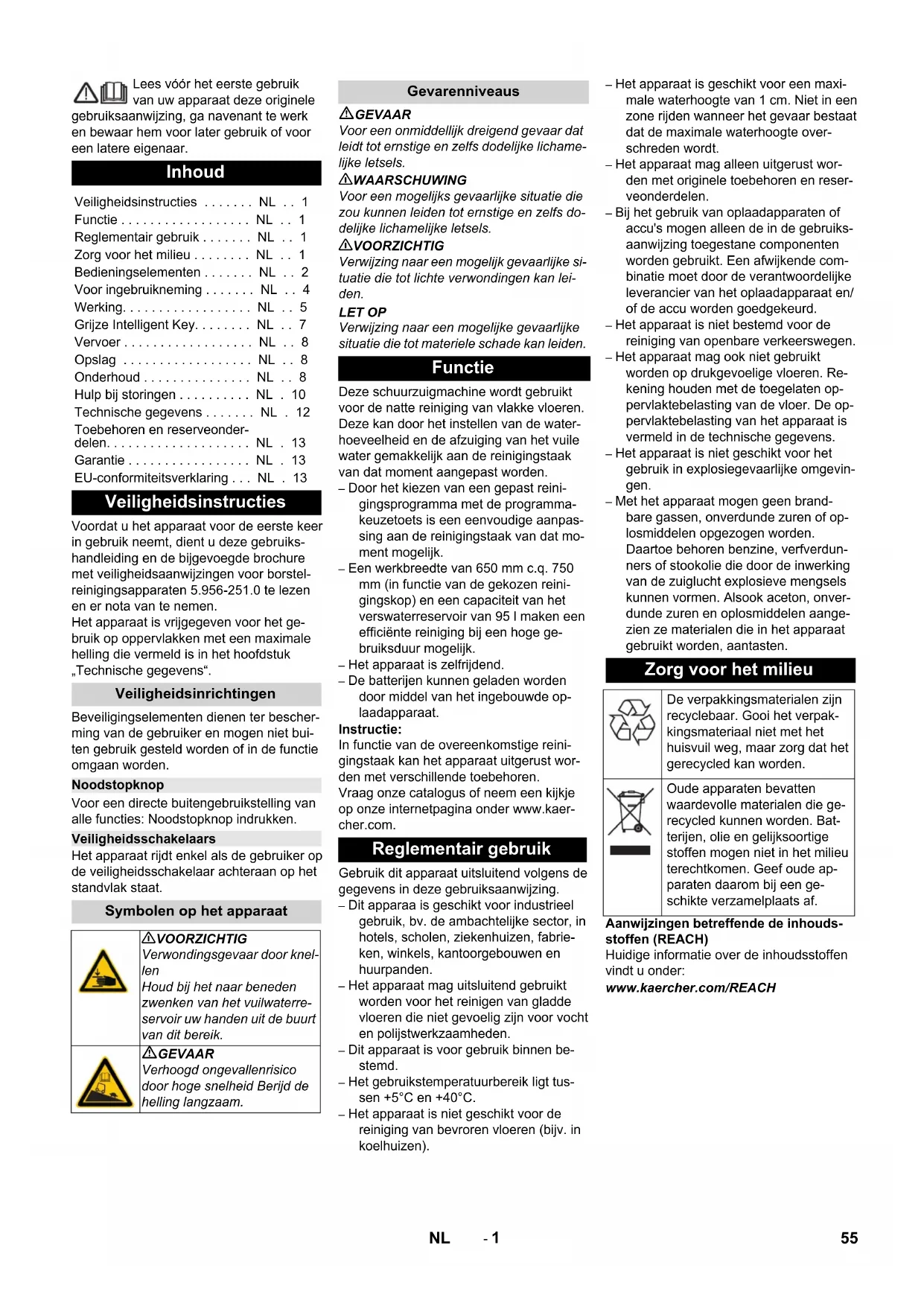 Chairman of the Board of Management Director Regulatory Affairs & Certification 54 IT- 1 Lees vóór het eerste gebruik van uw apparaat deze originele gebruiksaanwijzing, ga navenant te werk en bewaar hem voor later gebruik of voor een latere eigenaar. Voordat u het apparaat voor de eerste keer in gebruik neemt, dient u deze gebruiks- handleiding en de bijgevoegde brochure met veiligheidsaanwijzingen voor borstel- reinigingsapparaten 5.956-251.0 te lezen en er nota van te nemen. Het apparaat is vrijgegeven voor het ge- bruik op oppervlakken met een maximale helling die vermeld is in het hoofdstuk „Technische gegevens“. Beveiligingselementen dienen ter bescher- ming van de gebruiker en mogen niet bui- ten gebruik gesteld worden of in de functie omgaan worden. Voor een directe buitengebruikstelling van alle functies: Noodstopknop indrukken. Het apparaat rijdt enkel als de gebruiker op de veiligheidsschakelaar achteraan op het standvlak staat. GEVAAR Voor een onmiddellijk dreigend gevaar dat leidt tot ernstige en zelfs dodelijke lichame- lijke letsels. 몇 WAARSCHUWING Voor een mogelijks gevaarlijke situatie die zou kunnen leiden tot ernstige en zelfs do- delijke lichamelijke letsels. 몇 VOORZICHTIG Verwijzing naar een mogelijk gevaarlijke si- tuatie die tot lichte verwondingen kan lei- den. LET OP Verwijzing naar een mogelijke gevaarlijke situatie die tot materiele schade kan leiden. Deze schuurzuigmachine wordt gebruikt voor de natte reiniging van vlakke vloeren. Deze kan door het instellen van de water- hoeveelheid en de afzuiging van het vuile water gemakkelijk aan de reinigingstaak van dat moment aangepast worden. – Door het kiezen van een gepast reini- gingsprogramma met de programma- keuzetoets is een eenvoudige aanpas- sing aan de reinigingstaak van dat mo- ment mogelijk. – Een werkbreedte van 650 mm c.q. 750 mm (in functie van de gekozen reini- gingskop) en een capaciteit van het verswaterreservoir van 95 l maken een efficiënte reiniging bij een hoge ge- bruiksduur mogelijk. – Het apparaat is zelfrijdend. – De batterijen kunnen geladen worden door middel van het ingebouwde op- laadapparaat. Instructie: In functie van de overeenkomstige reini- gingstaak kan het apparaat uitgerust wor- den met verschillende toebehoren. Vraag onze catalogus of neem een kijkje op onze internetpagina onder www.kaer- cher.com. Gebruik dit apparaat uitsluitend volgens de gegevens in deze gebruiksaanwijzing. – Dit apparaa is geschikt voor industrieel gebruik, bv. de ambachtelijke sector, in hotels, scholen, ziekenhuizen, fabrie- ken, winkels, kantoorgebouwen en huurpanden. – Het apparaat mag uitsluitend gebruikt worden voor het reinigen van gladde vloeren die niet gevoelig zijn voor vocht en polijstwerkzaamheden. – Dit apparaat is voor gebruik binnen be- stemd. – Het gebruikstemperatuurbereik ligt tus- sen +5°C en +40°C. – Het apparaat is niet geschikt voor de reiniging van bevroren vloeren (bijv. in koelhuizen). – Het apparaat is geschikt voor een maxi- male waterhoogte van 1 cm. Niet in een zone rijden wanneer het gevaar bestaat dat de maximale waterhoogte over- schreden wordt. – Het apparaat mag alleen uitgerust wor- den met originele toebehoren en reser- veonderdelen. – Bij het gebruik van oplaadapparaten of accu's mogen alleen de in de gebruiks- aanwijzing toegestane componenten worden gebruikt. Een afwijkende com- binatie moet door de verantwoordelijke leverancier van het oplaadapparaat en/ of de accu worden goedgekeurd. – Het apparaat is niet bestemd voor de reiniging van openbare verkeerswegen. – Het apparaat mag ook niet gebruikt worden op drukgevoelige vloeren. Re- kening houden met de toegelaten op- pervlaktebelasting van de vloer. De op- pervlaktebelasting van het apparaat is vermeld in de technische gegevens. – Het apparaat is niet geschikt voor het gebruik in explosiegevaarlijke omgevin- gen. – Met het apparaat mogen geen brand- bare gassen, onverdunde zuren of op- losmiddelen opgezogen worden. Daartoe behoren benzine, verfverdun- ners of stookolie die door de inwerking van de zuiglucht explosieve mengsels kunnen vormen. Alsook aceton, onver- dunde zuren en oplosmiddelen aange- zien ze materialen die in het apparaat gebruikt worden, aantasten. Aanwijzingen betreffende de inhouds- stoffen (REACH) Huidige informatie over de inhoudsstoffen vindt u onder: www.kaercher.com/REACH Inhoud Veiligheidsinstructies . . . . . . . NL . . 1 Functie . . . . . . . . . . . . . . . . . . NL . . 1 Reglementair gebruik . . . . . . . NL . . 1 Zorg voor het milieu . . . . . . . . NL . . 1 Bedieningselementen . . . . . . . NL . . 2 Voor ingebruikneming . . . . . . . NL . . 4 Werking. . . . . . . . . . . . . . . . . . NL . . 5 Grijze Intelligent Key. . . . . . . . NL . . 7 Vervoer . . . . . . . . . . . . . . . . . . NL . . 8 Opslag . . . . . . . . . . . . . . . . . . NL . . 8 Onderhoud . . . . . . . . . . . . . . . NL . . 8 Hulp bij storingen . . . . . . . . . . NL . 10 Technische gegevens . . . . . . . NL . 12 Toebehoren en reserveonder- delen. . . . . . . . . . . . . . . . . . . . NL . 13 Garantie . . . . . . . . . . . . . . . . . NL . 13 EU-conformiteitsverklaring . . . NL . 13 Veiligheidsinstructies Veiligheidsinrichtingen Noodstopknop Veiligheidsschakelaars Symbolen op het apparaat 몇 VOORZICHTIG Verwondingsgevaar door knel- len Houd bij het naar beneden zwenken van het vuilwaterre- servoir uw handen uit de buurt van dit bereik. GEVAAR Verhoogd ongevallenrisico door hoge snelheid Berijd de helling langzaam. Gevarenniveaus Functie Reglementair gebruik Zorg voor het milieu De verpakkingsmaterialen zijn recyclebaar. Gooi het verpak- kingsmateriaal niet met het huisvuil weg, maar zorg dat het gerecycled kan worden. Oude apparaten bevatten waardevolle materialen die ge- recycled kunnen worden. Bat- terijen, olie en gelijksoortige stoffen mogen niet in het milieu terechtkomen. Geef oude ap- paraten daarom bij een ge- schikte verzamelplaats af. 55NL- 2 1 Stuurwiel 2 Vulsysteem 3
