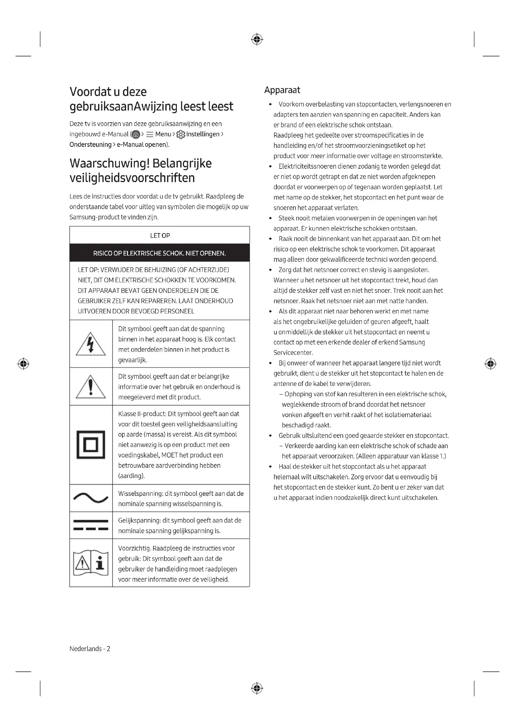 - Per la vostra sicurezza, non dovete tentare di rimuovere la batteria. Una rimozione non corretta potrebbe causare danni alla batteria e al dispositivo, provocare infortuni e/o rendere il dispositivo non sicuro. Italiano - 8Questa pagina è stata lasciata intenzionalmente vuota.Voordat u deze gebruiksaanAwijzing leest leest Deze tv is voorzien van deze gebruiksaanwijzing en een ingebouwd e-Manual ( > Menu > Instellingen > Ondersteuning > e-Manual openen). Waarschuwing! Belangrijke veiligheidsvoorschriften Lees de instructies door voordat u de tv gebruikt. Raadpleeg de onderstaande tabel voor uitleg van symbolen die mogelijk op uw Samsung-product te vinden zijn. LET OP RISICO OP ELEKTRISCHE SCHOK. NIET OPENEN. LET OP: VERWIJDER DE BEHUIZING (OF ACHTERZIJDE) NIET, DIT OM ELEKTRISCHE SCHOKKEN TE VOORKOMEN. DIT APPARAAT BEVAT GEEN ONDERDELEN DIE DE