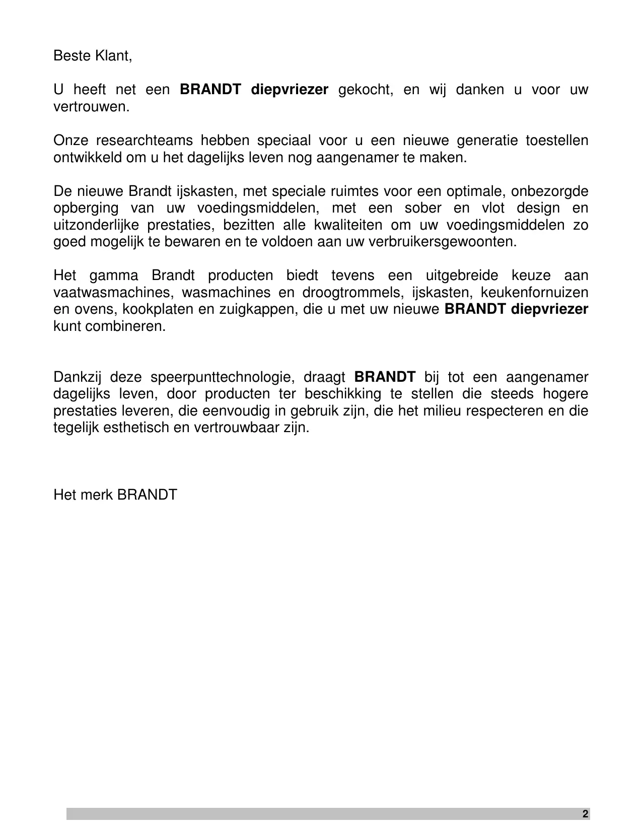 Beste Klant, U heeft net een BRANDT diepvriezer gekocht, en wij danken u voor uw vertrouwen. Onze researchteams hebben speciaal voor u een nieuwe generatie toestellen ontwikkeld om u het dagelijks leven nog aangenamer te maken. De nieuwe Brandt ijskasten, met speciale ruimtes voor een optimale, onbezorgde opberging van uw voedingsmiddelen, met een sober en vlot design en uitzonderlijke prestaties, bezitten alle kwaliteiten om uw voedingsmiddelen zo goed mogelijk te bewaren en te voldoen aan uw verbruikersgewoonten. Het gamma Brandt producten biedt tevens een uitgebreide keuze aan vaatwasmachines, wasmachines en droogtrommels, ijskasten, keukenfornuizen en ovens, kookplaten en zuigkappen, die u met uw nieuwe BRANDT diepvriezer kunt combineren. Dankzij deze speerpunttechnologie, draagt BRANDT bij tot een aangenamer dagelijks leven, door producten ter beschikking te stellen die steeds hogere prestaties leveren, die eenvoudig in gebruik zijn, die het milieu respecteren en die tegelijk esthetisch en vertrouwbaar zijn. Het merk BRANDT