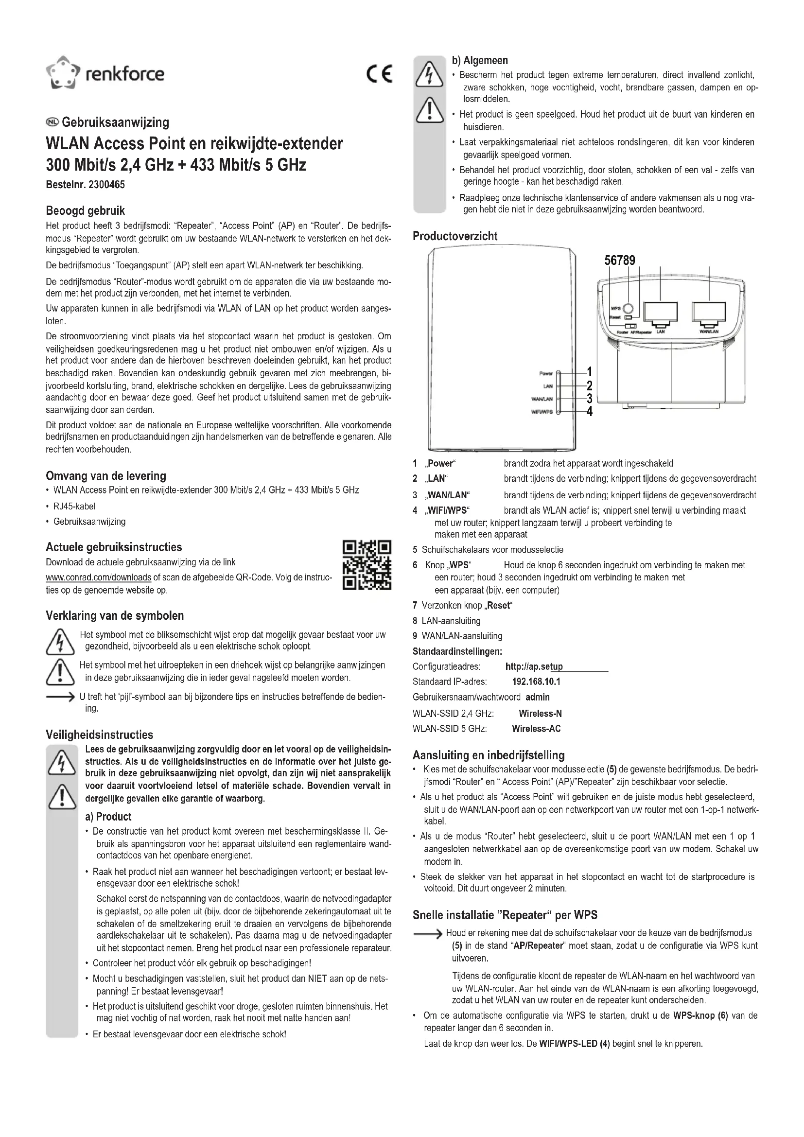 - WLAN Access Point en reikwijdte-extender 300 Mbit/s 2,4 GHz + 433 Mbit/s 5 GHz• RJ45-kabel• Gebruiksaanwijzing Actuele gebruiksinstructies Download de actuele gebruiksaanwijzing via de link www.conrad.com/downloads of scan de afgebeelde QR-Code. Volg de instruc- ties op de genoemde website op. Verklaring van de symbolen Het symbool met de bliksemschicht wijst erop dat mogelijk gevaar bestaat voor uw gezondheid, bijvoorbeeld als u een elektrische schok oploopt. Het symbool met het uitroepteken in een driehoek wijst op belangrijke aanwijzingen in deze gebruiksaanwijzing die in ieder geval nageleefd moeten worden. U treft het ‘pijl’-symbool aan bij bijzondere tips en instructies betreffende de bedien- ing. Veiligheidsinstructies Lees de gebruiksaanwijzing zorgvuldig door en let vooral op de veiligheidsin-structies. Als u de veiligheidsinstructies en de informatie over het juiste ge-bruik in deze gebruiksaanwijzing niet opvolgt, dan zijn wij niet aansprakelijk voor daaruit voortvloeiend letsel of materiële schade. Bovendien vervalt in dergelijke gevallen elke garantie of waarborg. a) Product