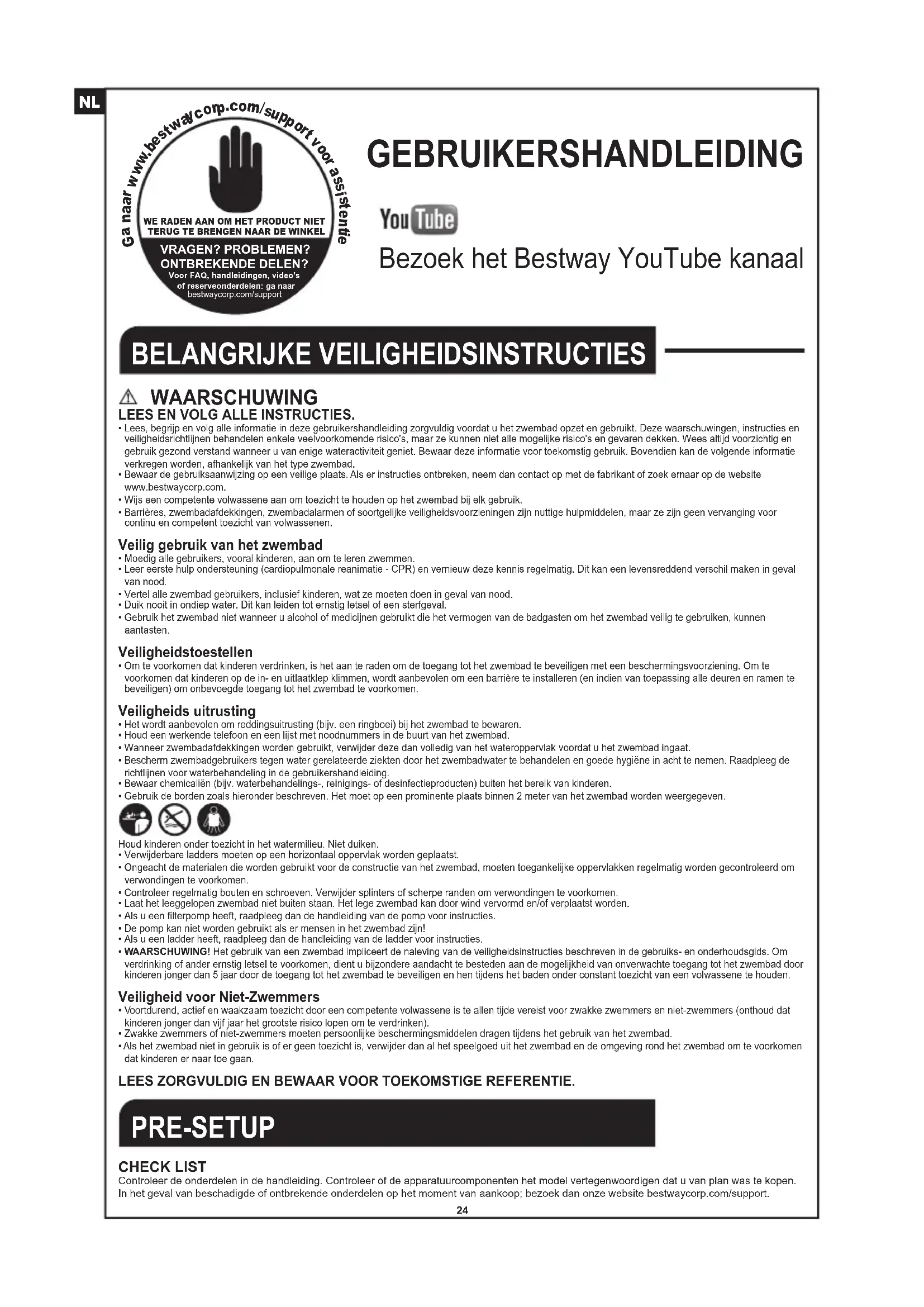 - Als het zwembad niet in gebruik is of er geen toezicht is, verwijder dan al het speelgoed uit het zwembad en de omgeving rond het zwembad om te voorkomen dat kinderen er naar toe gaan.LEES ZORGVULDIG EN BEWAAR VOOR TOEKOMSTIGE REFERENTIE.CHECK LIST Controleer de onderdelen in de handleiding. Controleer of de apparatuurcomponenten het model vertegenwoordigen dat u van plan was te kopen. In het geval van beschadigde of ontbrekende onderdelen op het moment van aankoop; bezoek dan onze website bestwaycorp.com/support. PRE-SETUP BELANGRIJKE VEILIGHEIDSINSTRUCTIES