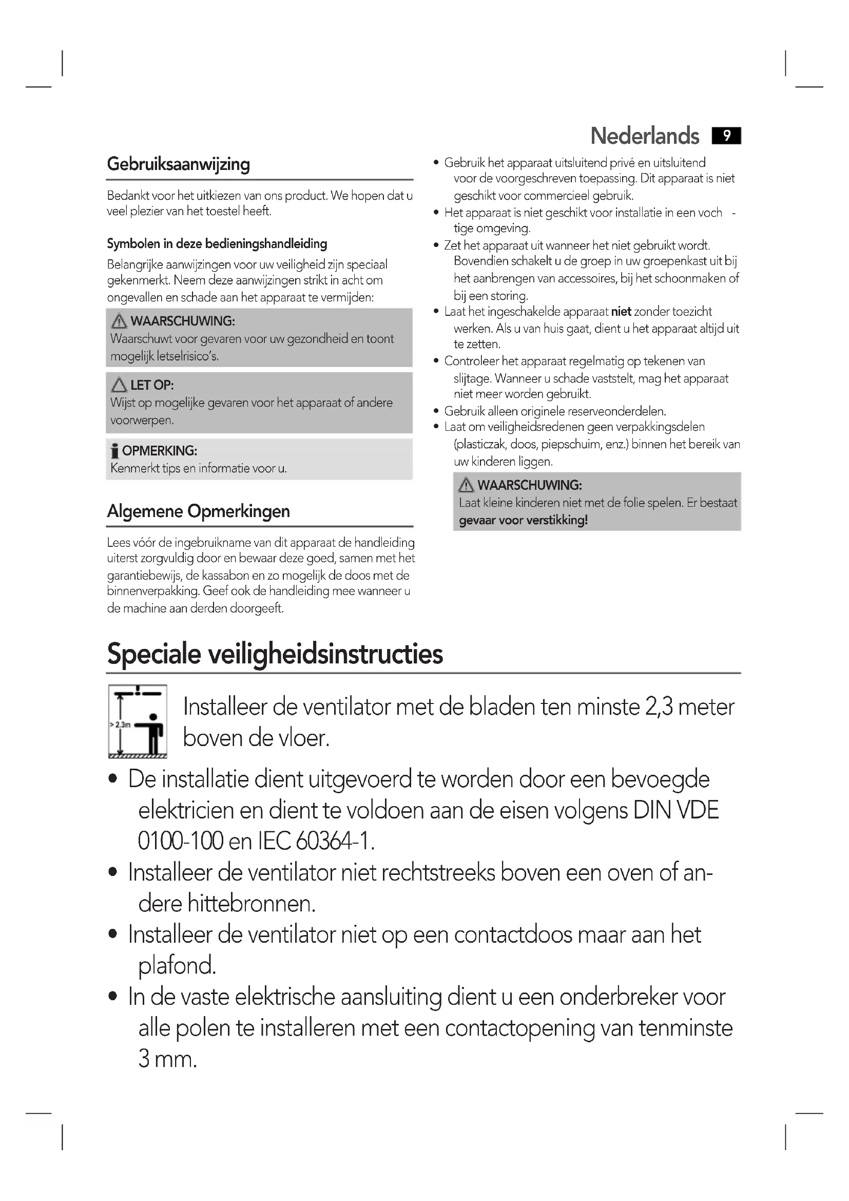 Gebruiksaanwijzing Bedankt voor het uitkiezen van ons product. We hopen dat u veel plezier van het toestel heeft.Symbolen in deze bedieningshandleidingBelangrijke aanwijzingen voor uw veiligheid zijn speciaal gekenmerkt. Neem deze aanwijzingen strikt in acht om ongevallen en schade aan het apparaat te vermijden: WAARSCHUWING: Waarschuwt voor gevaren voor uw gezondheid en toont mogelijk letselrisico’s. LET OP: Wijst op mogelijke gevaren voor het apparaat of andere voorwerpen. OPMERKING: Kenmerkt tips en informatie voor u. Algemene Opmerkingen Lees vóór de ingebruikname van dit apparaat de handleiding uiterst zorgvuldig door en bewaar deze goed, samen met het garantiebewijs, de kassabon en zo mogelijk de doos met de binnenverpakking. Geef ook de handleiding mee wanneer u de machine aan derden doorgeeft.• Gebruik het apparaat uitsluitend privé en uitsluitend voor de voorgeschreven toepassing. Dit apparaat is niet geschikt voor commercieel gebruik.• Het apparaat is niet geschikt voor installatie in een voch tige omgeving.• Zet het apparaat uit wanneer het niet gebruikt wordt. Bovendien schakelt u de groep in uw groepenkast uit bij het aanbrengen van accessoires, bij het schoonmaken of bij een storing.• Laat het ingeschakelde apparaat niet zonder toezicht werken. Als u van huis gaat, dient u het apparaat altijd uit te zetten.• Controleer het apparaat regelmatig op tekenen van slijtage. Wanneer u schade vaststelt, mag het apparaat niet meer worden gebruikt.• Gebruik alleen originele reserveonderdelen.• Laat om veiligheidsredenen geen verpakkingsdelen (plasticzak, doos, piepschuim, enz.) binnen het bereik van uw kinderen liggen. WAARSCHUWING: Laat kleine kinderen niet met de folie spelen. Er bestaat gevaar voor verstikking! Speciale veiligheidsinstructies Installeer de ventilator met de bladen ten minste 2,3 meter boven de vloer.