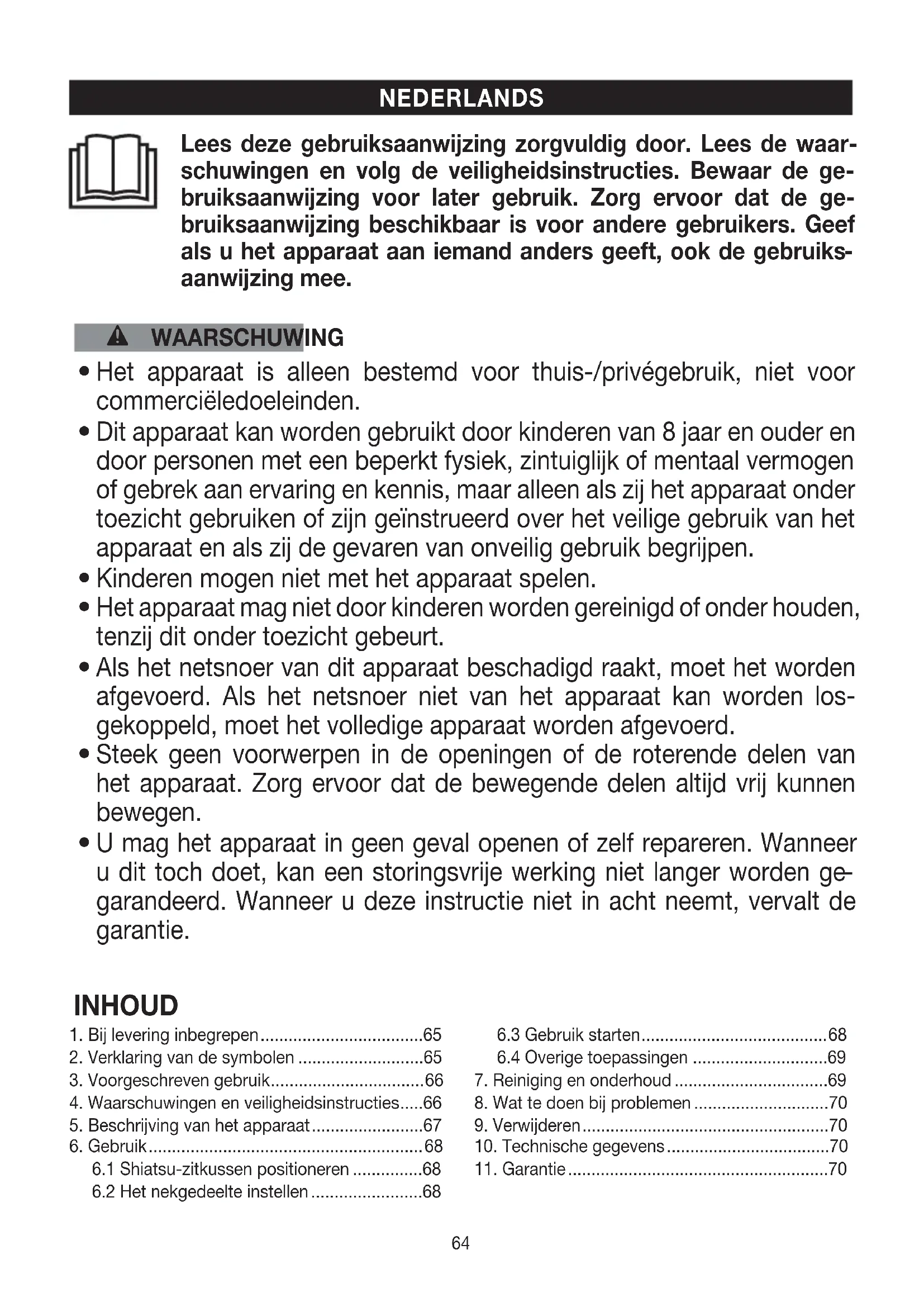 Dit apparaat is uitsluitend bedoeld voor het masseren van de rug en de nek van mensen. Gebruik van het apparaat is geen vervanging voor een medische behandeling. Gebruik het massageapparaat niet als een of meer van de volgende punten op u van toepassing zijn. WAARSCHUWING Gebruik het massageapparaat