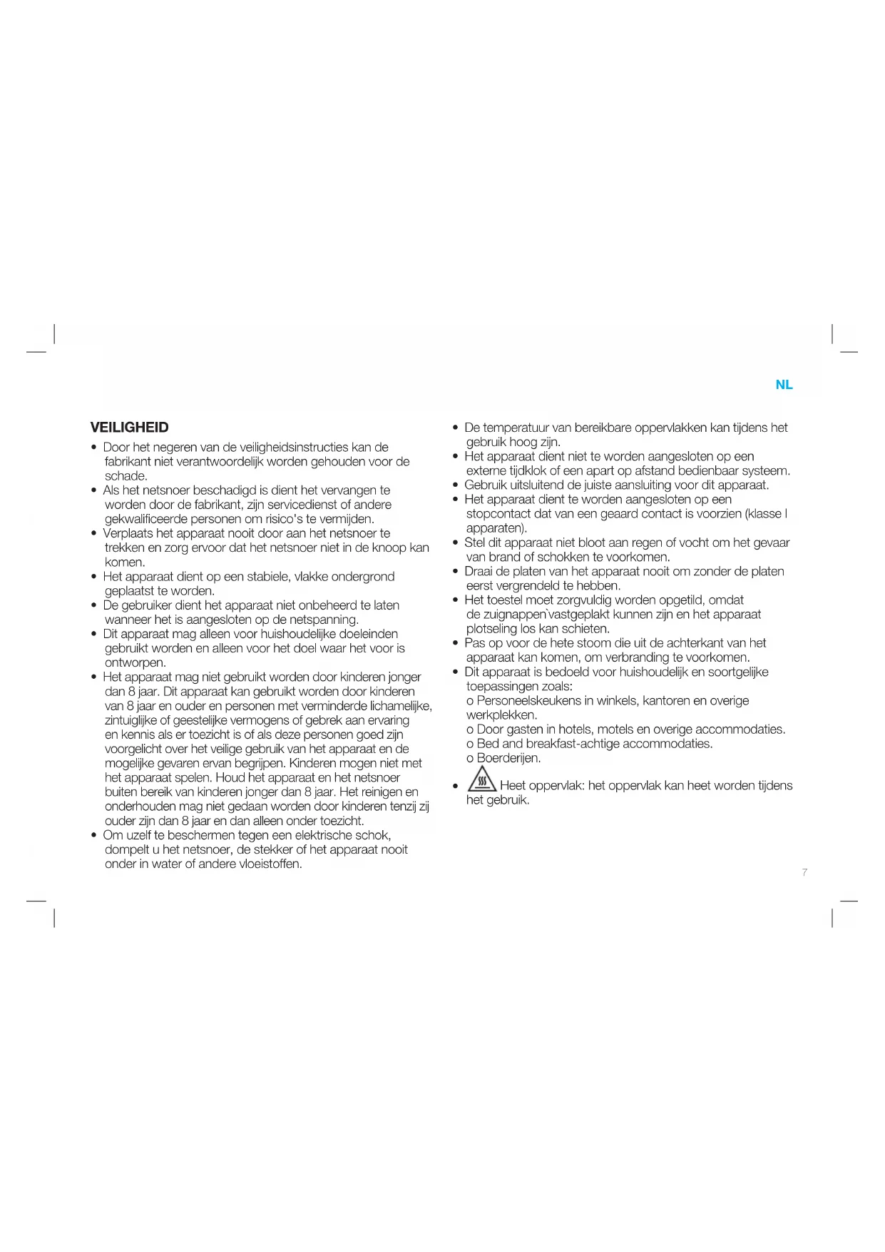 - Het apparaat mag niet gebruikt worden door kinderen jonger dan 8 jaar. Dit apparaat kan gebruikt worden door kinderen van 8 jaar en ouder en personen met verminderde lichamelijke, zintuiglijke of geestelijke vermogens of gebrek aan ervaring en kennis als er toezicht is of als deze personen goed zijn voorgelicht over het veilige gebruik van het apparaat en de mogelijke gevaren ervan begrijpen. Kinderen mogen niet met het apparaat spelen. Houd het apparaat en het netsnoer buiten bereik van kinderen jonger dan 8 jaar. Het reinigen en onderhouden mag niet gedaan worden door kinderen tenzij zij ouder zijn dan 8 jaar en dan alleen onder toezicht.