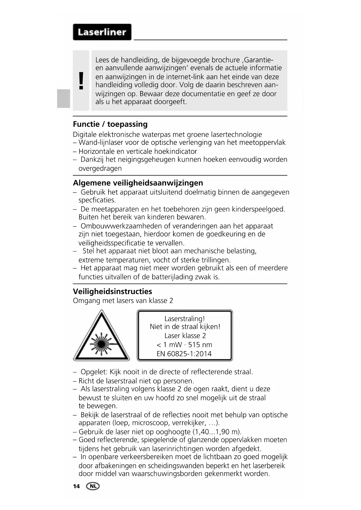 Goed reecterende, spiegelende of glanzende oppervlakken moeten tijdens het gebruik van laserinrichtingen worden afgedekt. – In openbare verkeersbereiken moet de lichtbaan zo goed mogelijk door afbakeningen en scheidingswanden beperkt en het laserbereik door middel van waarschuwingsborden gekenmerkt worden. Laserstraling! Niet in de straal kijken! Laser klasse 2 < 1 mW · 515 nm EN 60825-1:2014 Digitale elektronische waterpas met groene lasertechnologie – Wand-lijnlaser voor de optische verlenging van het meetoppervlak – Horizontale en verticale hoekindicator – Dankzij het neigingsgeheugen kunnen hoeken eenvoudig worden overgedragen Functie / toepassing Lees de handleiding, de bijgevoegde brochure ‚Garantie- en aanvullende aanwijzingen‘ evenals de actuele informatie en aanwijzingen in de internet-link aan het einde van deze handleiding volledig door. Volg de daarin beschreven aan- wijzingen op. Bewaar deze documentatie en geef ze door als u het apparaat doorgeeft.
