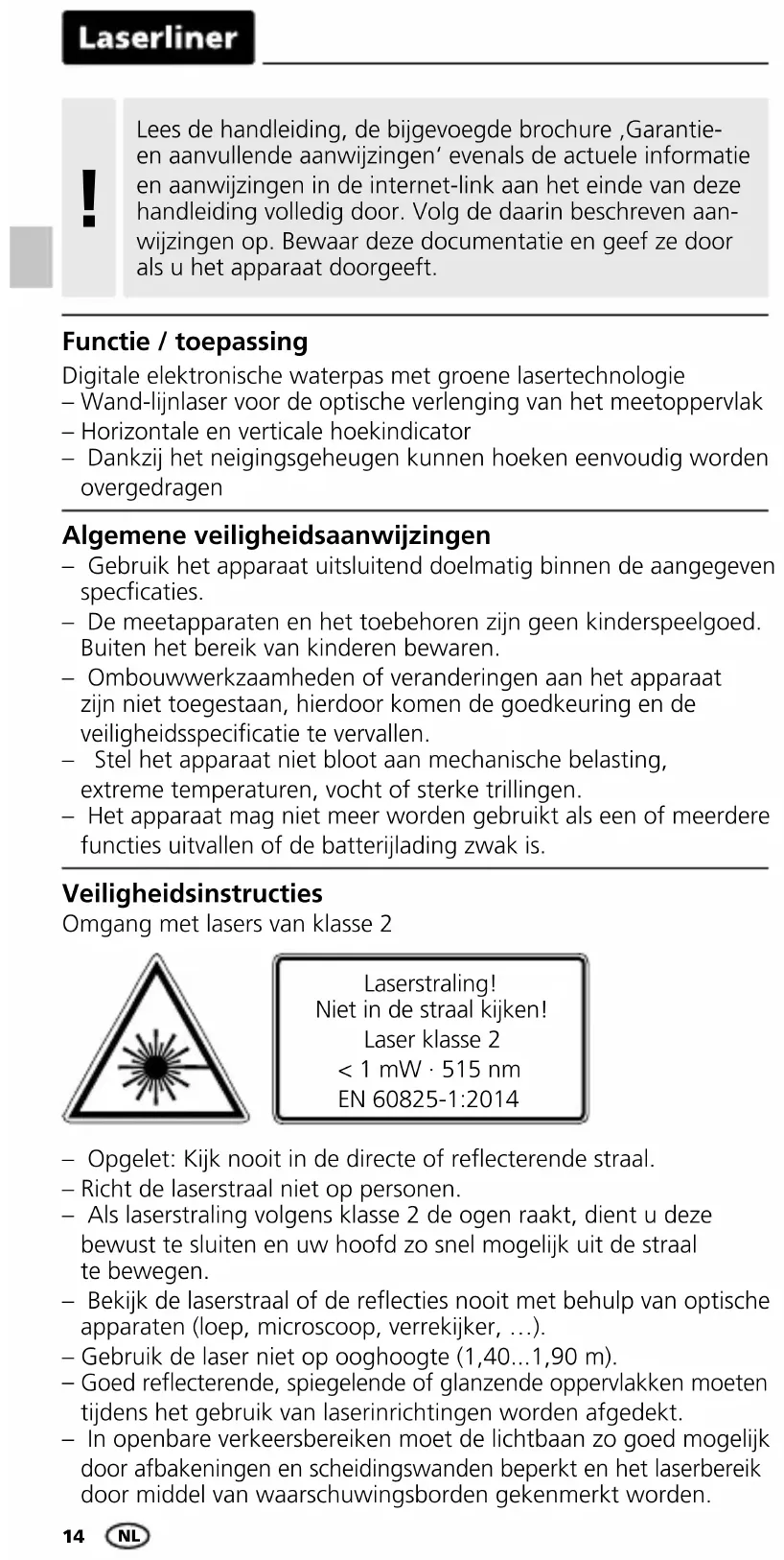 Goed reecterende, spiegelende of glanzende oppervlakken moeten tijdens het gebruik van laserinrichtingen worden afgedekt. – In openbare verkeersbereiken moet de lichtbaan zo goed mogelijk door afbakeningen en scheidingswanden beperkt en het laserbereik door middel van waarschuwingsborden gekenmerkt worden. Laserstraling! Niet in de straal kijken! Laser klasse 2 < 1 mW · 515 nm EN 60825-1:2014 Digitale elektronische waterpas met groene lasertechnologie – Wand-lijnlaser voor de optische verlenging van het meetoppervlak – Horizontale en verticale hoekindicator – Dankzij het neigingsgeheugen kunnen hoeken eenvoudig worden overgedragen Functie / toepassing Lees de handleiding, de bijgevoegde brochure ‚Garantie- en aanvullende aanwijzingen‘ evenals de actuele informatie en aanwijzingen in de internet-link aan het einde van deze handleiding volledig door. Volg de daarin beschreven aan- wijzingen op. Bewaar deze documentatie en geef ze door als u het apparaat doorgeeft.