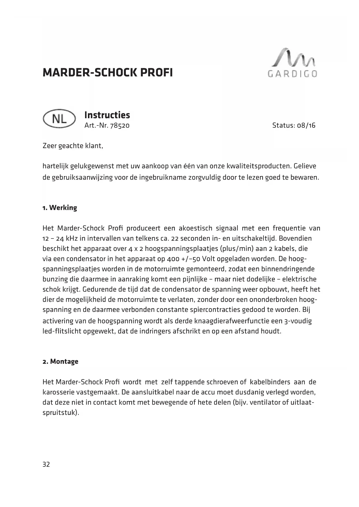 Het Marder-Schock Profi wordt met zelf tappende schroeven of kabelbinders aan de karosserie vastgemaakt. De aansluitkabel naar de accu moet dusdanig verlegd worden, dat deze niet in contact komt met bewegende of hete delen (bijv. ventilator of uitlaat- spruitstuk). MARDER-SCHOCK PROFI Status: 08/1633 Opgelet! Een contact tussen de hoogspanningsplaatjes en het chassis heeft kortsluiting tot gevolg, daardoor kan het apparaat volledig defect raken! Opgelet! De montage dient uitgevoerd te worden door geautoriseerd vak- kundig personeel! Breng de gele meegeleverde waarschuwingssticker goed zichtbaar aan in de motorru- imte (bijv. op het luchtfilterhuis of direct op de marterschok). Opgelet! Hoogspanning! Voor service-werkzaamheden in de motorruimte het toestel loskoppelen van de batterij! Minimaal 3 minuten wachten, tot de hoogspanning is afgebouwd!