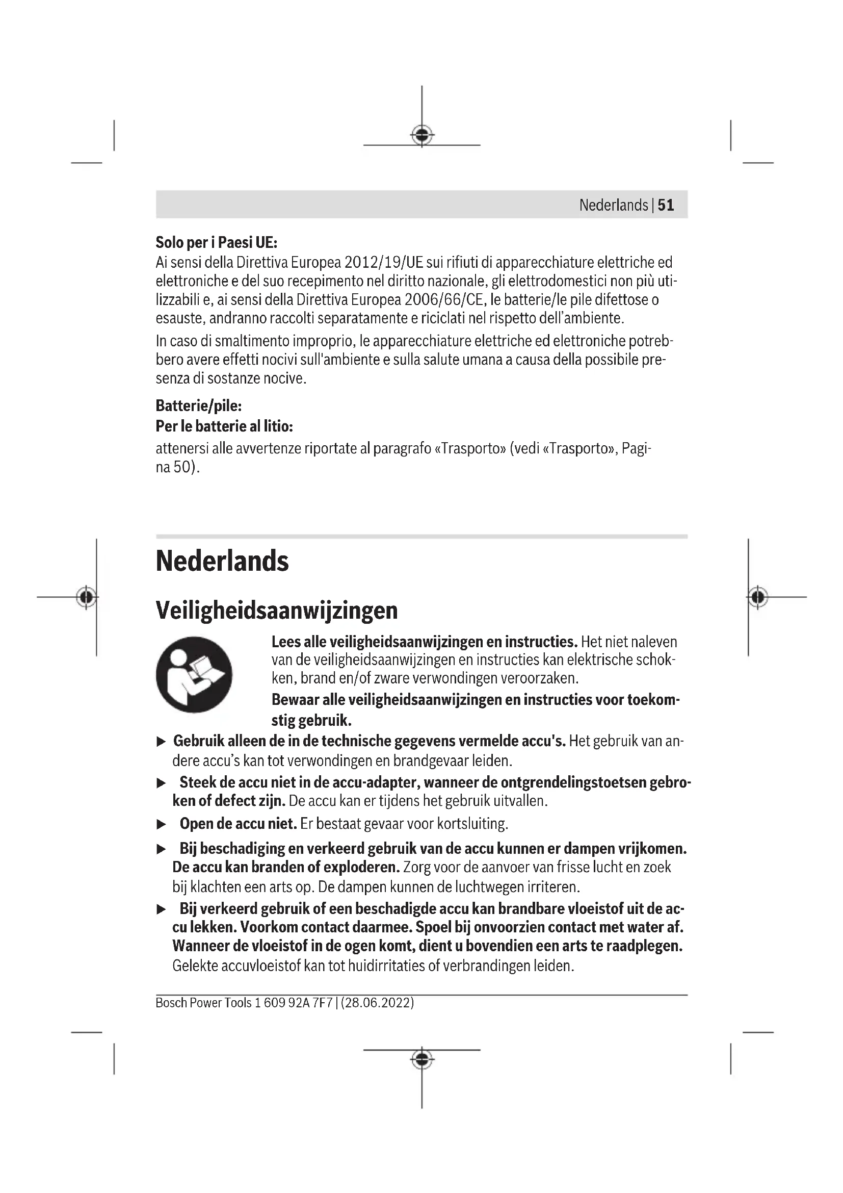 L’elemento riscaldante non si ri- scalda. Ricarica della batteria Collegare il cavo dell’elemento riscaldante alla presa(2) dell’adattatore batteria(1). Attivare l’adattatore batteria(1) mediante il tasto di accensione(5). Il capo di abbigliamento non viene riscaldato e il dispositivo USB esterno non si ricarica. Prelevare la batteria dall’adattatore. Attendere 10secondi Introdurre nuovamente la batteria nell’adattatore. A) Alcuni apparecchi USB esterni non sono ricaricabili con il presente adattatore per batteria, no- nostante i dati tecnici corrispondano. Bosch Power Tools 1 609 92A 7F7 | (28.06.2022)50 | Italiano Manutenzione ed assistenza Servizio di assistenza e consulenza tecnica Il servizio di assistenza risponde alle Vostre domande relative alla riparazione e alla ma- nutenzione del Vostro prodotto nonché concernenti i pezzi di ricambio. Disegni in vista esplosa e informazioni relative ai pezzi di ricambio sono consultabili anche sul sito www.bosch-pt.com Il team di consulenza tecnica Bosch sarà lieto di rispondere alle Vostre domande in meri- to ai nostri prodotti e accessori. In caso di richieste o di ordinazione di pezzi di ricambio, comunicare sempre il codice prodotto a 10cifre riportato sulla targhetta di fabbricazione dell’elettroutensile. Italia Tel.: (02) 3696 2314 E-Mail: pt.hotlinebosch@it.bosch.com Per ulteriori indirizzi del servizio assistenza consultare: www.bosch-pt.com/serviceaddresses Trasporto Le batterie al litio sono soggette ai requisiti di legge per le merci pericolose. Le batterie possono essere trasportate su strada tramite l’utente senza ulteriori precauzioni. In caso di spedizione tramite terzi (ad es. per via aerea o tramite spedizioniere), andran- no rispettati specifici requisiti relativi d’imballaggio e contrassegnatura. In tale caso, per la preparazione dell’articolo da spedire, andrà consultato uno specialista in merci perico- lose. Inviare le batterie soltanto se la relativa carcassa non è danneggiata. Coprire con nastro adesivo i contatti scoperti ed imballare la batteria in modo che non possa spostarsi nell’imballaggio. Andranno altresì rispettate eventuali ulteriori norme nazionali comple- mentari. Smaltimento Apparecchi elettrici, batterie/pile a stilo, accessori e confezioni non più utiliz- zabili andranno avviati ad un riciclaggio rispettoso dell’ambiente. Non gettare apparecchi elettrici, né batterie/pile a stilo, tra i rifiuti domestici. 1 609 92A 7F7 | (28.06.2022) Bosch Power ToolsNederlands | 51 Solo per i Paesi UE: Ai sensi della Direttiva Europea 2012/19/UE sui rifiuti di apparecchiature elettriche ed elettroniche e del suo recepimento nel diritto nazionale, gli elettrodomestici non più uti- lizzabili e, ai sensi della Direttiva Europea 2006/66/CE, le batterie/le pile difettose o esauste, andranno raccolti separatamente e riciclati nel rispetto dell’ambiente. In caso di smaltimento improprio, le apparecchiature elettriche ed elettroniche potreb- bero avere effetti nocivi sull'ambiente e sulla salute umana a causa della possibile pre- senza di sostanze nocive. Batterie/pile: Per le batterie al litio: attenersi alle avvertenze riportate al paragrafo «Trasporto» (vedi «Trasporto», Pagi- na50). Nederlands Veiligheidsaanwijzingen Lees alle veiligheidsaanwijzingen en instructies. Het niet naleven van de veiligheidsaanwijzingen en instructies kan elektrische schok- ken, brand en/of zware verwondingen veroorzaken. Bewaar alle veiligheidsaanwijzingen en instructies voor toekom- stig gebruik. u Gebruik alleen de in de technische gegevens vermelde accu's. Het gebruik van an- dere accu’s kan tot verwondingen en brandgevaar leiden. u Steek de accu niet in de accu-adapter, wanneer de ontgrendelingstoetsen gebro- ken of defect zijn. De accu kan er tijdens het gebruik uitvallen. u Open de accu niet. Er bestaat gevaar voor kortsluiting. u Bij beschadiging en verkeerd gebruik van de accu kunnen er dampen vrijkomen. De accu kan branden of exploderen. Zorg voor de aanvoer van frisse lucht en zoek bij klachten een arts op. De dampen kunnen de luchtwegen irriteren. u Bij verkeerd gebruik of een beschadigde accu kan brandbare vloeistof uit de ac- cu lekken. Voorkom contact daarmee. Spoel bij onvoorzien contact met water af. Wanneer de vloeistof in de ogen komt, dient u bovendien een arts te raadplegen. Gelekte accuvloeistof kan tot huidirritaties of verbrandingen leiden. Bosch Power Tools 1 609 92A 7F7 | (28.06.2022)52 | Nederlands u Door spitse voorwerpen, zoals bijv. spijkers of schroevendraaiers, of door krachtinwerking van buitenaf kan de accu beschadigd worden. Er kan een interne kortsluiting ontstaan en de accu doen branden, roken, exploderen of oververhitten. u Houd de niet-gebruikte accu uit de buurt van paperclips, munten, sleutels, spij- kers, schroeven of andere kleine metalen voorwerpen die overbrugging van de contacten zouden kunnen veroorzaken. Kortsluiting tussen de accucontacten kan brandwonden of brand tot gevolg hebben. Bescherm de accu tegen hitte, bijvoorbeeld ook tegen voortdu- rend zonlicht, vuur, vuil, water en vocht. Er bestaat gevaar voor ex- plosie en kortsluiting. Beschrijving van product en werking Lees alle veiligheidsaanwijzingen en instructies. Het niet naleven van de veiligheidsaanwijzingen en instructies kan elektrische schok- ken, brand en/of zware verwondingen veroorzaken. Neem goed nota van de afbeeldingen in het voorste deel van de ge- bruiksaanwijzing. Beoogd gebruik De accu-adapter dient voor het opnemen van een Bosch 18V Lithium-Ion-accu als span- ningsbron. Met de accu-adapter kunnen maximaal twee USB-apparaten en een verwar- mingselement voor de verwarmde jas tegelijkertijd van spanning worden voorzien. Afgebeelde componenten De componenten zijn genummerd zoals op de afbeelding van het elektrische gereed- schap op de pagina met afbeeldingen. (1) Accu-adapter (2) USB-bus (3) Bus voor aansluitstekker van het verwarmingselement van de verwarmde jas (4) Riemclip (5) Aan-toets voo
