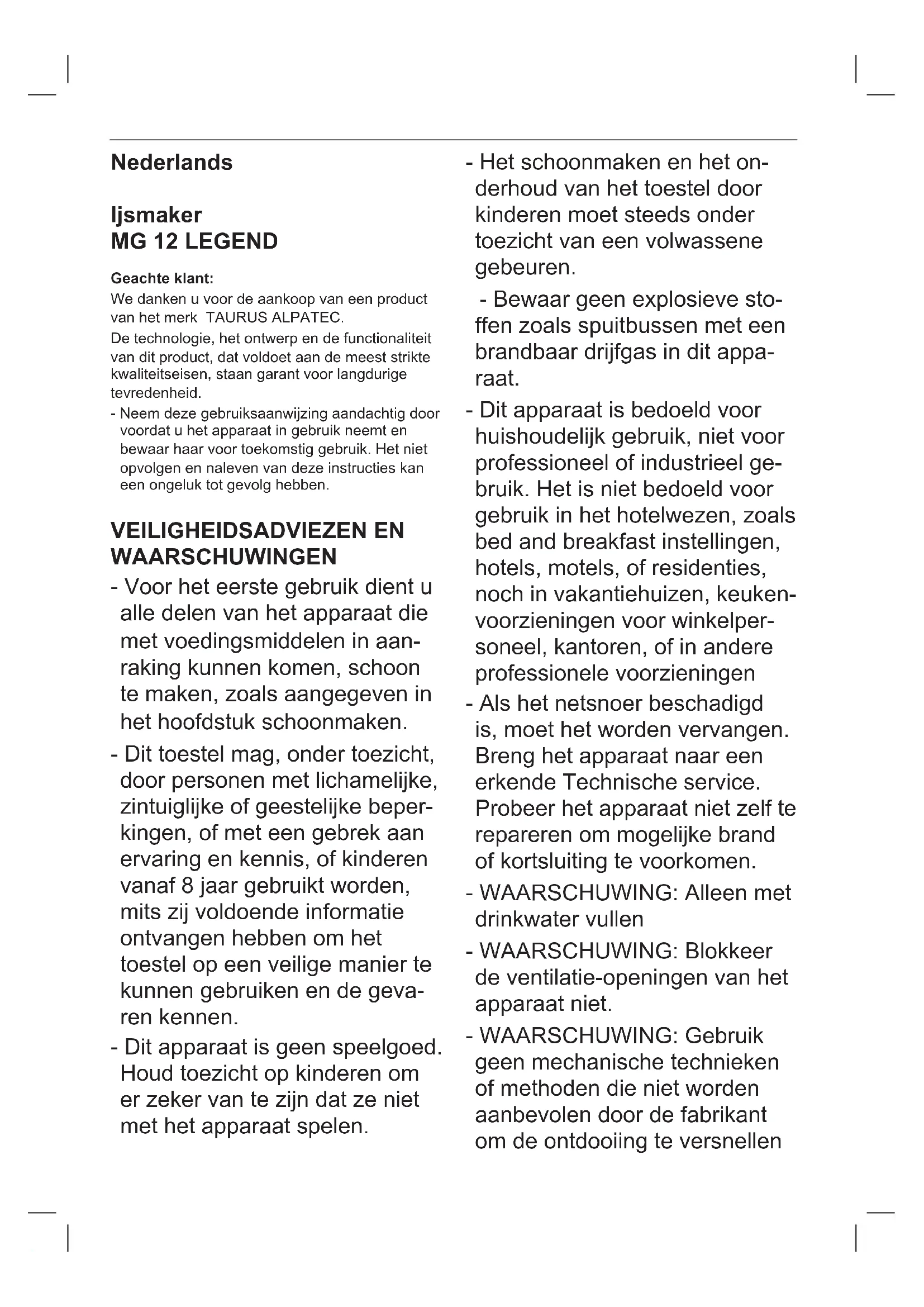 - Els materials que constitueixen l’envàs d’aquest aparell, estan integrats en un sistema de recolli- da, classicació i reciclatge d’aquests. Si desitja desfer-se d’ells, pot utilitzar els contenidors públics apropiats per a cada tipus de material. - El producte està exempt de concentracions de substàncies que es puguin considerar nocives per al medi ambient. Aquest símbol signica que si desitja desfer-se del producte, una vegada transcorreguda la vida d’aquest, ha de dipositar-lo pels mitjans adequats a les mans d’un gestor de residus autoritzat per a la recollida selectiva de Residus d’Aparells Elèctrics i Electrònics (RAEE). Aquest símbol indica que la superfície pot escalfar-se durant l’ús. Aquest aparell compleix amb la Directiva 2014/35/EU de Baixa Tensió, amb la Directiva 2014/30/EU de Compatibilitat Electromagnètica, amb la Directiva 2011/65/EU sobre restriccions a la utilització de determinades substàncies pe- rilloses en aparells elèctrics i electrònics i amb la Directiva 2009/125/EC sobre els requisits de disseny ecològic aplicable als productes relacio- nats amb l’energia.Nederlands Ijsmaker MG 12 LEGEND Geachte klant: We danken u voor de aankoop van een product van het merk TAURUS ALPATEC. De technologie, het ontwerp en de functionaliteit van dit product, dat voldoet aan de meest strikte kwaliteitseisen, staan garant voor langdurige tevredenheid. - Neem deze gebruiksaanwijzing aandachtig door voordat u het apparaat in gebruik neemt en bewaar haar voor toekomstig gebruik. Het niet opvolgen en naleven van deze instructies kan een ongeluk tot gevolg hebben. VEILIGHEIDSADVIEZEN EN WAARSCHUWINGEN - Voor het eerste gebruik dient u alle delen van het apparaat die met voedingsmiddelen in aan- raking kunnen komen, schoon te maken, zoals aangegeven in het hoofdstuk schoonmaken. - Dit toestel mag, onder toezicht, door personen met lichamelijke, zintuiglijke of geestelijke beper- kingen, of met een gebrek aan ervaring en kennis, of kinderen vanaf 8 jaar gebruikt worden, mits zij voldoende informatie ontvangen hebben om het toestel op een veilige manier te kunnen gebruiken en de geva- ren kennen. - Dit apparaat is geen speelgoed. Houd toezicht op kinderen om er zeker van te zijn dat ze niet met het apparaat spelen. - Het schoonmaken en het on- derhoud van het toestel door kinderen moet steeds onder toezicht van een volwassene gebeuren. - Bewaar geen explosieve sto- ffen zoals spuitbussen met een brandbaar drijfgas in dit appa- raat. - Dit apparaat is bedoeld voor huishoudelijk gebruik, niet voor professioneel of industrieel ge- bruik. Het is niet bedoeld voor gebruik in het hotelwezen, zoals bed and breakfast instellingen, hotels, motels, of residenties, noch in vakantiehuizen, keuken- voorzieningen voor winkelper- soneel, kantoren, of in andere professionele voorzieningen - Als het netsnoer beschadigd is, moet het worden vervangen. Breng het apparaat naar een erkende Technische service. Probeer het apparaat niet zelf te repareren om mogelijke brand of kortsluiting te voorkomen. - WAARSCHUWING: Alleen met drinkwater vullen - WAARSCHUWING: Blokkeer de ventilatie-openingen van het apparaat niet. - WAARSCHUWING: Gebruik geen mechanische technieken of methoden die niet worden aanbevolen door de fabrikant om de ontdooiing te versnellen- WAARSCHUWING: Beschadig het koelcircuit niet - WAARSCHUWING: Gebruik geen apparaten in de voedsel- compartimenten van het appa- raat, tenzij ze van het type zijn dat wordt aanbevolen door de fabrikant - Het apparaat aansluiten op een stopcontact dat minimaal 16 ampère kan leveren. - De stekker van het apparaat moet geschikt zijn voor het stopcontact. Wijzig de stekker niet. Gebruik geen adapters. - Het stroomsnoer niet forceren. Het snoer nooit gebruiken om het apparaat op te tillen, te trans- porteren of om de stekker uit het stopcontact te trekken. - Het snoer niet oprollen rond het apparaat. - Zorg ervoor dat het stroomsnoer niet gekneld of geknikt geraakt. - Zorg ervoor dat het stroomsnoer niet in contact komt met de hete oppervlakken van het appa- raat. - Controleer de staat van de elektriciteitskabel. Kapotte kabels of kabels die in de war zijn ver- groten het risico van elektrische schokken. - De stekker niet met natte handen aanraken. - Het apparaat niet gebruiken wanneer het snoer of de stekker beschadigd is. - Als één van de delen van de behuizing van het apparaat kapot gaat, het apparaat onmidde- llijk uitschakelen om elektrische schokken te vermijden. - Het apparaat niet gebruiken wanneer het geva- llen is, wanneer er zichtbare schade is, of indien het lek is. - Plaats het apparaat niet op hete oppervlakken zoals kookplaten, gasbranders, ovens of der- gelijke. - Stel het apparaat niet bloot aan direct zonlicht. - Plaats het toestel op een effen en stabiel oppervlak, ver verwijderd van warmtebronnen en water. - Bewaar of gebruik het toestel niet buitenshuis. - Het apparaat niet aan regen of vochtigheid blootstellen. Water dat in het apparaat komt vergroot het risico van een elektrische schok. GEBRUIK EN ONDERHOUD: - Rol voor gebruik het netsnoer van het apparaat volledig af. - Gebruik het apparaat niet wanneer de accessoi- res niet correct aangekoppeld zijn. - Het apparaat niet aanzetten zonder water. - Het apparaat niet gebruiken als de aan/uit-knop niet werkt. - Het apparaat niet verplaatsen terwijl het werkt. - Gebruik het apparaat niet wanneer het scheef staat en houd het niet ondersteboven. - Overschrijdt het MAX niveau niet. - Trek de stekker uit het stopcontact wanneer het apparaat niet in gebruik is en alvorens het te reinigen. - Haal de stekker uit het stopcontact alvorens het waterreservoir te vullen. - Dit apparaat is alleen bedoeld voor huishoudeli- jk gebruik, niet voor professioneel of industrieel gebruik. - Houd dit apparaat buiten bereik van kinderen en/of personen met lichamelijke, zintuiglijke of geestelijke beperkingen, of met een gebrek aan ervaring en kennis. - Het apparaat uitsluitend met 