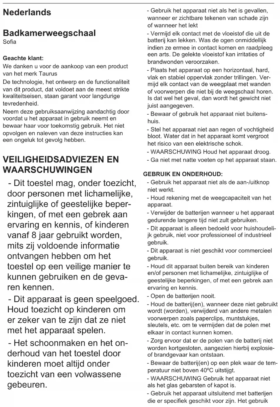 Dit symbool betekent dat u het product aan het eind van zijn levenscyclus moet afgeven aan een erkende afvalverwerker ten behoeve van de gescheiden verwerking van Afgedankte Elektrische en Elektronische Apparatuur (AEEA). Dit symbool betekent dat het product batterijen of accu’s kan bevatten die uit het product verwijderd moeten worden alvorens het product weg te werpen. Denk eraan dat de batterijen in speciaal daarvoor bestemde containers afgevoerd moeten worden. En dat ze nooit in het vuur gegooid mogen worden. Dit apparaat voldoet aan de Richtlijn 2014/30/EU aangaande Elektromagnetische Compatibiliteit en de Richtlijn 2011/65/EU aangaande restricties van het gebruik van bepaalde gevaarlijke stoffen in elektrische en elektronische apparatuur.Polski Waga łazienkowa Soa Szanowny Kliencie, Serdecznie dziękujemy za zdecydowanie się na zakup sprzętu gospodarstwa domowego marki Taurus. Jej technologia, forma i funkcjonalność, jak również fakt, że spełnia ona wszelkie normy jakości, dostarczy Państwu pełnej satysfakcji przez długi czas. Przeczytać uważnie instrukcję przed urucho- mieniem urządzenia i zachować ją w celu późniejszych konsultacji. Niedostosowanie się i nieprzestrzeganie niniejszych instrukcji może doprowadzić do wypadku.