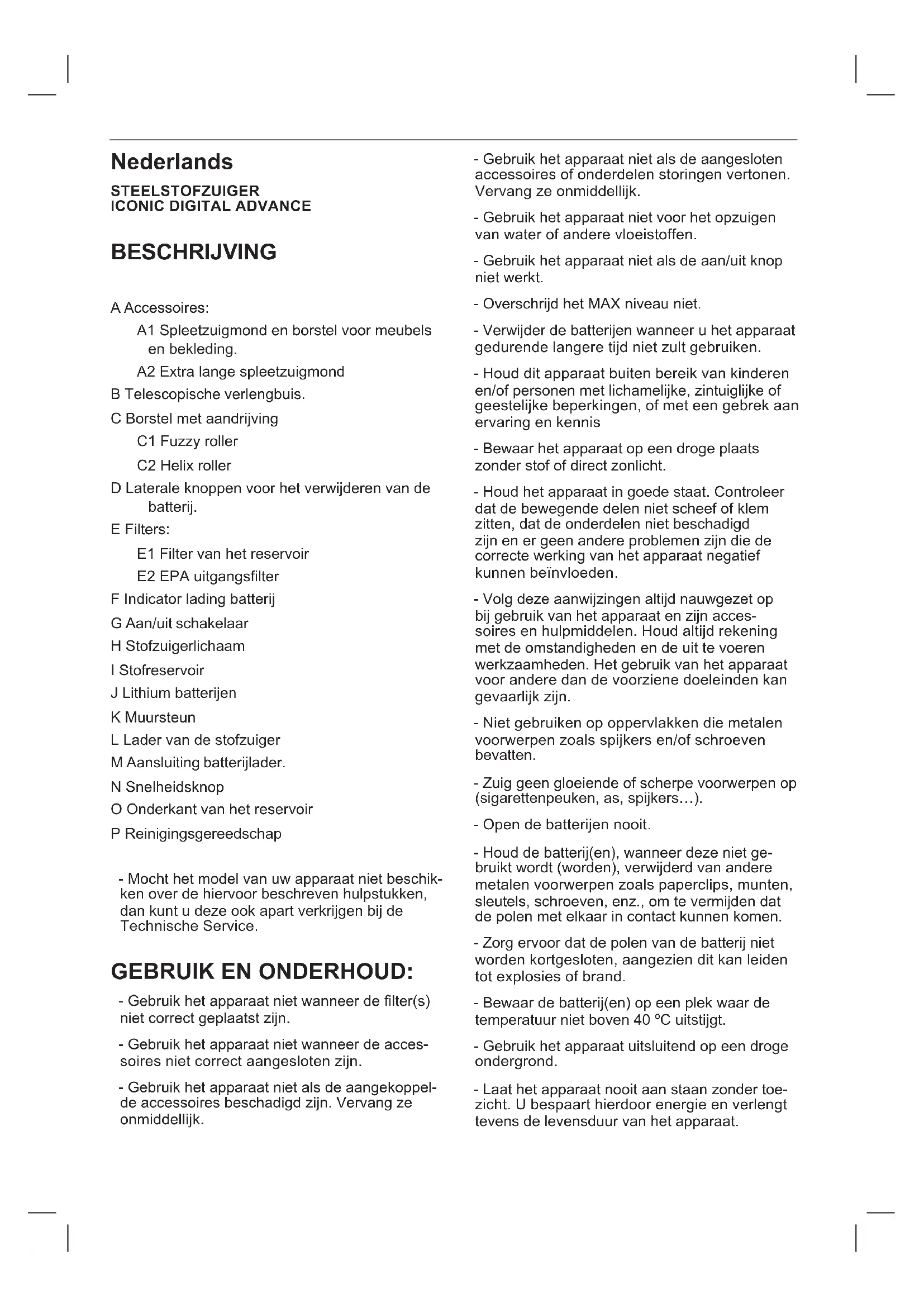 BESCHRIJVING A Accessoires: A1 Spleetzuigmond en borstel voor meubels en bekleding. A2 Extra lange spleetzuigmond B Telescopische verlengbuis. C Borstel met aandrijving C1 Fuzzy roller C2 Helix roller D Laterale knoppen voor het verwijderen van de batterij. E Filters: E1 Filter van het reservoir E2 EPA uitgangslter F Indicator lading batterij G Aan/uit schakelaar H Stofzuigerlichaam I Stofreservoir J Lithium batterijen K Muursteun L Lader van de stofzuiger M Aansluiting batterijlader. N Snelheidsknop O Onderkant van het reservoir P Reinigingsgereedschap - Mocht het model van uw apparaat niet beschik- ken over de hiervoor beschreven hulpstukken, dan kunt u deze ook apart verkrijgen bij de Technische Service. GEBRUIK EN ONDERHOUD: - Gebruik het apparaat niet wanneer de lter(s) niet correct geplaatst zijn. - Gebruik het apparaat niet wanneer de acces- soires niet correct aangesloten zijn. - Gebruik het apparaat niet als de aangekoppel- de accessoires beschadigd zijn. Vervang ze onmiddellijk. - Gebruik het apparaat niet als de aangesloten accessoires of onderdelen storingen vertonen. Vervang ze onmiddellijk. - Gebruik het apparaat niet voor het opzuigen van water of andere vloeistoffen. - Gebruik het apparaat niet als de aan/uit knop niet werkt. - Overschrijd het MAX niveau niet. - Verwijder de batterijen wanneer u het apparaat gedurende langere tijd niet zult gebruiken. - Houd dit apparaat buiten bereik van kinderen en/of personen met lichamelijke, zintuiglijke of geestelijke beperkingen, of met een gebrek aan ervaring en kennis - Bewaar het apparaat op een droge plaats zonder stof of direct zonlicht. - Houd het apparaat in goede staat. Controleer dat de bewegende delen niet scheef of klem zitten, dat de onderdelen niet beschadigd zijn en er geen andere problemen zijn die de correcte werking van het apparaat negatief kunnen beïnvloeden. - Volg deze aanwijzingen altijd nauwgezet op bij gebruik van het apparaat en zijn acces- soires en hulpmiddelen. Houd altijd rekening met de omstandigheden en de uit te voeren werkzaamheden. Het gebruik van het apparaat voor andere dan de voorziene doeleinden kan gevaarlijk zijn. - Niet gebruiken op oppervlakken die metalen voorwerpen zoals spijkers en/of schroeven bevatten. - Zuig geen gloeiende of scherpe voorwerpen op (sigarettenpeuken, as, spijkers…). - Open de batterijen nooit. - Houd de batterij(en), wanneer deze niet ge- bruikt wordt (worden), verwijderd van andere metalen voorwerpen zoals paperclips, munten, sleutels, schroeven, enz., om te vermijden dat de polen met elkaar in contact kunnen komen. - Zorg ervoor dat de polen van de batterij niet worden kortgesloten, aangezien dit kan leiden tot explosies of brand. - Bewaar de batterij(en) op een plek waar de temperatuur niet boven 40 ºC uitstijgt. - Gebruik het apparaat uitsluitend op een droge ondergrond. - Laat het apparaat nooit aan staan zonder toe- zicht. U bespaart hierdoor energie en verlengt tevens de levensduur van het apparaat.CONTROLE VAN DE LADING VAN DE BAT TERIJ: - Zet het apparaat aan met de aan/uit knop. (G) - Wanneer alle vijf controlelampjes (F) oplichten, is de batterij geheel geladen. - Wanneer er slechts één controlelampje oplicht, is de batterij bijna leeg. - Wanneer er geen enkel controlelampje oplicht, is de batterij geheel leeg. - Opmerking: Voor een maximale levensduur van de batterij bevelen we aan de batterij pas op te laden als zij geheel ontladen is.
