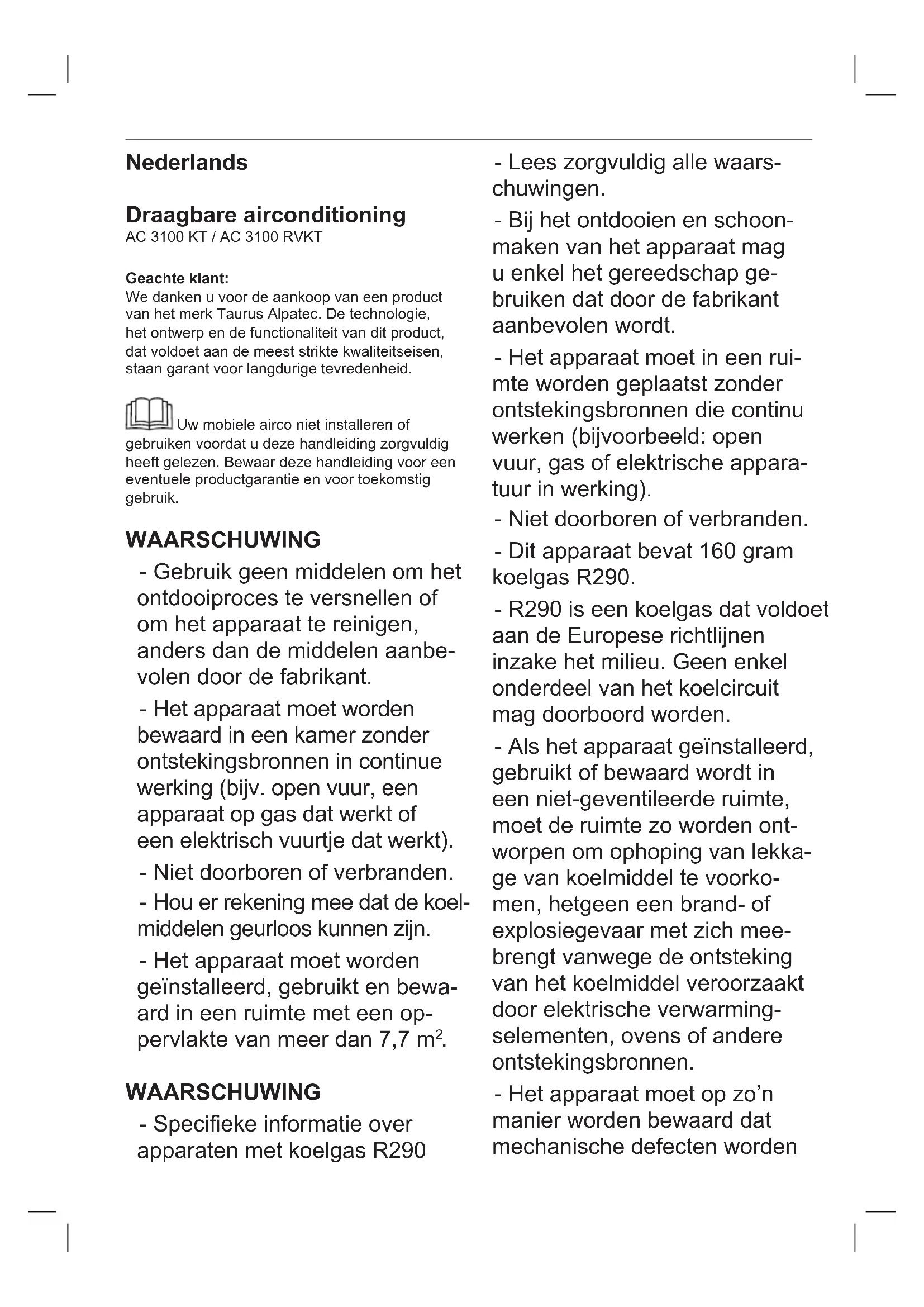 Geachte klant: We danken u voor de aankoop van een product van het merk Taurus Alpatec. De technologie, het ontwerp en de functionaliteit van dit product, dat voldoet aan de meest strikte kwaliteitseisen, staan garant voor langdurige tevredenheid. Uw mobiele airco niet installeren of gebruiken voordat u deze handleiding zorgvuldig heeft gelezen. Bewaar deze handleiding voor een eventuele productgarantie en voor toekomstig gebruik. WAARSCHUWING - Gebruik geen middelen om het ontdooiproces te versnellen of om het apparaat te reinigen, anders dan de middelen aanbe- volen door de fabrikant. - Het apparaat moet worden bewaard in een kamer zonder ontstekingsbronnen in continue werking (bijv. open vuur, een apparaat op gas dat werkt of een elektrisch vuurtje dat werkt). - Niet doorboren of verbranden. - Hou er rekening mee dat de koel- middelen geurloos kunnen zijn. - Het apparaat moet worden geïnstalleerd, gebruikt en bewa- ard in een ruimte met een op- pervlakte van meer dan 7,7 m