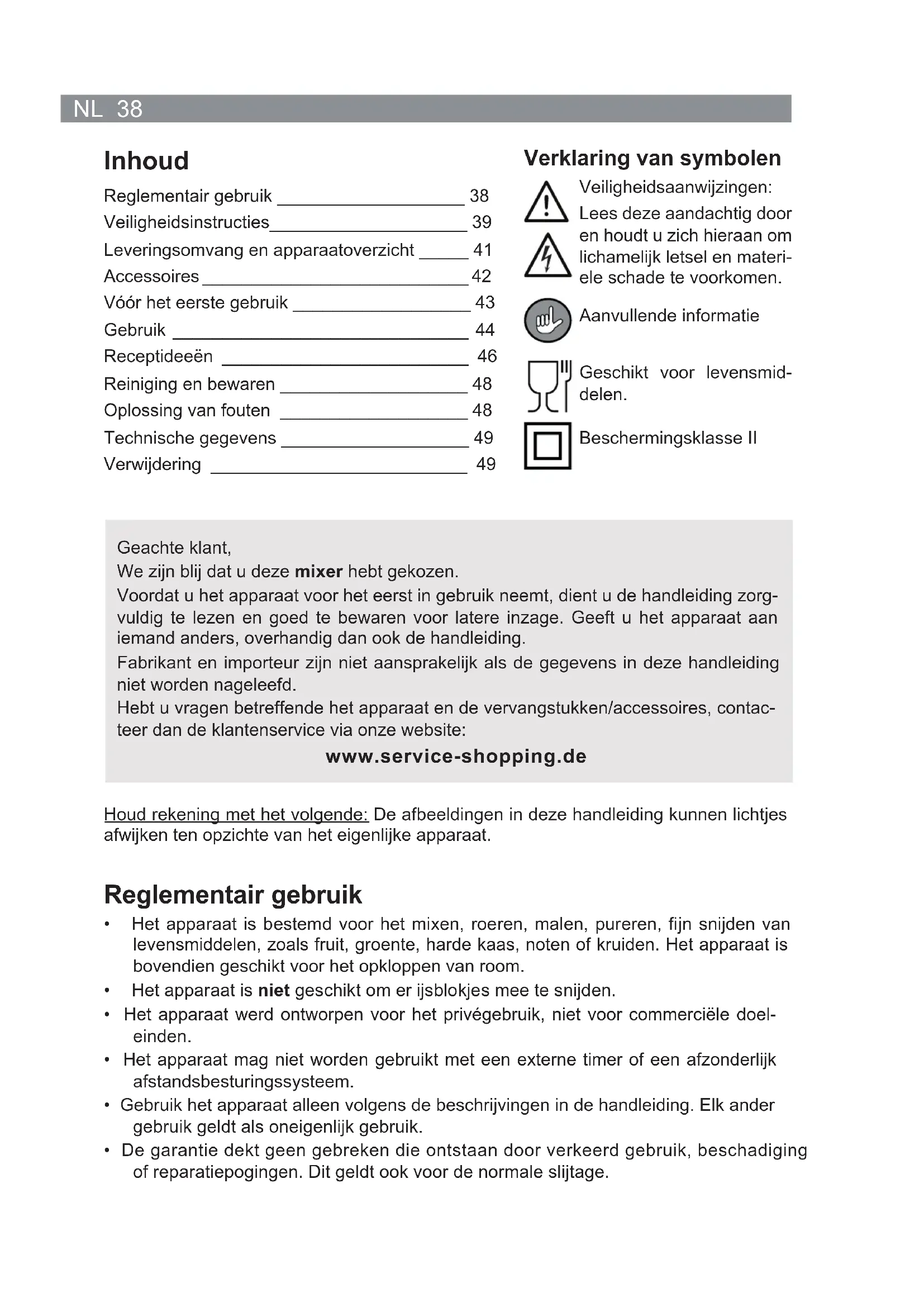 - De garantie dekt geen gebreken die ontstaan door verkeerd gebruik, beschadiging of reparatiepogingen. Dit geldt ook voor de normale slijtage. Verklaring van symbolen Veiligheidsaanwijzingen: Lees deze aandachtig door en houdt u zich hieraan om lichamelijk letsel en materi- ele schade te voorkomen. Aanvullende informatie Geschikt voor levensmid- delen. Beschermingsklasse II Geachte klant, We zijn blij dat u deze mixer hebt gekozen. Voordat u het apparaat voor het eerst in gebruik neemt, dient u de handleiding zorg- vuldig te lezen en goed te bewaren voor latere inzage. Geeft u het apparaat aan iemand anders, overhandig dan ook de handleiding. Fabrikant en importeur zijn niet aansprakelijk als de gegevens in deze handleiding niet worden nageleefd. Hebt u vragen betreffende het apparaat en de vervangstukken/accessoires, contac- teer dan de klantenservice via onze website: www.service-shopping.de39 NL Veiligheidsinstructies ■ Dit apparaat mag door personen met beperkte fysieke, senso- rische of mentale vaardigheden of een gebrek aan ervaring en/ of kennis worden gebruikt als ze onder toezicht staan of over het veilig gebruik van het apparaat werden geïnformeerd en de daaruit voortvloeiende gevaren hebben begrepen. Kinderen mo- gen niet met het apparaat spelen. ■ Kinderen en dieren moeten uit de buurt worden gehouden van het apparaat en het aansluitsnoer! Bewaar het apparaat op een voor kinderen en dieren ontoegankelijke plaats! ■ Het apparaat moet steeds van het elektriciteitsnet worden losge- koppeld als er geen toezicht is en voor de montage, demontage en reiniging. ■ Wanneer het apparaat, het aansluitsnoer of de stekker van het apparaat is beschadigd, moet deze door de fabrikant of klanten- service of een soortgelijk gekwalifi ceerde persoon (b. v. service- werkplaats) worden vervangen, om gevaren te voorkomen. Verwondingsgevaren ■ Verstikkingsgevaar! Houd kinderen en dieren weg van het verpakkingsmateriaal. ■ Gevaar voor verwondingen door scherpe snijbladen! De snijbladen zijn scherp! Wees voorzichtig in de hantering met het accessoire met dwarse snijbladen, zodat snijwonden worden vermeden. ■ Grijp nooit in de mengkom, wanneer het apparaat is ingeschakeld en houd uw haar en kleding uit de buurt! Gebruik voor het aanduwen van ingrediënten de meegele- verde stopper. ■ Verbrandingsgevaar! Vul het apparaat nooit met hete levensmiddelen of vloeistoffen! De inhoud mag niet warmer zijn dan 50 °C. ■ Zorg ervoor dat uw werkvlak steeds goed verlicht is, als u het apparaat gebruikt. ■ Let erop, dat niemand over het aangesloten stroomsnoer kan struikelen. Laat het snoer niet over de rand van tafels of aanrechten hangen. Er zou iemand achter kun- nen blijven hangen en het apparaat naar beneden kunnen trekken. Elektrocutie- en brandgevaar ■ Gebruik het apparaat alleen in gesloten ruimten. ■ Plaats het apparaat altijd op een droge, effen en vaste ondergrond. ■ Bewaar voldoende afstand tot andere warmtebronnen zoals kookplaten of ovens. ■ Bedek het apparaat nooit met doeken of dergelijke. Er bestaat gevaar voor verwon- dingen!NL 40 ■ Plaats het apparaat niet in de buurt van licht ontvlambare materialen (gordijnen, textiel etc.). ■ Leg geen licht ontvlambare voorwerpen, zoals papier, karton of kunststof in of op het apparaat. ■ Dompel de motoreenheid nooit in water of andere vloeistoffen onder! Zorg ervoor dat de motoreenheid, het snoer of de stekker niet in het water kunnen vallen of nat kunnen worden. ■ Valt de motoreenheid in het water, onderbreek dan meteen de stroomtoevoer. ■ Raak de motoreenheid, het snoer of de stekker nooit met vochtige handen aan. ■ Sluit het apparaat alleen aan op een stopcontact dat reglementair is geïnstalleerd en dat overeenstemt met de technische gegevens van het apparaat. (zie hoofdstuk “Technische gegevens”). ■ Plaats het snoer zodanig, dat het niet geklemd of geplooid wordt en niet in aanraking komt met hete oppervlakken. ■ Trek de stekker uit het stopcontact, als er tijdens het gebruik een fout optreedt of voor een onweer. ■ Als u de stekker uit het stopcontact wilt trekken, trek dan steeds aan de stekker en nooit aan het snoer. Vermijden van materiële schade en schade aan het apparaat ■ Kijk het apparaat voor elk ingebruikneming na op beschadigingen. Als de motoreen- heid, de accessoires, het netsnoer of de stekker zichtbare schade vertonen, mag het apparaat niet worden gebruikt. Probeer niet het apparaat eigenhandig te repareren of het snoer resp. de stekker te vervangen. Contacteer in geval van schade de klan- tenservice. ■ Controleer voor elke ingebruikneming of het apparaat schoon en droog is en ook correct is gemonteerd en afgesloten. ■ Gebruik het apparaat uitsluitend wanneer het volledig is gemonteerd, onbeschadigd is en goed functioneert! ■ Zet de stoel altijd op een droge, vlakke en stevige ondergrond. ■ Gebruik geen bijkomende accessoires. Gebruik alleen de meegeleverde onderde- len van de producent. ■ Laat de motor niet draaien als het apparaat leeg is. ■ Houd de motoreenheid tijdens de bereiding altijd vast met één hand. ■ Gebruik het apparaat maximaal 1 minuut zonder onderbreking. Aansluitend moet het apparaat 2 minuten afkoelen. ■ Maak de bekers en de mengkom niet te vol. Vul de grote beker en de mengkom slechts tot de MAX-markering. Vul de kleine beker slechts tot driekwart met levens- middelen. ■ Houd de deksel van de mengkom tijdens de bereiding altijd gesloten. Voor het vullen van ingrediënten kan het inzetstuk in het midden van de deksel worden verwijderd. ■ Druk de vulgoederen niet met geweld in de mengkom. ■ Het apparaat mag in ingeschakelde toestand niet worden getransporteerd. Trek steeds de stekker uit het stopcontact en laat de motor volledig tot stilstand komen, alvorens het apparaat te bewegen. ■ Laat het apparaat niet vallen en stel het niet bloot aan hevige schokken.41 NL ■ Stel het apparaat niet bloot aan extreme temperaturen, hevige temperatuurschom- 