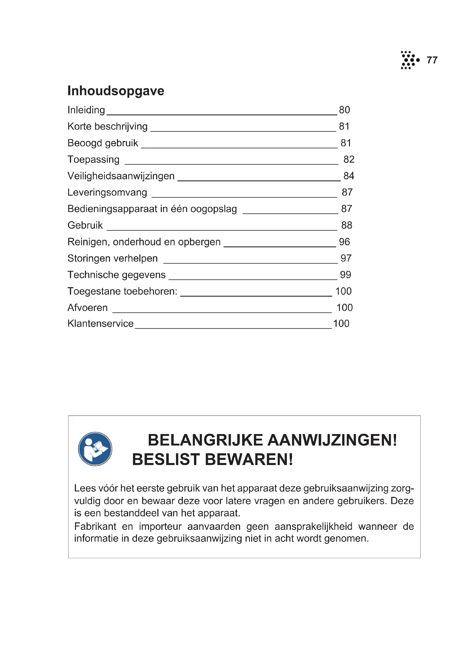 is bedoeld voor particulier gebruik. Gebruik het artikel uitsluitend zoals beschreven in de handleiding. Elk ander gebruik geldt als niet-doelmatig. Alle gebreken die zijn terug te voeren op ondeskundige behandeling, bescha- diging of reparatiepogingen, zijn uitgesloten van de garantie. Dit geldt ook voor de normale slijtage.82 Toepassing De is zo ontworpen dat een gebruiker niet hoeft te beschikken over speciale kennis of vaardigheden.