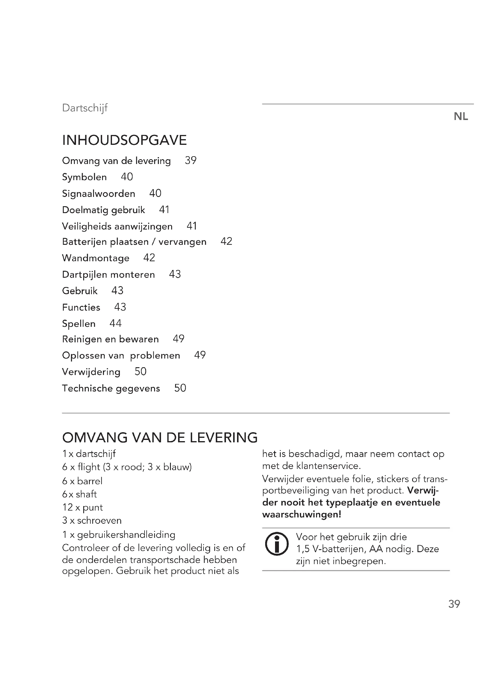 INHOUDSOPGAVE Omvang van de levering 39 Symbolen 40 Signaalwoorden 40 Doelmatig gebruik 41 Veiligheids aanwijzingen 41 Batterijen plaatsen / vervangen 42 Wandmontage 42 Dartpijlen monteren 43 Gebruik 43 Functies 43 Spellen 44 Reinigen en bewaren 49 Oplossen van problemen 49 Verwijdering 50 Technische gegevens 50