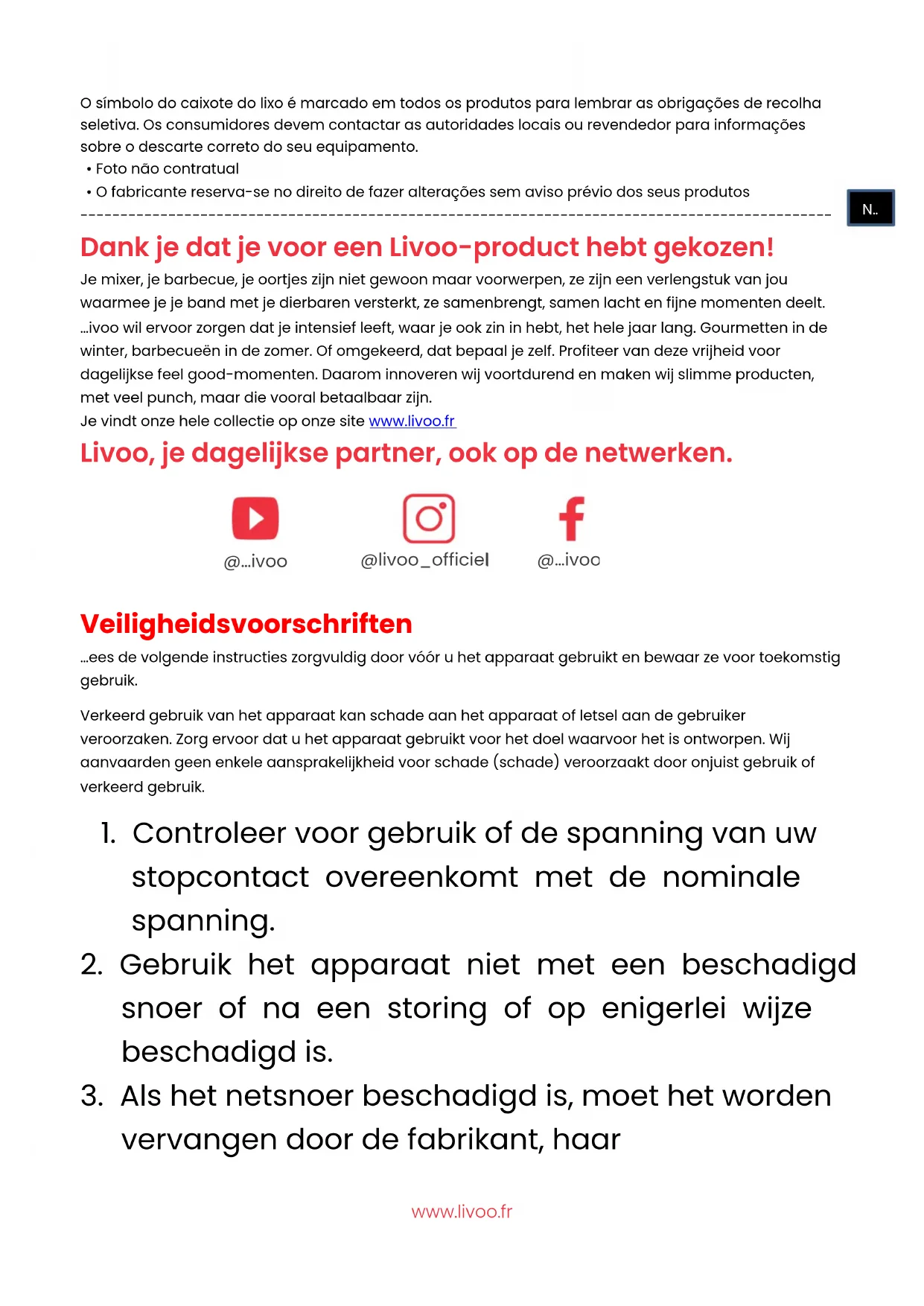 Dank je dat je voor een Livoo-product hebt gekozen! Je mixer, je barbecue, je oortjes zijn niet gewoon maar voorwerpen, ze zijn een verlengstuk van jou waarmee je je band met je dierbaren versterkt, ze samenbrengt, samen lacht en fijne momenten deelt. Livoo wil ervoor zorgen dat je intensief leeft, waar je ook zin in hebt, het hele jaar lang. Gourmetten in de winter, barbecueën in de zomer. Of omgekeerd, dat bepaal je zelf. Profiteer van deze vrijheid voor dagelijkse feel good-momenten. Daarom innoveren wij voortdurend en maken wij slimme producten, met veel punch, maar die vooral betaalbaar zijn. Je vindt onze hele collectie op onze site www.livoo.fr Livoo, je dagelijkse partner, ook op de netwerken.