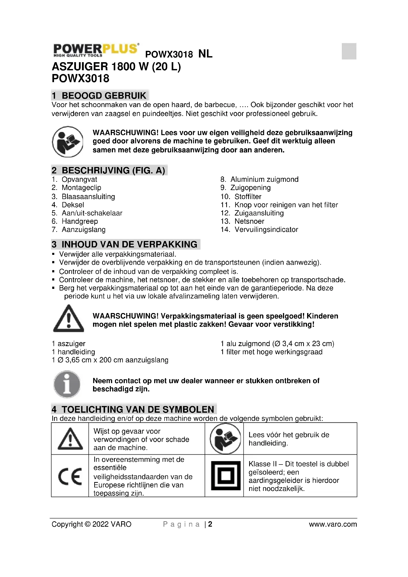 Copyright © 2022 VARO P a g i n a | 2 www.varo.com ASZUIGER 1800 W (20 L) POWX3018 1 BEOOGD GEBRUIK Voor het schoonmaken van de open haard, de barbecue, …. Ook bijzonder geschikt voor het verwijderen van zaagsel en puindeeltjes. Niet geschikt voor professioneel gebruik. WAARSCHUWING! Lees voor uw eigen veiligheid deze gebruiksaanwijzing goed door alvorens de machine te gebruiken. Geef dit werktuig alleen samen met deze gebruiksaanwijzing door aan anderen. 2 BESCHRIJVING (FIG. A)