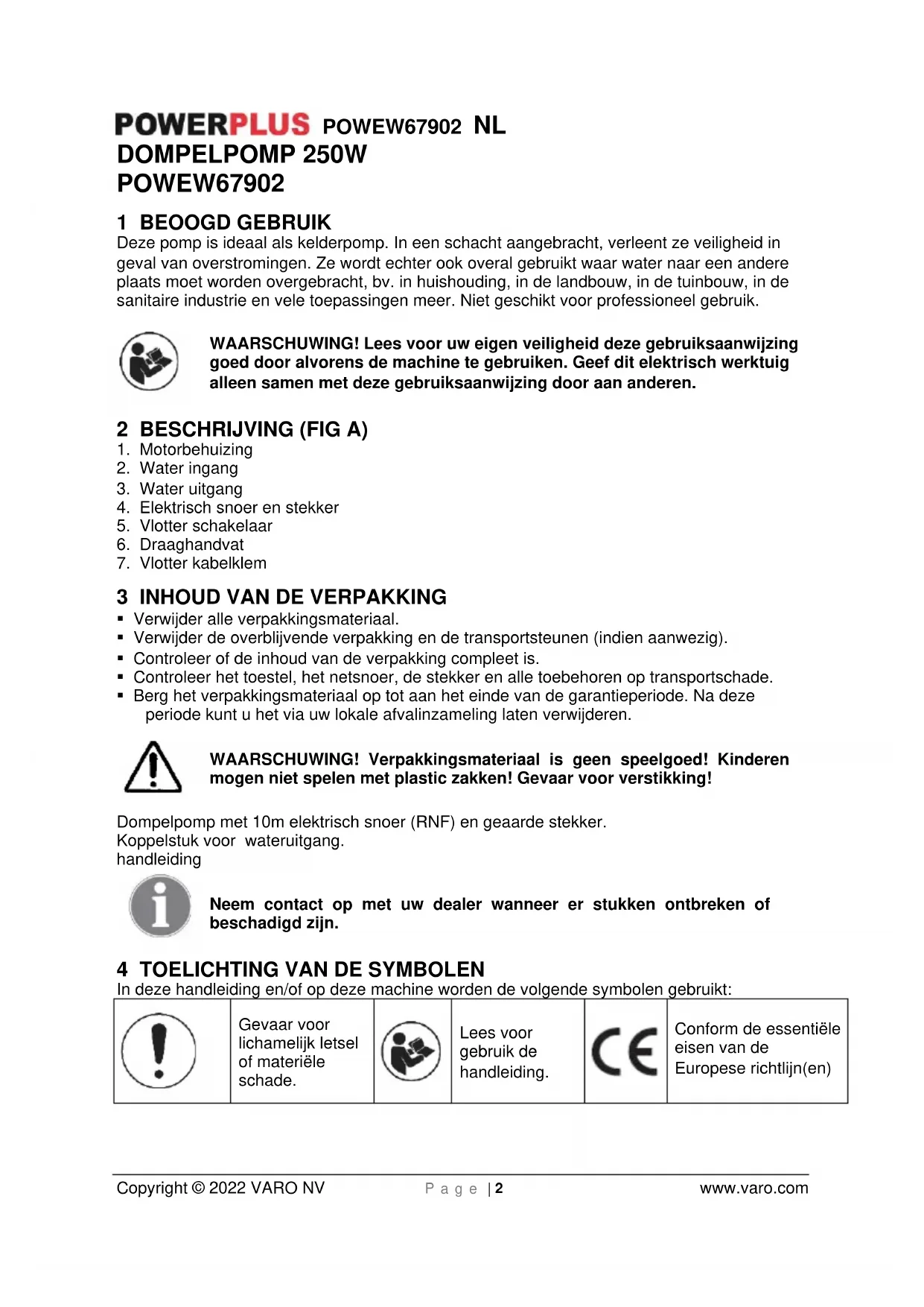 - Let bij het afstellen van de vlotterschakelaar erop dat de vlotterschakelaar niet de grond raakt vóór de pomp uitgeschakeld wordt. Opgelet! Gevaar van drooglopen. Dit toestel is niet geschikt om gebruikt te worden door kinderen en door personen waarvan de lichamelijke, de zintuiglijke of de psychische capaciteiten verminderd zijn of door personen onthouden van ervaring of kennis, behalve als deze personen genieten door middel van een persoon verantwoordelijk voor hun veiligheid, een toezicht of door voorafgaande voorschriften betreffende het gebruik van het toestelPOWEW67902 NL Copyright © 2022 VARO NV P a g e | 5 www.varo.com